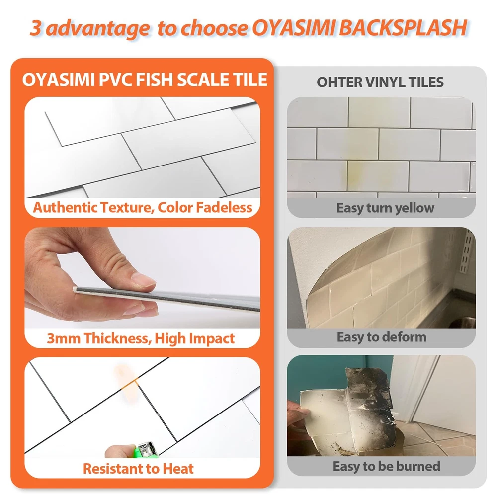 Used widely in house decoration This stainless steel backsplash is used widely for house decoration(kitchen backsplash,bathroom,wall,house decor even for bill board) Just "Peel and Stick" You shall peel off the backing stickers then stick it on the clean and smooth surface without any techical tools cutting the tiles.So you can save your time and money on labor. If there is a need to cut to fit in, use utility knife, just following the seam between the individual pieces. But if you need to cut through the pieces, please use the extermely sharp knife or industrial scissors. Grease can be clean up Used for kitchen blacksplash, grease can be clean up.It's light and solid, easy to install and clean off, resists heat and moisture. 10 Sheets in a safe packing There are 10 sheets in a box with foam bag, covering 10 square feet. Warning: The sticker is strong,once you stick it on the wall or any surface,it won't be easy to peel it off. Please keep the wall surface clean and smooth before sticking, moreover, it can not always suit to the wall which is uneven. 【𝗧𝗶𝗺𝗲𝗹𝗲𝘀𝘀 𝗖𝗹𝗮𝘀𝘀𝗶𝗰 𝗗𝗲𝘀𝗶𝗴𝗻】Classic Pure White Subway Tile Design.The peel and stick subway tile with a semi-gloss finish balance a matte finish and a high-gloss look,which is a great way to add a touch of sophistication to any kitchen or decor place, without being too flashy. At the same time, this finishs is more resistant to fingerprints and dirt than gloss finishes. 【𝗣𝗿𝗶𝗺𝗲 𝗣𝗲𝗿𝗳𝗼𝗿𝗺𝗮𝗻𝗰𝗲】Our peel and stick backsplash is made of stone plastic composite material. Thicker and more durable than peel and stick vinyl tiles and wall pannel. Also the backsplash tiles offers perfect performance with waterproof and heat-resistant properties,scratch and dust resistant surfaces, color fadeless, and strong adhesive for long-lasting attachment. 【𝗨𝘀𝗲𝗿-𝗙𝗿𝗶𝗲𝗻𝗱𝗹𝘆 𝗜𝗻𝘀𝘁𝗮𝗹𝗹𝗮𝘁𝗶𝗼𝗻】The backsplash tile Installation is quick, requiring no grouting, no special tools or skills, allowing you to update your space in a fraction of the time compared to conventional tiling methods. 【𝗙𝗹𝗲𝘅𝗶𝗮𝗯𝗹𝗲 𝗛𝗼𝗺𝗲 𝗘𝗻𝗵𝗮𝗻𝗰𝗲𝗺𝗲𝗻𝘁】Perfect for kitchen backsplashes, bathrooms, laundry rooms, RVs, campers, pantries, fireplaces, living room walls, and beyond, self adhensive wall tiles will infuse elegance and style into every nook and cranny of your home. 【𝗦𝗶𝘇𝗲 & 𝗣𝗮𝗰𝗸𝗮𝗴𝗲】Each tile is 12''x12''x0.16'', and each package contains 𝟭𝟬 𝗽𝗶𝗲𝗰𝗲𝘀, with a total area of 𝟵.𝟳 𝘀𝗾𝘂𝗮𝗿𝗲 𝗳𝗲𝗲𝘁. We always recommend taking 5~10% more for installation losses concern.