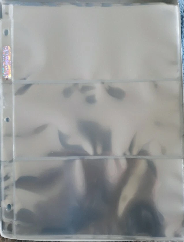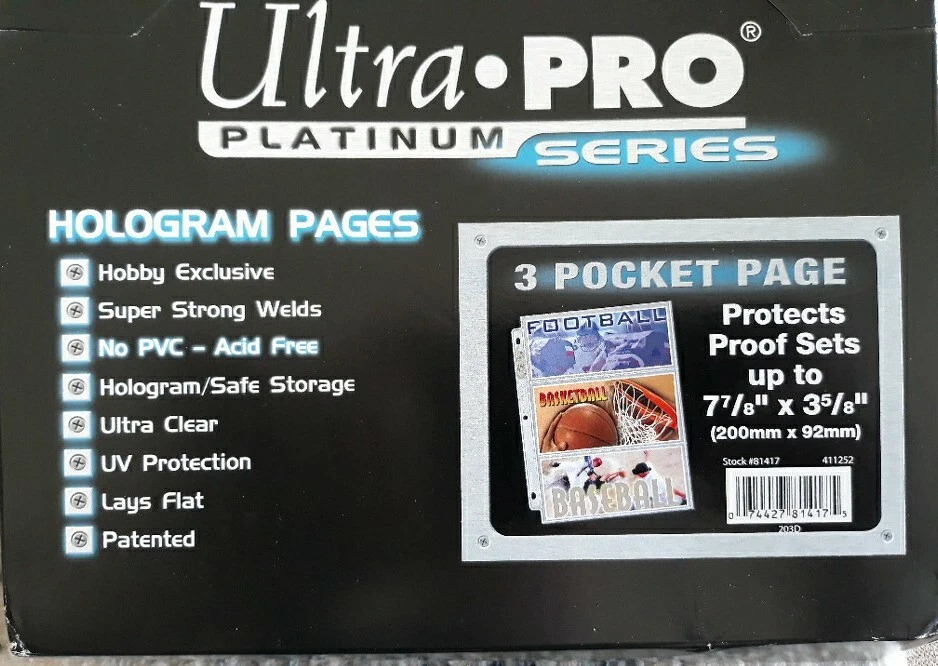 These Ultra PRO Platinum Hologram Series 3-Ring Binder Pages are suited for banknotes, proof sets, small envelopes and anything size 7 7/8" × 3 5/8" and are a must-have for any collector. You are bidding on ten (10) Ultra Pro 3-Pocket Platinum Album Pages that can hold up to 30 items. The clear pockets provide an easy view of yout collectibles and protect them from damage. They are perfect for organizing your collection. The pages are heavy-duty construction and are suitable for all your collecting needs. They are perfect for long-term storage and display of your collectibles. Shipped USPS First Class Mail. US shipping only (M,W,F) (0624)