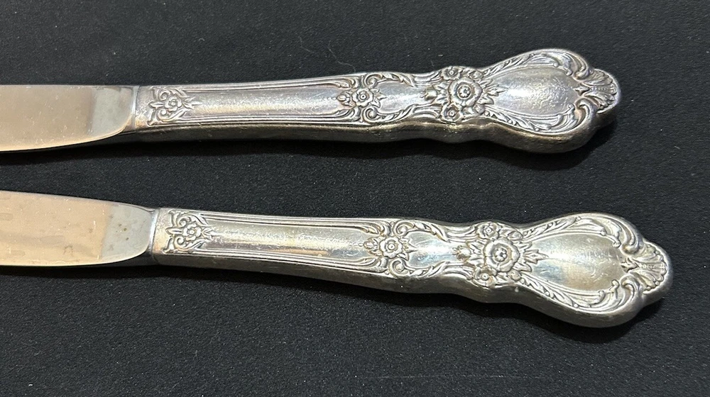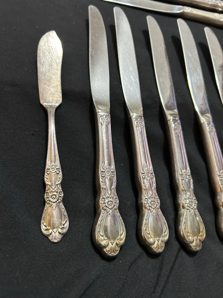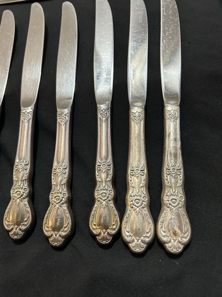 10 Vtg 1847 Rogers Bros Silver Plate Heritage Dinner Knives 9” & 1 Butter Knife Good used condition. Normal signs of wear and tear, minor scuffs and scratches. There is patina throughout. Please study pictures carefully before purchasing Feel free to ask any questions. Thank you for visiting our store! Bag5B
