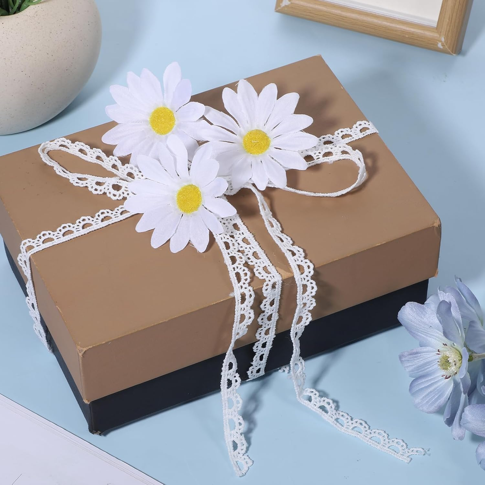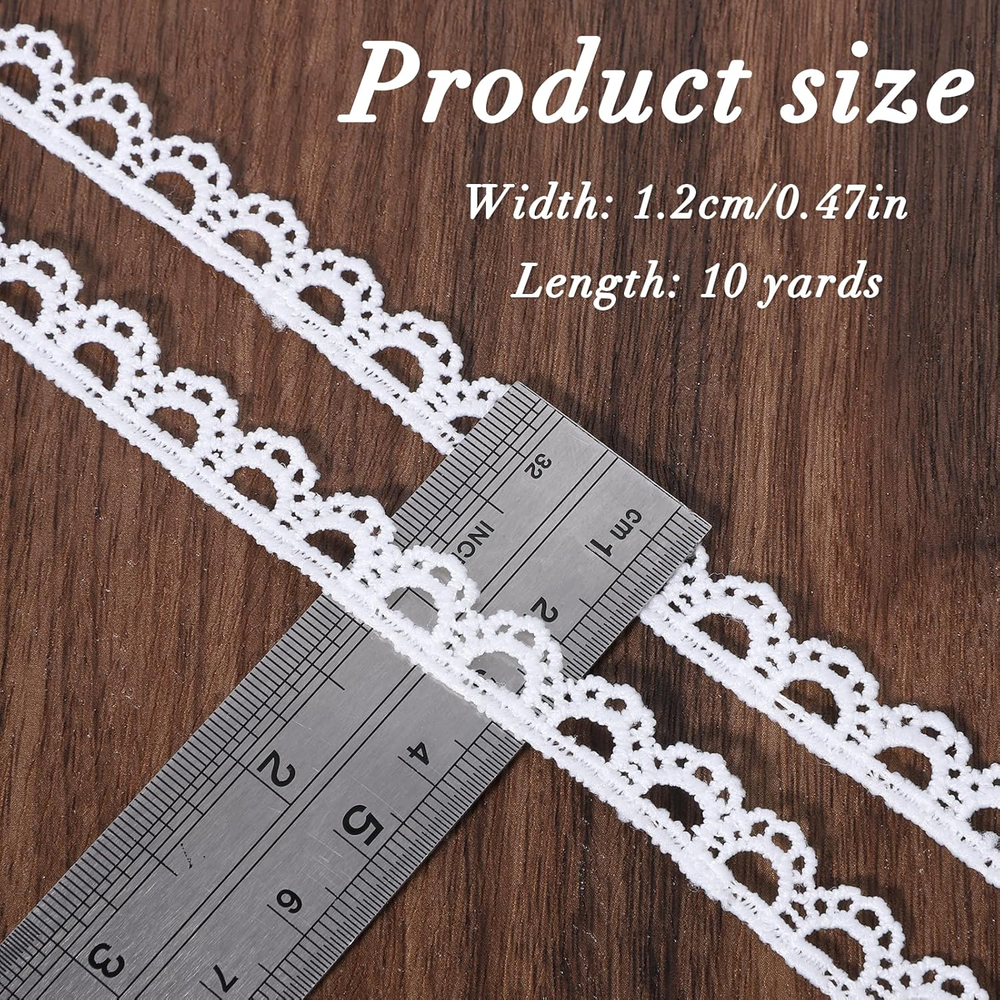 Product Description: Add a touch of elegance and vintage charm to your DIY projects with this 10-yard white lace trim . Featuring a delicate crochet scalloped edge and hollow design, this lace ribbon is perfect for sewing, embroidery, gift wrapping, weddings, and craft decorations . Crafted from durable polyester , the lace trim is soft, breathable, and long-lasting , making it ideal for repeated use in crafts, bouquets, tablecloths, headpieces, hats, or garment embellishments . Its 1/2-inch (1.2 cm) width ensures versatile application while maintaining a refined and delicate appearance . Whether decorating gifts, creating personalized wedding décor, or adding intricate details to your sewing projects, this white crochet lace trim elevates any design with a timeless vintage aesthetic . Key Features Elegant Vintage Design – Delicate scalloped crochet pattern adds sophistication to projects. Premium Material – Made of durable polyester, soft, breathable, and long-lasting. Perfect Size – 1/2 inch (1.2 cm) wide and 10 yards long for versatile crafting. Easy to Use – Cut to desired length or shape for DIY crafts, gift wrapping, or sewing. Wide Application – Ideal for sewing, bridal décor, bouquets, tablecloths, headpieces, and hats. Craft & Decor Ready – Adds charm to gifts, wedding decorations, and personalized projects. High-Quality Finish – Maintains shape and elegance for professional-looking results. Product Details Color: White Material: Polyester Width: 1/2 inch (1.2 cm) Length: 10 yards Weight: 40g Packing List: 10 yards of lace trim Frequently Asked Questions (FAQs) 1. What is the length of this lace trim? The lace ribbon is 10 yards (30 feet) long, suitable for multiple projects. 2. What is the width of the lace? The trim is 1/2 inch (1.2 cm) wide. 3. What material is this lace made of? It is made from durable, soft, and breathable polyester. 4. Can I cut this lace to size? Yes, it can be easily cut to your desired length or shape. 5. Is it suitable for sewing projects? Absolutely, perfect for embellishing garments, tablecloths, or hats. 6. Can I use this for wedding decorations? Yes, ideal for bouquets, gift wrapping, headpieces, and wedding décor. 7. Is the lace durable? Yes, the polyester material ensures long-lasting use and maintains its shape. 8. Can it be used for craft projects? Yes, it is perfect for DIY crafts, scrapbooking, and personalized designs. 9. Is the lace soft and flexible? Yes, it is soft, breathable, and easy to work with. 10. Can it be combined with other decorations? Yes, it works beautifully with ribbons, flowers, beads, and other decorative elements. 11. How many yards are included? The package contains a total of 10 yards of lace trim. 12. Is the lace vintage style? Yes, it features a classic crocheted scalloped edge for a timeless, elegant look.