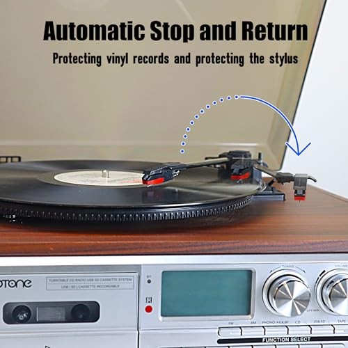 Return Policy Fast Delivery Trusted seller 10 in 1 Vinyl Record Player 3 Speed Bluetooth Vintage Automatic Turntable CD Cassette Player AM/FM Radio USB Recorder Aux-in RCA Line-Out (Silver) Product Description 33, 45, 78 RPM speed options. Includes a 45 adapter to play 7” LP.Automatically pause and stop,protect your vinyl when all the music ending. The dust cover prevents dust from accumulating on vinyl records. Built-in 2 high quality speakers, the maximum total power of the speakers were 20W , with amplifiers processing audio output, this wood record player sounds amazingly richer and louder without any distortion. Headphone jack makes you enjoy yourself in your music world.RCA line out could add your an amplifier or active speaker to improve the sound. This turntable player includes CD player, cassette player, FM AM Radio, USB SD MMC player.A variety of players can meet your various requirements. The versatile design saves you space and money without having to buy other playback devices. Wireless Connection: Bluetooth can connect your mobile phone, tablet, mp3 player, computer and other Bluetooth devices to play your favorite music. Wired Connection: The Aux in jack makes this turntable player connect your music player more quickly and easily. Recording vinyl to MP3 or cassette, let you have more ways to listen to your vinyl record. Blue LED light display makes you to view the working situation in any mode more easily. Including remote control,Make it easier to control the record player. You can remotely control mute, play / pause music, switch modes, and so on. Automatically stop and return to protect your stylus and record. The turntable also features three springs to form an anti vibration turntable, making your vinyl record playback smoother Shipping Returns Payment Shipping Shipping is FREE to all addresses other than APO/PO boxes in the lower 48 states. All our stock ships from US-based warehouses. Shipped via USPS or UPS (depending on location and package weight) Unless stated otherwise, all orders will ship within 24-72 hours of your payment being processed. Check our feedback to see the great reviews of FAST shipping we offer. Returns Seller does not accept returns Payment We currently accept payment via eBay managed payments only. Once payment is cleared, we will dispatch your shipment within 1-3 business days. Please refer to the "Shipping" tab for more information regarding shipping speed to your destination.