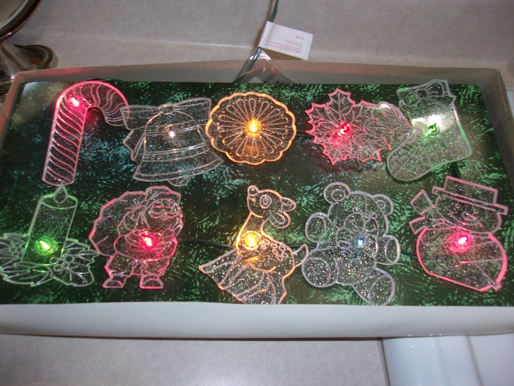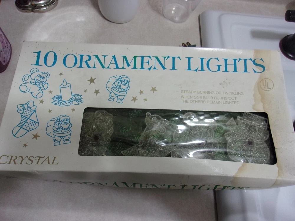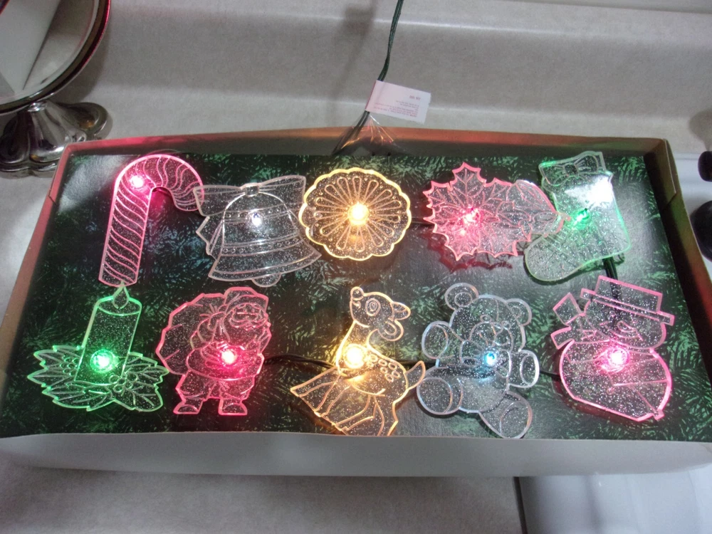 Brighten up your holiday decor with these charming Leco electric ornament lights. Designed to bring a warm, festive glow to your Christmas tree or mantelpiece, this set includes 10 plastic deer, Santa, teddy bear, bell, candy cane, circle, poinsettia, stocking, candle, and snowman figurines, each meticulously crafted to complement your holiday theme. The unbranded lights are perfect for creating a cozy Christmas atmosphere in any setting. Whether you're adorning your tree, crafting a centerpiece, or adding a festive touch to your home's exterior, these lights and ornaments will surely make your celebrations sparkle and shine. These say crystal ornaments on the original box. The box is water stained. These do work. Please email me with any questions. Thanks for looking.