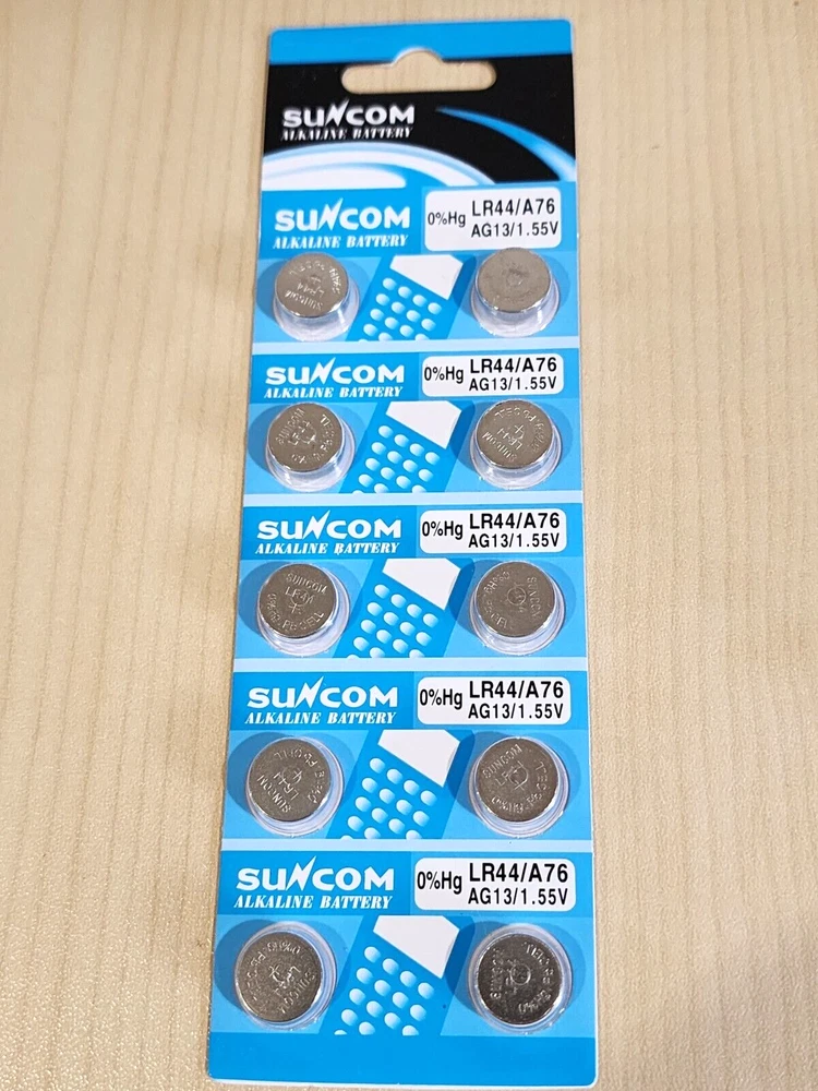 Up for sale are 10 new fresh Suncom LR44/A76 alkaline batteries. EXPIRATION DATES PRINTED ON PACKAGES IS 12/2028. Applications: Calculators, lasers, toys and many other devices. Replaces: 1131SO, SR44, D357/303, SP357, SR44W, V357, AG13, G13, G13A, A76, PX76, 675, 1166A, L1154, RW82, AG13, A76, 157, PX76A, A76-1, LR44H, V13GA, GP76A, SR44SW, KA, GPA76, LR44 Buy with confidence from a trusted ebay-seller. You may pay securely with Paypal. Thanks for looking.