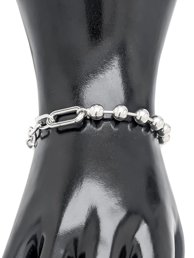 Description: Style: Pandora ME Metal Bead Chain Bracelet Guaranteed Authentic Color: Silver Size: Multiple Sizes Condition: Brand New Retail Condition. Details: 925 Sterling Silver with Hand-finished Details. -The Pandora ME Metal Bead Chain Bracelet proves that opposites attract. This sterling silver bracelet combines two basic styles - metal beads and links - and can be customized by pairing the links with a mini charm or medallion charm. Balancing the influence of 90s punk rock with the timelessness of trendy silver jewelry, this statement bracelet can be worn alone or layered for daily wear to style in new ways.