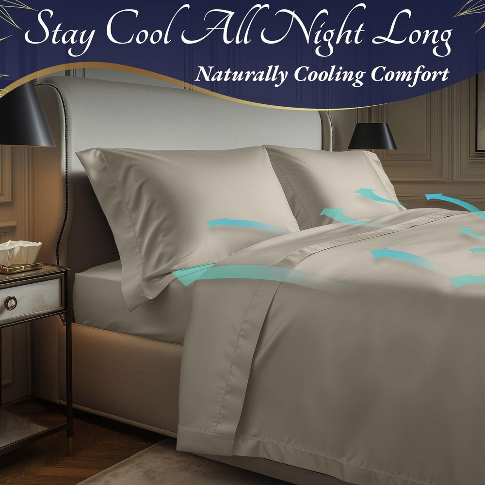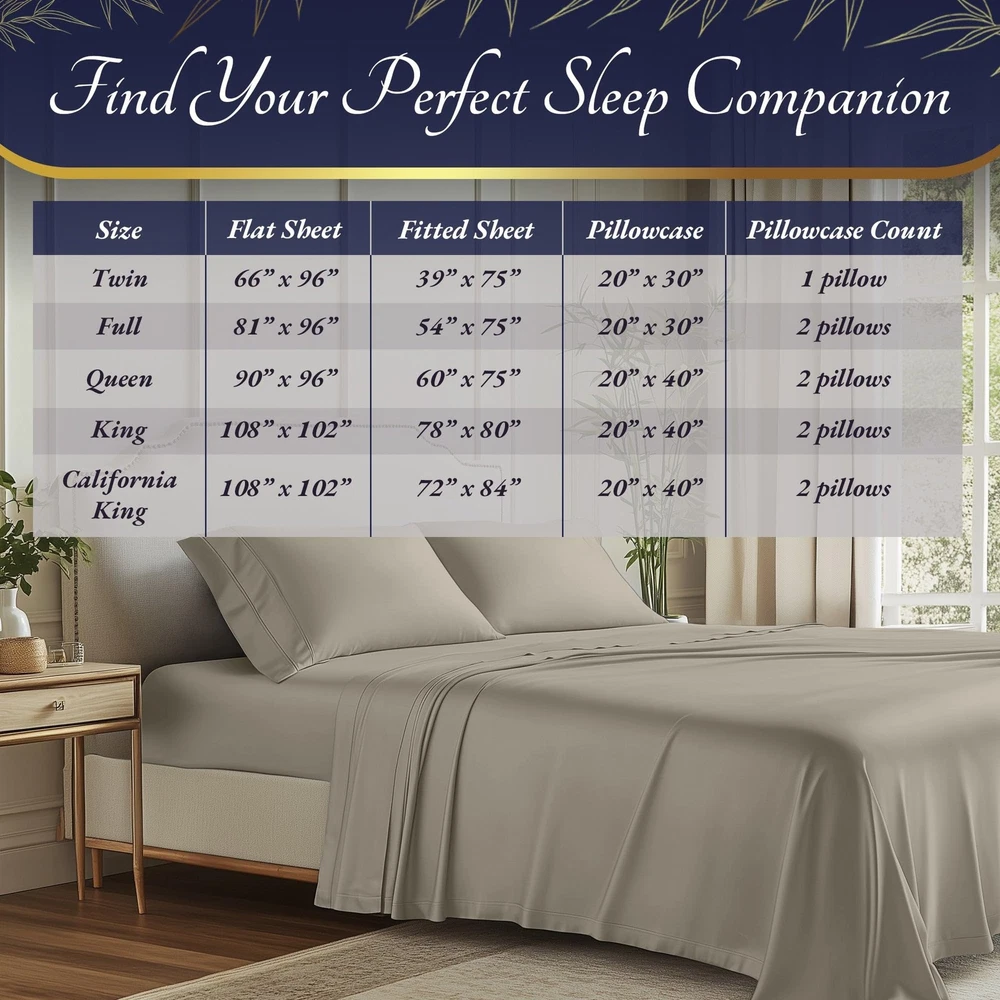 TBD UNMATCHED COMFORT & SOFTNESS: Our unique 100% viscose derived from bamboo sheets queen size deliver an unparalleled softness and a smooth, luxurious texture. OEKO-Tex Certified viscose derived from bamboo bed sheets are silky-smooth & naturally hypoallergenic SLEEP IN COOLING BLISS: Elevate your sleep with viscose derived from bamboo cooling sheets. Naturally temperature regulating bed sheet set, moisture-wicking, and innovative Breezweave technology for breathability. Luxury sheets for ultimate relaxation BUILT TO LAST: Our Queen sheets set is made from 100% viscose derived from bamboo that withstands longer wash cycles and is fade-resistant. Precise double stitching on sheets provides lasting durability and exceptional strength PERFECT FIT FOR All BEDS-4-PIECE SET: Discover the ultimate fit with our Queen size sheets set tailored for standard mattress dimensions, with a deep 17" pocket for extra-thick mattresses. Package Includes 1pcs Flat Sheet (90x102)inch, 1pcs Fitted Sheet (60x80)inch, 2pcs Pillow Cases (20x30)inch AFFORDABLE LUXURY & DURABILITY: Bed Sheets are made from high-grade viscose derived from bamboo, offering a smooth, wrinkle-free surface with exceptional softness; enjoy lasting quality and luxury without compromising on durability