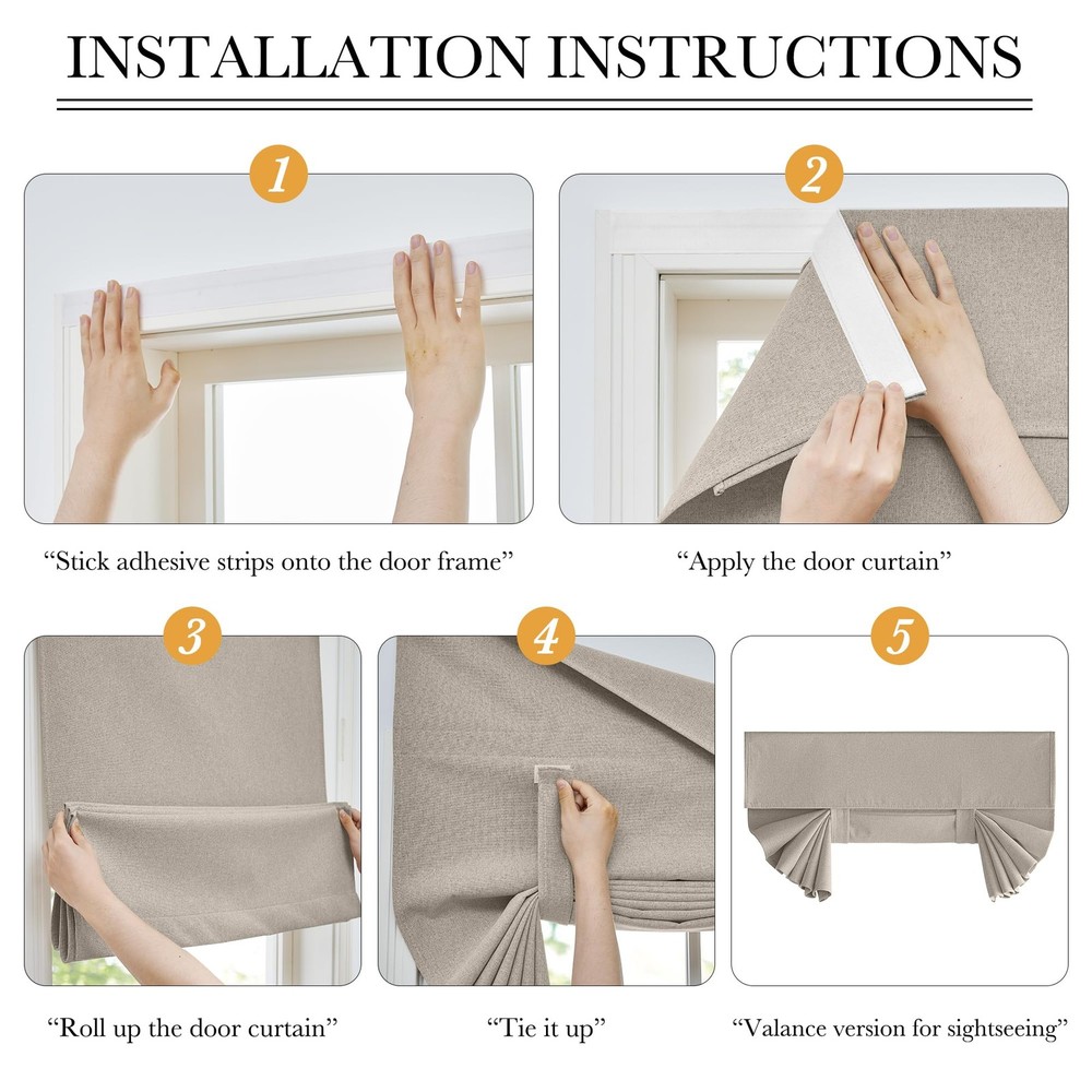 100% Blackout Linen Door Curtains with Adhesive Strips, 1 Panel Our blackout door curtains block 100% of light and UV rays. Includes 1 panel + adhesive strips for easy installation. Perfect for French doors, front door, and back doors. Thermal Insulated Energy-saving fabric reduces heat transfer by about 30%. Keep rooms cool in summer and cozy in winter while enjoying peaceful privacy. 4 Size Options for Every Space 8"x36" for classroom narrow sidelights | 26"x40" for standard doors | 12"x69" for sidelight windows | 26"x69" for standard doors | 36"x72" for wider doors. Choose your perfect fit! No Tools Needed Installation Skip curtain rods! Attach directly to glass/smooth surfaces in 3 minutes using included adhesive strips. Adjustable for temporary or permanent use. Luxury Feel & Easy Care Silky-soft 100% polyester. Machine wash cold, tumble dry low – maintains like-new quality for years. Package Includes: 1 premium blackout curtain panel (26"W x 69"L) + 1 adhesive strip. Perfect for French door, front door and back door window. Total Blackout & Privacy: Enjoy complete privacy and the perfect sleep with our fully blackout door curtain. It blocks 100% of light, creating a dark, peaceful space. Ideal for shift workers, nap lovers, and anyone seeking restful sleep. Diverse Colors and Sizes: Choose from a wide array of colors and sizes to meet your unique needs. Whether you're decorating your doors in a bedroom, living room, dining room, or kitchen, these blackout linen door curtains blend seamlessly into any space in your home. Easy Installation & No Tools Needed: Skip the rods! Attach directly to glass or smooth surfaces using the adhesive strip. Follow our step-by-step guide for a seamless setup in minutes. Easy Care: Easy to maintain and machine washable. Use only non-chlorine bleach & warm iron when needed. Tumble dry low.