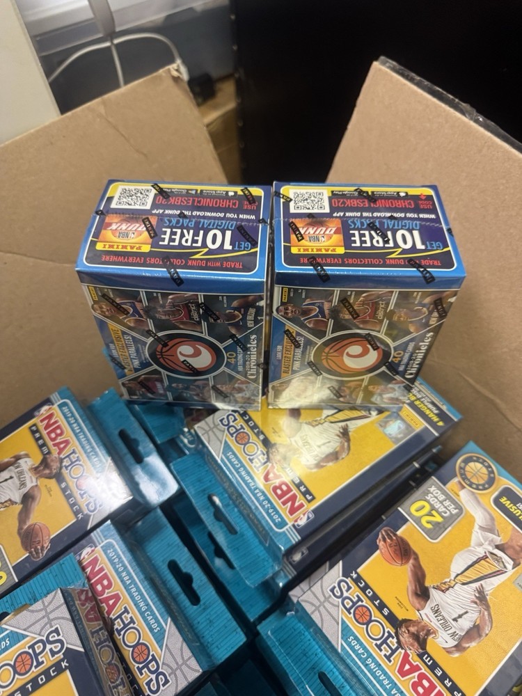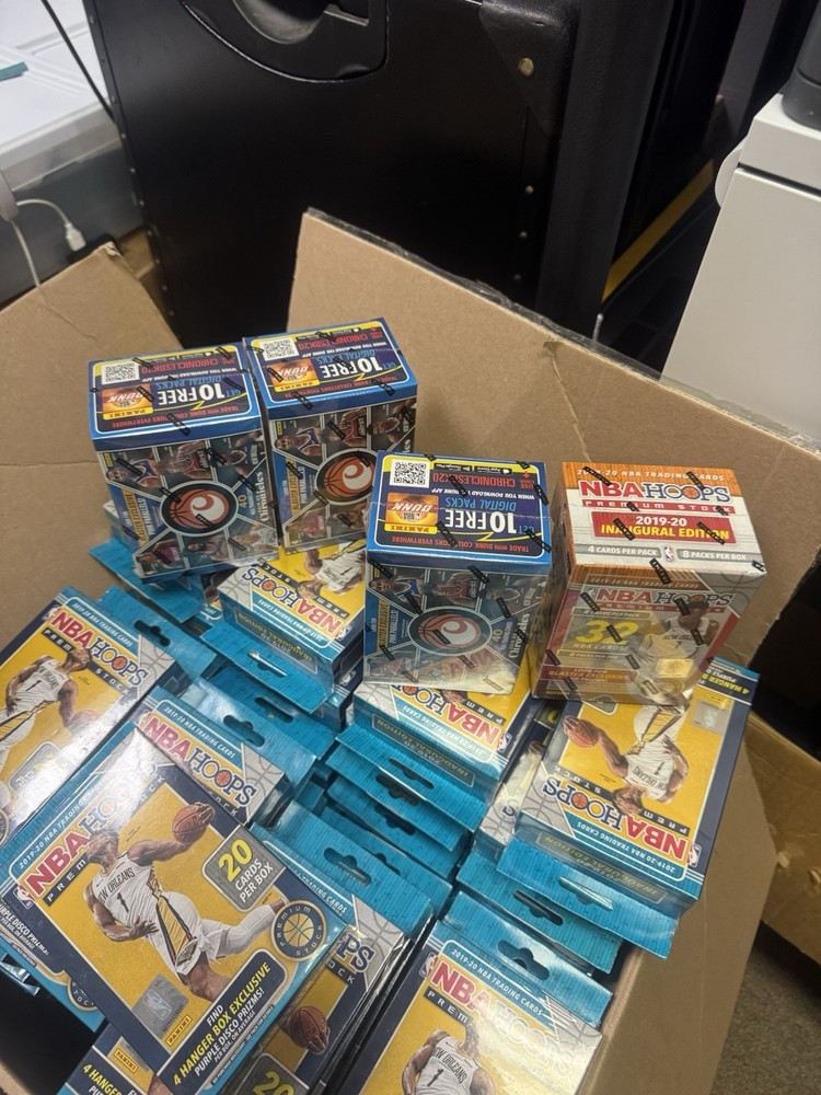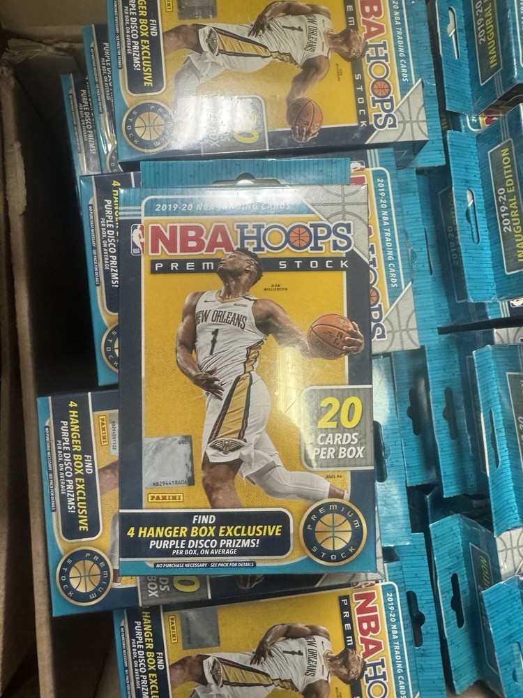 The product is a lot of 100 unopened 2019-20 Panini NBA Hoops Premium Stock hanger boxes. Each box contains 20 standard-sized trading cards featuring players from the National Basketball Association (NBA). Manufactured by Panini, these boxes include cards from the 2019-20 season and represent multiple NBA teams. This lot offers collectors the opportunity to potentially uncover highly sought-after cards and enjoy the thrill of opening packs to find hidden gems. PLUS 5 Free Blasters