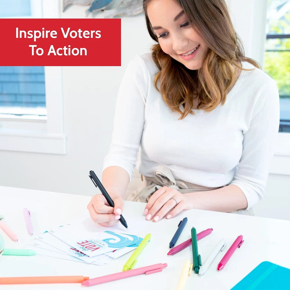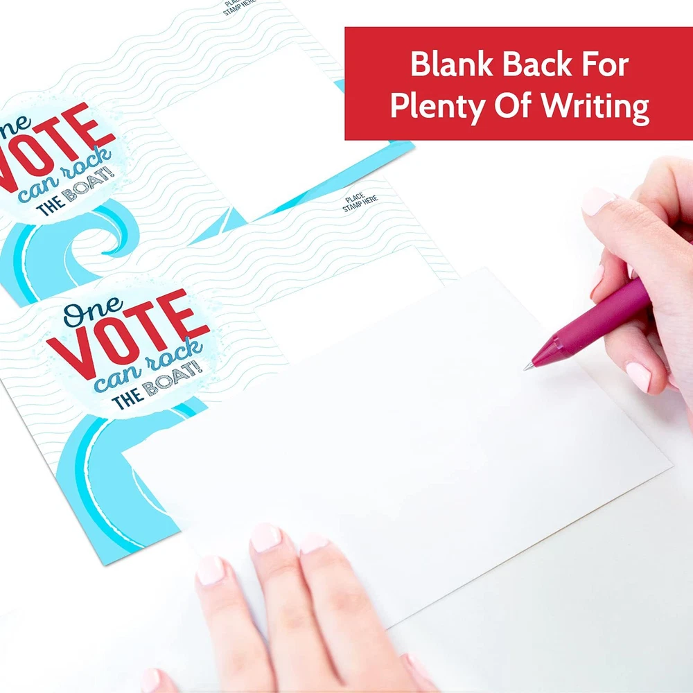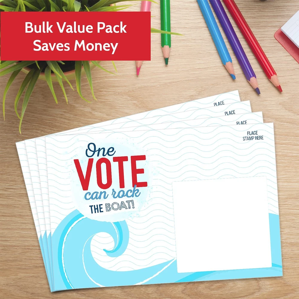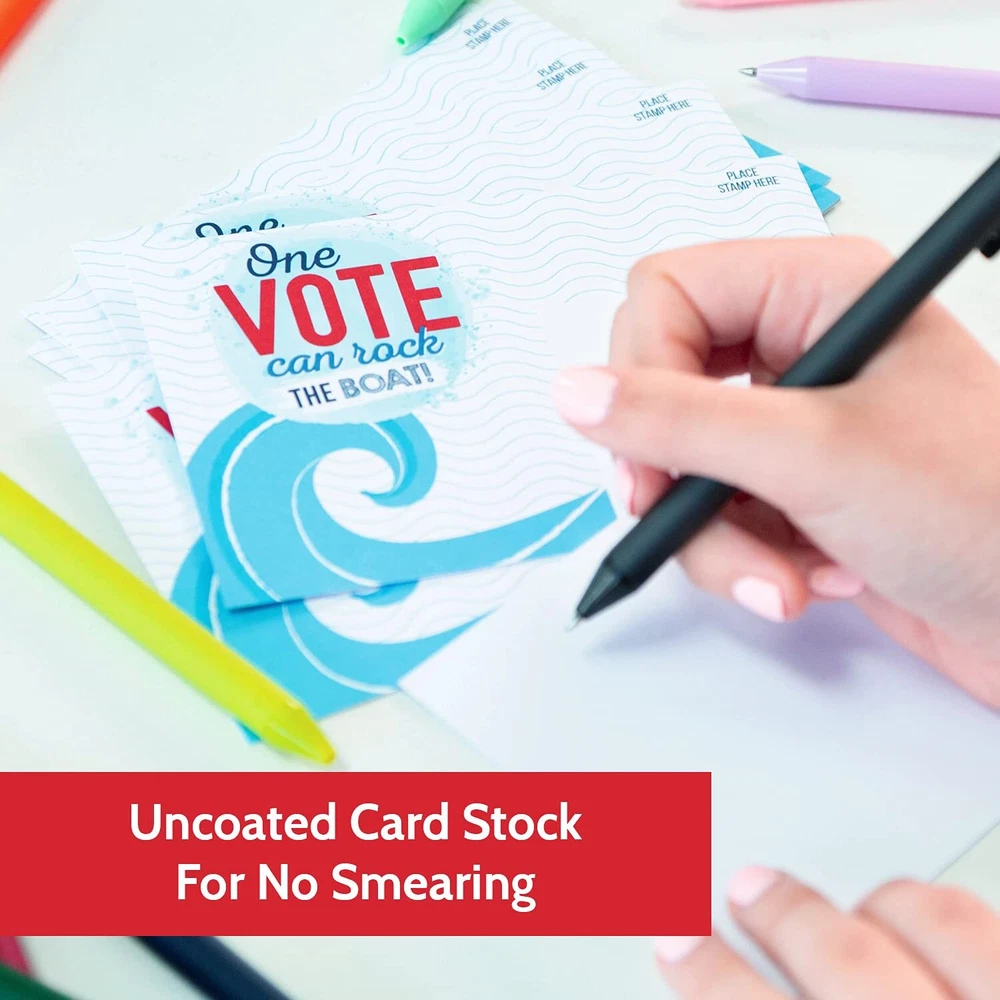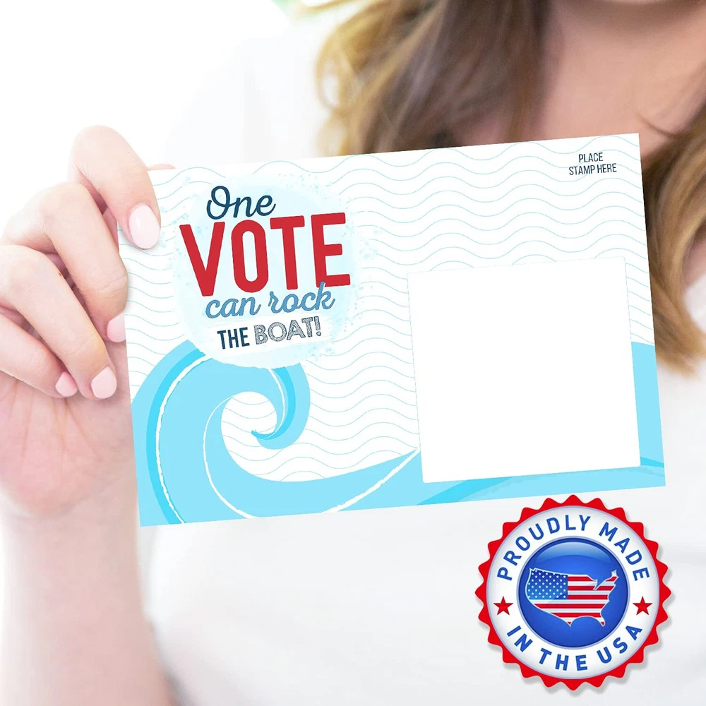MADE IN THE USA - Our voter postcards are proudly printed in the USA. Remind people that EVERY vote counts, and that their voice matters! SAVE MONEY - With our 100-count bulk value pack, you’ll save money and reach more voters in your state or district! MORE SPACE TO WRITE - With a full blank back side, our get out the vote postcards give you plenty of space to share your message without being cramped for space. IMPRESS RECIPIENTS - Everyone will love blue wave theme of these stylish patriotic postcards. They’ll stand out and catch eyes on people’s fridges and bulletin boards! INSPIRE ACTION - Thank you for volunteering your time to make democracy work! We are thrilled to help you inspire voters in your district, vote at a time!