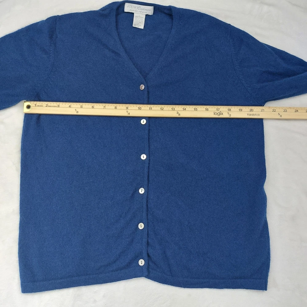 100% CASHMERE WOMENS BLUE 2 PLY YARNS V-NECK LONG SLEEVE ACADEMIA CARDIGAN SIZE LARGE. V-NECK. LONG SLEEVE. BUTTON FRONT. SMALL HOLE NOTED AND SHOWN IN PHOTOS. MEASUREMENTS PROVIDED. Items ship from a pet friendly home. *Items ship from a smoke-free home. *Colors may vary due to lighting. *Please read descriptions. Any flaws will be noted and photographed. *I source my inventory from multiple sources. I can not speak on fit for items. I try to provide photos of measurements when possible to assist in fit. *Clothing items are laundered, inspected, and sealed in plastic bags after photos are taken. This ensures you receive the item in the condition it was photographed in. Due to this process, additional details and measurements can not be provided. *Reasonable offers considered. *If you have any questions, please ask. Buyer is responsible for reviewing all photos and descriptions for condition details. Although I do my best to find and disclose any flaws, there may still be flaws present that were missed unintentionally in human error.