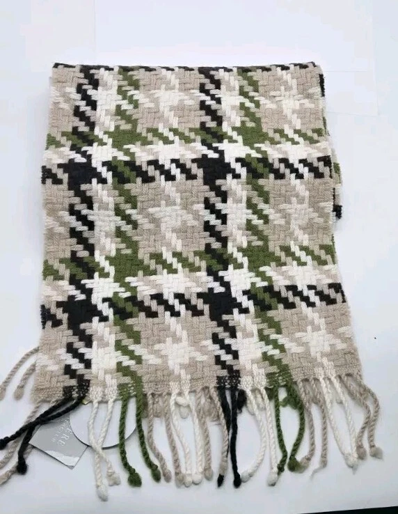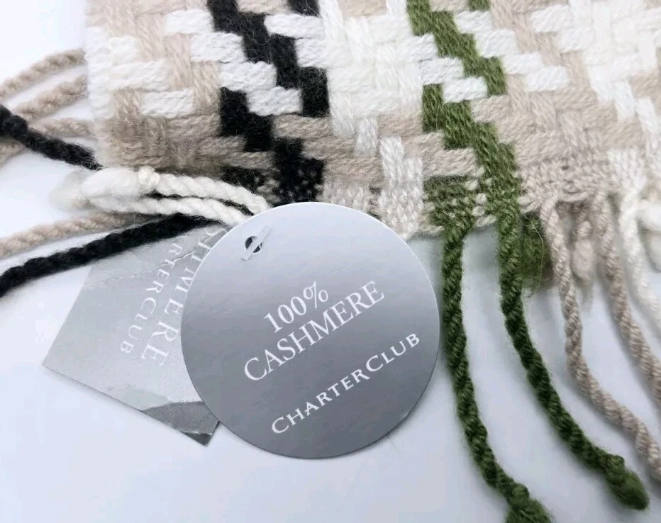 Elevate your style with this stunning multicolored plaid scarf from Charter Club. Made from 100% cashmere, this rectangle scarf features fringed ends for an added touch of elegance. The scarf measures Approx.. 9.5 in x 63 in and is perfect for both men and women. The beautiful combination of green, tan, and black colors makes it easy to pair with any outfit. New with Partial Tag Retailed $95