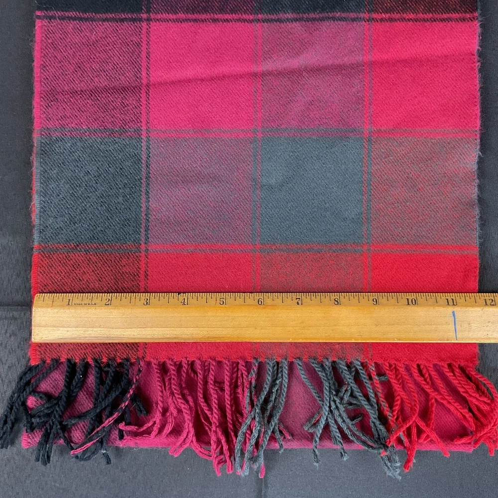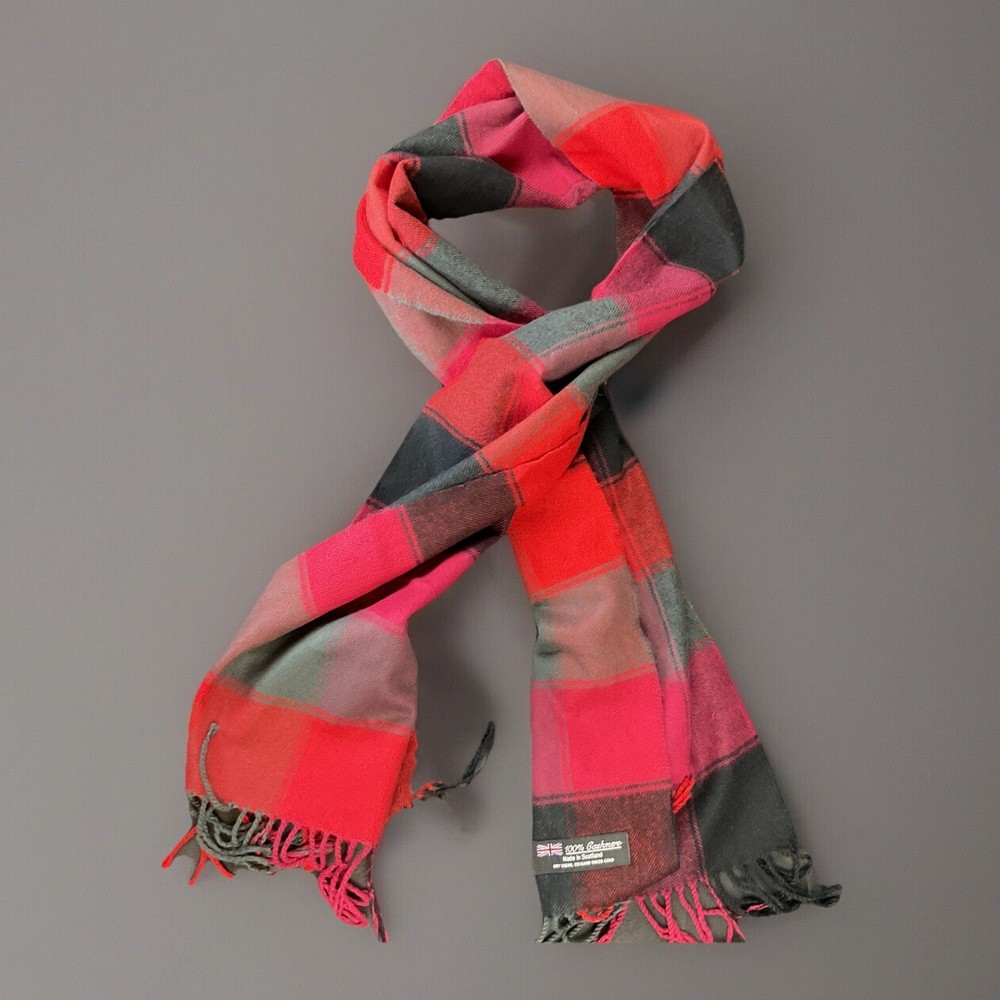 100% Cashmere red, pink, black, and gray tartan plaid scarf with fringe. Made in Scotland. Dry clean or hand wash. Excellent preowned condition. Please see photos for additional details.