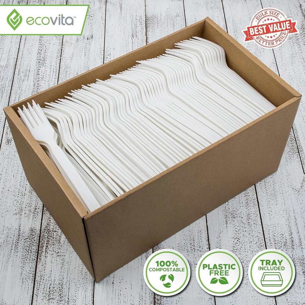 Product Description STRIVING TO MAKE A DIFFERENCE Zero Waste & Sustainable Our products are 100% Compostable and take less energy to make and produces fewer greenhouse gases than conventional plastics. They comply with ASTM D6400 & EN13432 Strict Standards and have been awarded BPI certification, gold standard in compostability. All Natural & Safe Our products are manufactured in registered facilities. We use all natural plant resources like Non-GMO corn grown and harvested in the USA. No BPA, Chlorine or Toxic Chemicals that may be found in Plastic. We only source from the best manufacturers with high standing and quality. Elegantly Durable We have created these products to be sturdy for everyday use but beautiful and minimalistic designed for your special events and activities. They have undergone a special process which converts the natural raw material into a design with increased durability and heat resistance without compromising our environment. We Donate to Positive Causes In addition, to the positive impact our products have, we pledge 5% of profits to organizations or programs that make a Positive Impact in our Communities and Environment. We are commitment to making a change that will help keep our ocean, air and land clean and beautiful. Together we can make a difference. Ecovita provides premium environmentally conscious products and peace of mind that you are providing all-natural tableware for your family and friends. Perfect for Camping, Picnics, Lunches, Catering, BBQs, Events, Parties, Weddings and Restaurants. We believe you will be totally satisfied by our safe, environmentally conscious products. WHY BPI CERTIFIED PRODUCTS MAKE A DIFFERENCE Guide to Setting up an Eco Event Included (Insert) BPI Certified tableware under the appropriate conditions will turn into nutrient-rich soil in an industrial or composting facility in 2 - 4 months, not 100 years like single-use plastic! In addition, certified flatware (made of CPLA) takes 65% less energy to make and produces 68% fewer greenhouse gases than conventional plastics. Look for environmentally conscious utensils certified by BPI (Certificate #10528852 Issued 2018) meeting high standards (ASTM D6400). Eco Tested | 100% BPI Certified All Natural and Safe Large Sturdy Utensils With High Heat Resistance Convenient Tray Included Guide to Setting Up Eco Event Included (See Insert) Compostable Forks - 500 Compostable Spoons - 500 Compostable Knives - 500 Compostable Mix Cutlery Set - 380 Compostable Mix Cutlery Set - 380 Add to Cart Add to Cart Add to Cart Add to Cart Add to Cart Customer Reviews 4.7 out of 5 stars 126 4.7 out of 5 stars 719 4.5 out of 5 stars 30 4.6 out of 5 stars 604 4.6 out of 5 stars 604 Price $70.80 $ 70 . 80 $68.55 $ 68 . 55 $68.55 $ 68 . 55 $58.08 $ 58 . 08 $55.98 $ 55 . 98 Type & Color FORKS - Ivory White SPOONS - Ivory White KNIVES - Ivory White MIX - Ivory White MIX - Black Per Pack 500 500 500 140 Forks, 120 Spoons & 120 Knives (380) 140 Forks, 120 Spoons & 120 Knives (380) Disposable ✓ ✓ ✓ ✓ ✓ BPI Certification ✓ ✓ ✓ ✓ ✓ On Feb 22, 2025 at 00:47:04 PST, seller added the following information: