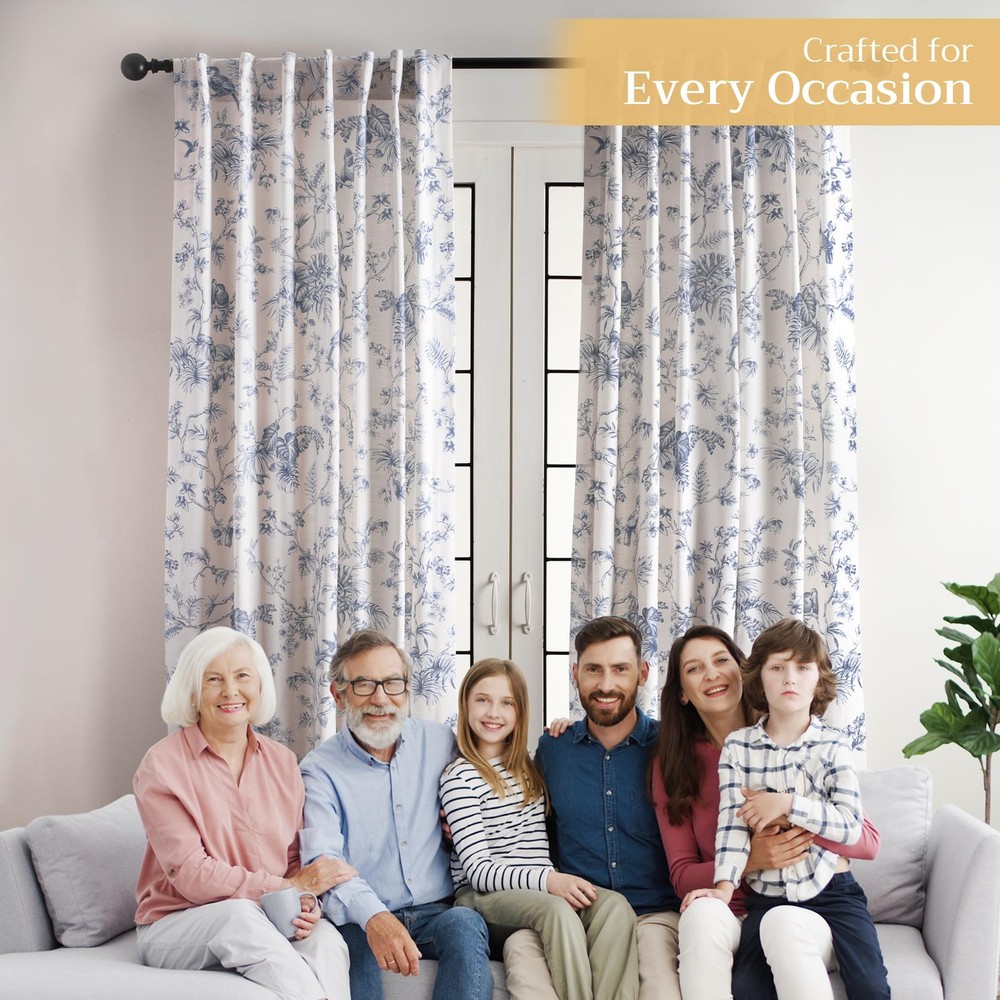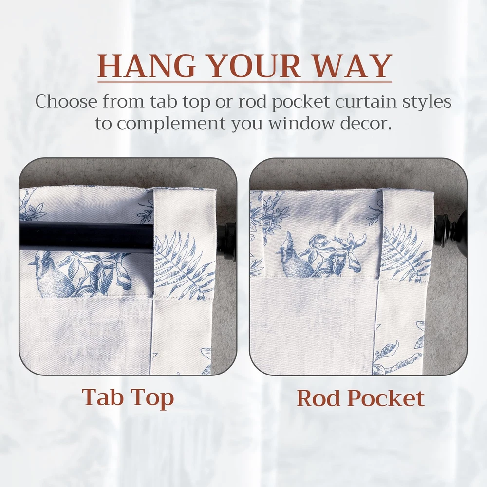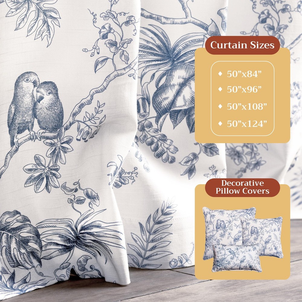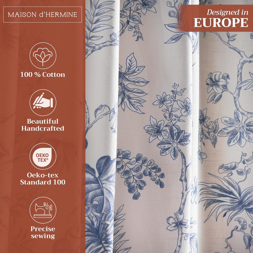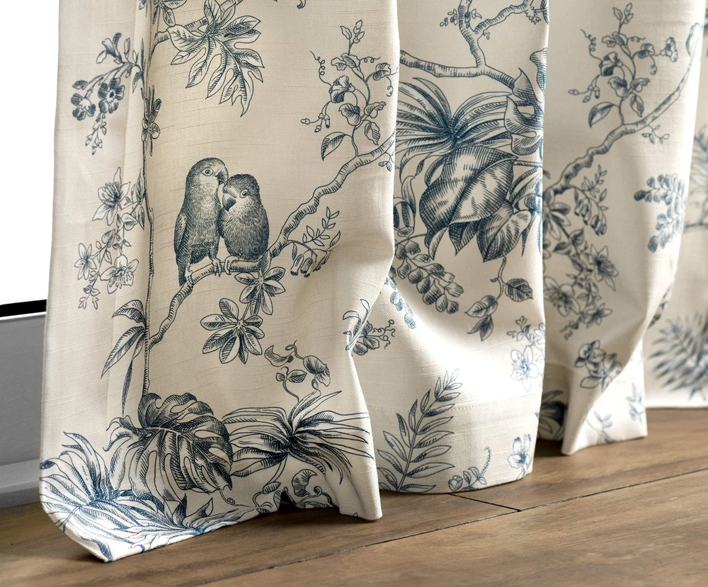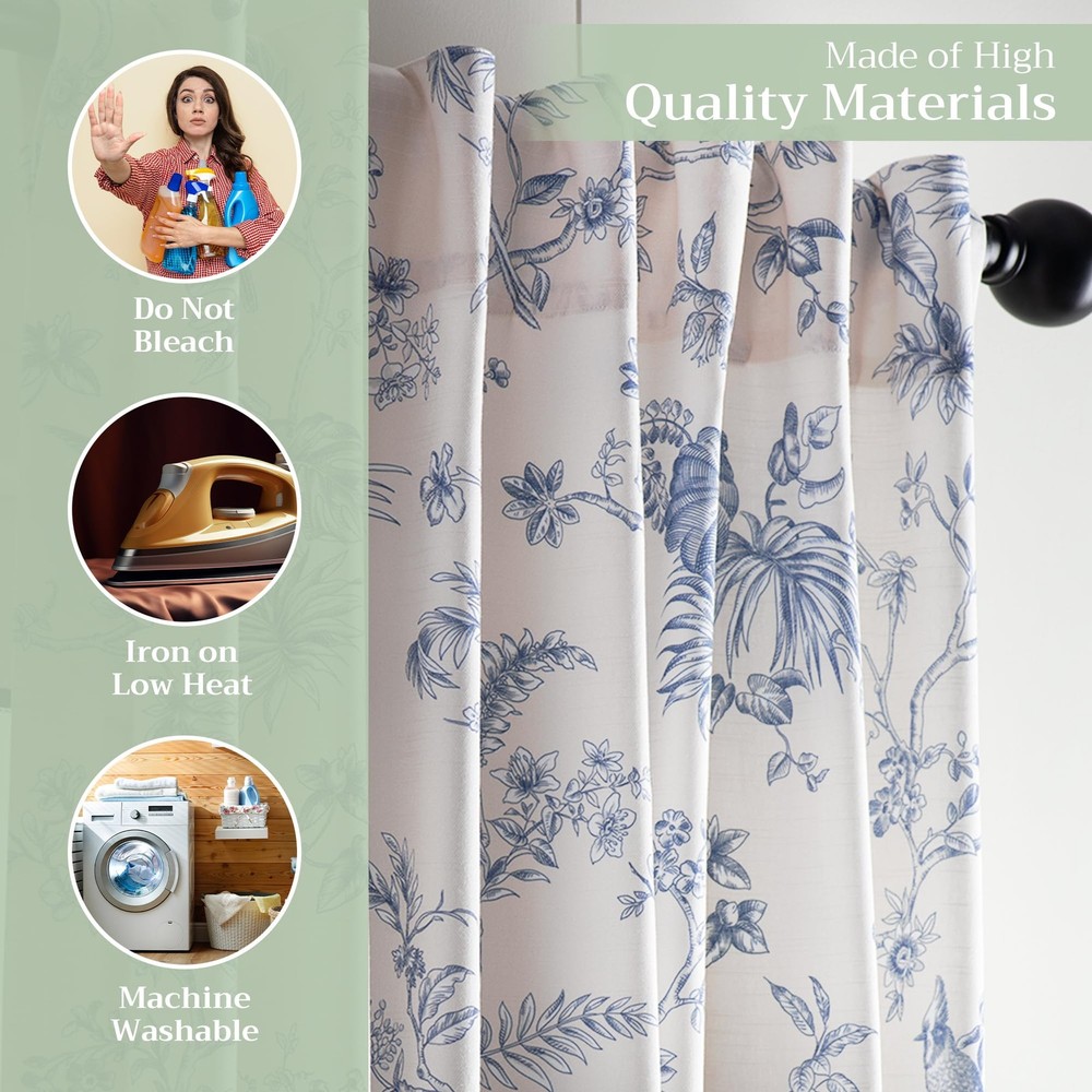 PACKAGE INCLUDES: 1 Panel with loop as well as rod pocket for easy hanging. The Dimension of the curtains is (50"x108"). Available in three different colors and three different sizes, you can pick the one that best suits your home decor. Our products are Designed in Europe and Made in India. QUALITY: Background color of the Curtain is Cream and not white. The fabric is 100% cotton, giving the curtain its high-quality feel and finish. A clear departure from the run-off-the-mill dull-looking curtains, these liven up any setting and are great choices if you're looking to giving a fresh and uplifting makeover to your home. Available in three different background colors and three different sizes, you can be sure to find the right print to enhance the color scheme of your home. UNIQUE DESIGN: A cheerful addition to any space, the Jouy Paradis collection features exotic birds and tropical flowers hand-painted in a French Toile style and printed with care on 100% cotton. Capturing the beauty of a tropical paradise, Jouy Paradise makes a great statement and appeals to those who like a more playful approach to natural patterns and life-like colors. REVAMP YOUR HOME: A clear departure from the run-off-the-mill dull looking curtains, these liven up any setting and are great choices if you're looking to giving a fresh and uplifting makeover to your home. EASY CARE & MAINTENANCE: Machine wash warm with like colors, do not bleach, tumble dry low and warm iron if needed.