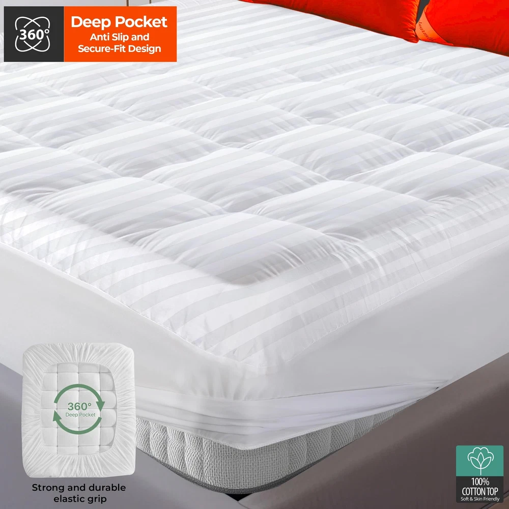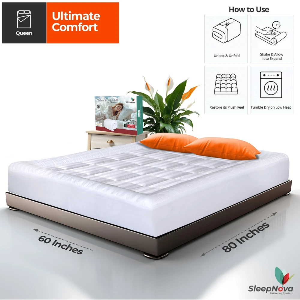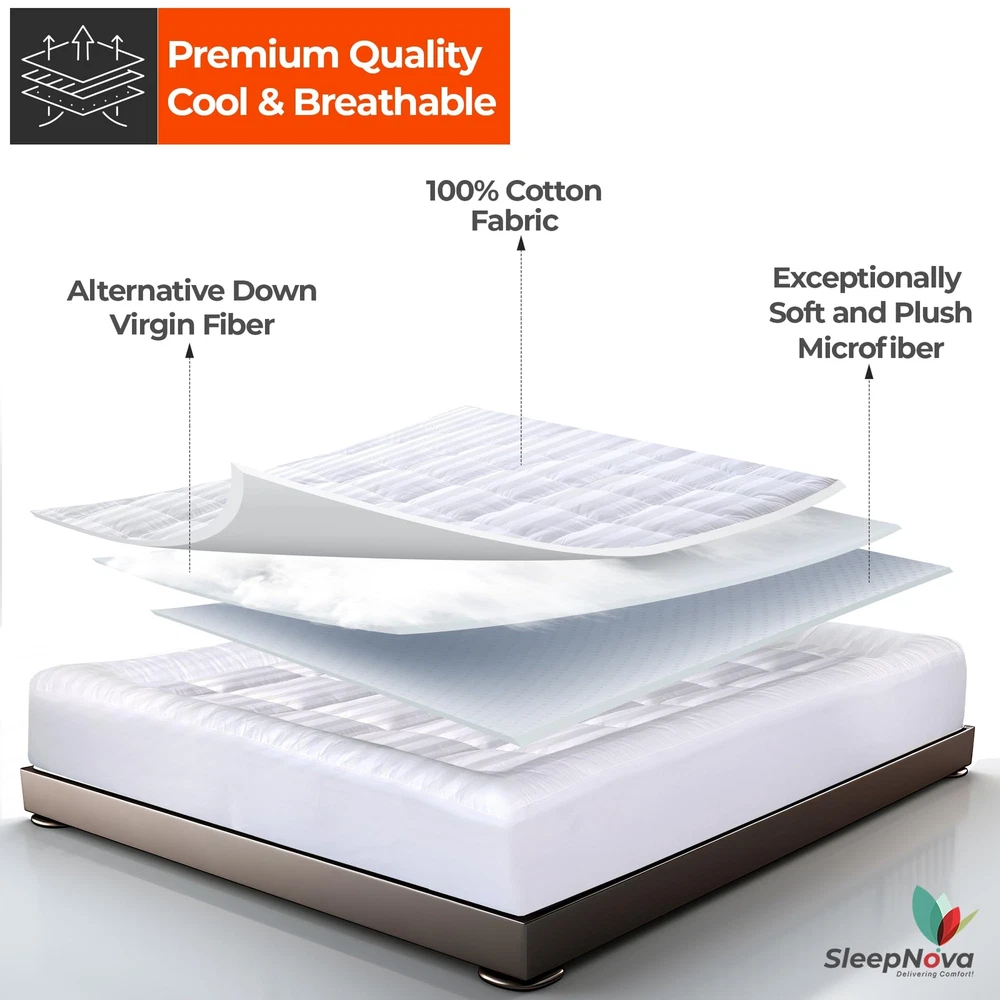 ๐๐ง๐ก๐๐ง๐๐๐ ๐๐จ๐ฆ๐๐จ๐ซ๐ญ: Experience unparalleled comfort with the Mattress Pad Queen Size. Designed with 3 Premium Quality Layers Queen Size Mattress Topper โโ 100% Cotton Top,Microfiber Bottom, ensuring optimal softness and durability for a perfect sleep balance. 360ยฐ ๐๐๐๐ฉ ๐๐จ๐๐ค๐๐ญ ๐๐๐ฌ๐ข๐ ๐ง ๐๐จ๐ซ ๐๐๐๐ฎ๐ซ๐ ๐ ๐ข๐ญ: Featuring Bed Topper Queen Size with 360ยฐ deep pocket that stretches from 8 to 21 inches to accommodate various mattress sizes. This Pillow Top Mattress Topper Queen stays securely in place throughout the night. The all-around elastic edging ensures a snug fit, preventing the topper from shifting or bunching up, no matter how much you move during sleep. ๐๐ซ๐๐๐ญ๐ก๐๐๐ฅ๐ ๐๐ง๐ ๐๐จ๐จ๐ฅ๐ข๐ง๐ ๐๐๐๐๐๐ญ: Queen Size Mattress Cover utilizes premium 100% cotton top breathable fabric giving a cooling effect to ensure a restful night's sleep. This Queen Size Mattress Pad promotes airflow, helping to regulate body temperature and prevent overheating. Say goodbye to night sweats and hello to a cool, comfortable sleep environment ๐๐ฅ๐ญ๐ซ๐ ๐๐ฅ๐ฎ๐ฌ๐ก ๐๐ข๐๐ซ๐จ๐๐ข๐๐๐ซ ๐๐จ๐ญ๐ญ๐จ๐ฆ ๐๐๐ฒ๐๐ซ: Queen Mattress Pad Fitted with 100% microfiber bottom layer provides extra strength and endurance. Our Thick Mattress Topper Queen has durable fabric which is designed to withstand daily use and frequent washing without losing its shape or comfort, making it a reliable addition to your bedding. ๐๐๐ซ๐๐๐๐ญ ๐๐ข๐ณ๐ ๐๐๐ฅ๐๐๐ญ๐ข๐จ๐ง: Available in a range of sizes, Cotton Mattress Pad is designed to fit different bed dimensions perfectly. Whether you have a TWIN, TWIN XL, FULL, QUEEN or KING size bed, this topper will elevate your sleep experience with its adaptable and versatile design, providing comfort for any mattress size. ๐๐๐๐ก๐ข๐ง๐ ๐๐๐ฌ๐ก๐๐๐ฅ๐: โs Queen Bed Topper is fully machine washable, allowing you to keep it clean and fresh with minimal effort. Simply wash it on a gentle cycle with cool water and tumble dry on low heat for optimal care and longevity. ๐๐๐ญ๐ข๐๐ฎ๐ฅ๐จ๐ฎ๐ฌ ๐๐ญ๐ข๐ญ๐๐ก ๐๐๐ฌ๐ข๐ ๐ง: Cooling Mattress Topper Queen size features superior stitching that enhances its durability. The neat and sturdy stitching prevents the filling from shifting or clumping, guaranteeing consistent comfort and support night after night. ๐๐๐ซ๐๐๐๐ญ ๐๐ข๐๐ญ ๐๐จ๐ซ ๐๐จ๐ฏ๐๐ ๐๐ง๐๐ฌ: The Sleep Nova Queen mattress topper is an ideal gift for anyone who values comfort and quality sleep. Whether it's for a family member, friend, or loved one, this luxurious mattress topper offers a thoughtful and practical way to enhance their sleeping experience. Perfect for holidays, birthdays, or special occasions. ๐๐๐จ-๐ ๐ซ๐ข๐๐ง๐๐ฅ๐ฒ ๐๐ง๐ ๐๐๐ซ๐ญ๐ข๐๐ข๐๐: Cooling Mattress Topper is made from environmental & skin-friendly materials. It is OEKO-Tex 100 certified, ensuring that it does not contain harmful substances. Sleep soundly knowing that your mattress topper is safe for you and the environment. 24/7 ๐๐ฎ๐ฌ๐ญ๐จ๐ฆ๐๐ซ ๐๐ฎ๐ฉ๐ฉ๐จ๐ซ๐ญ: At , around-the-clock customer support is our top priority. We take pride in our exceptional quality and value for money Mattress Toppers. Feel free to contact us anytime regarding any queries or concernsโweโre here to help!
