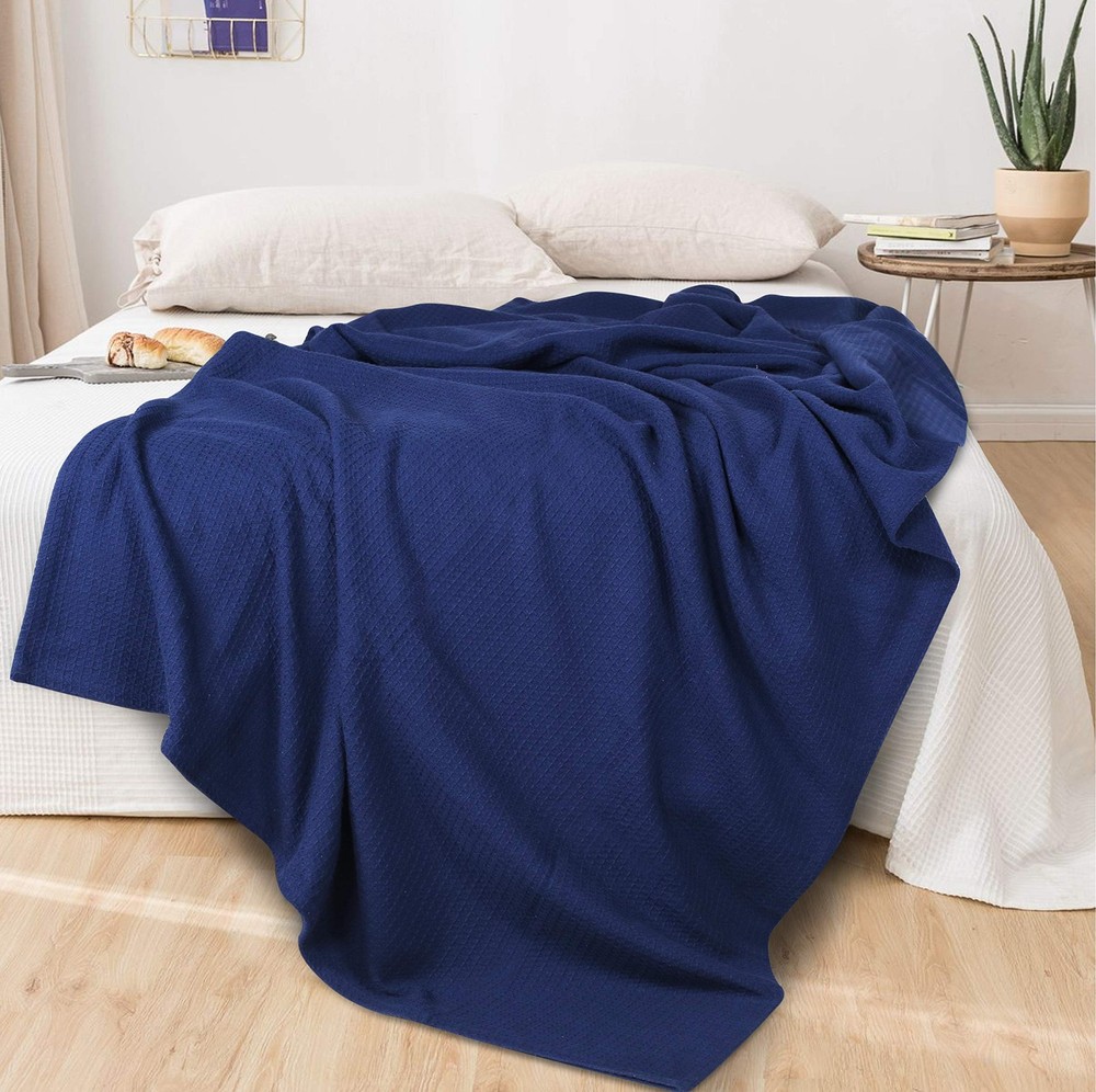 EXTRAORDINARY VALUE : These Waffle Blanket are Supremely Soft Cozy 100% Cotton Throw Blanket Made of cotton Yarn. Twin Size: 90 x 90 Inches, Waffle Design, Color: Navy Blue LANDMARK QUALITY: Twin Thermal Cotton Blanket Size: 90 inch by 90 inch Well made of 100% luxurious Premium Long-Staple Combed Cotton ; Cotton blankets feel soft and cozy; they have a comfortable weight VERSATILE: Made from natural materials and no harmful chemicals and synthetic materials are added, which is safe for you and your family. COLORFUL: Brilliant intense vibrant colors, highly functional and durable, easy care machine wash. IDEAL for All Seasons: Soft and cozy durable for long use. Ideal for layering with any bedding ensemble. Easy Care machine washable. EASE OF CARE. These beautiful towels are colorfast and machine washable. Always Tumble Dry Low for maximum of 10-15 minutes. Product might lint upon washing but not more than 1% of product weight as per International Standards. Always follow care label instructions for best results