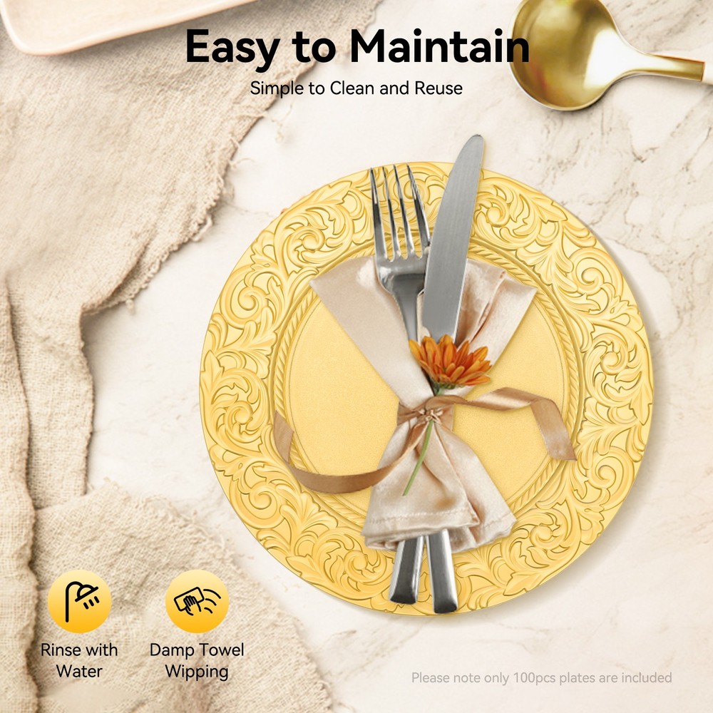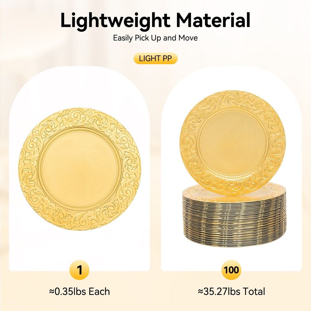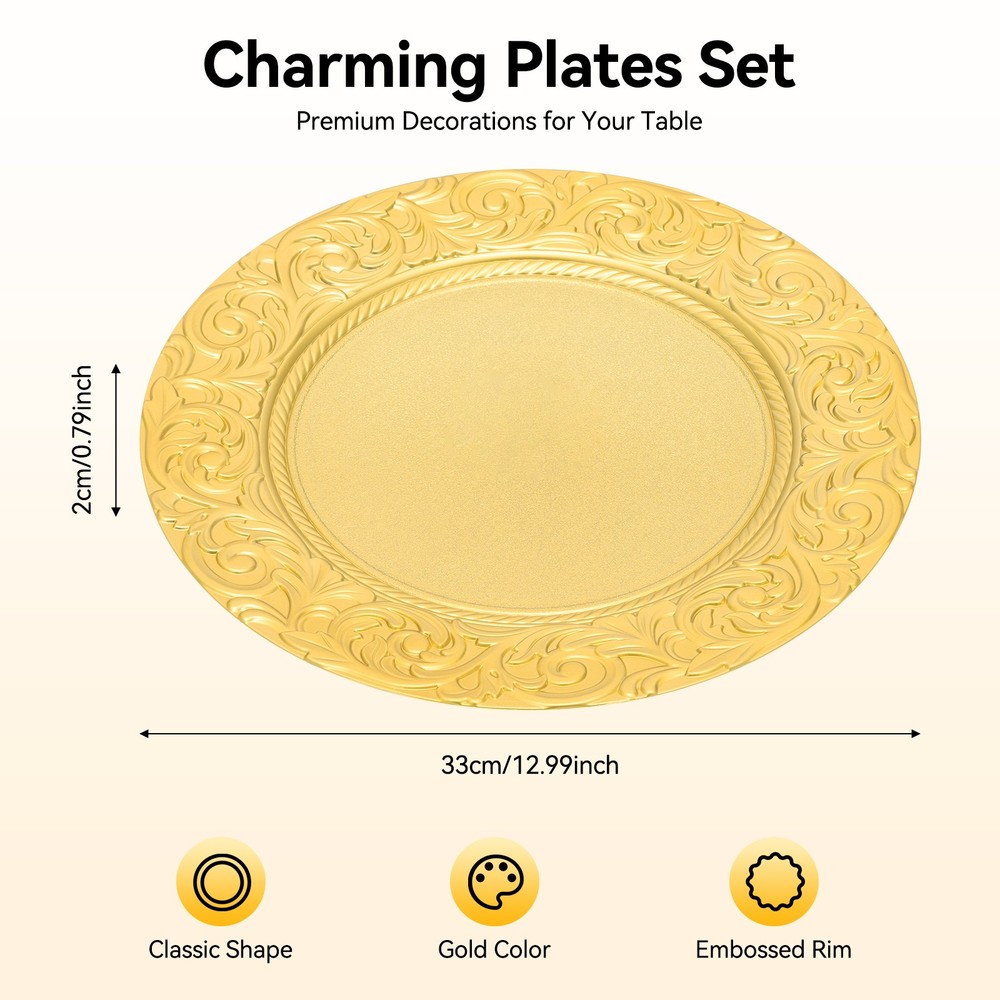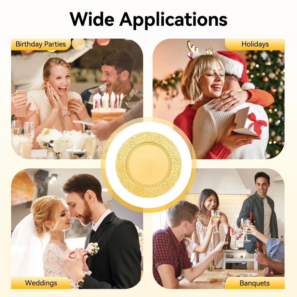 100 Count Gold Round Charger Plates Set for Parties, Weddings & Events This elegant set of charger plates is the perfect addition to your banquet table, making any event—from weddings to holiday celebrations—truly special. Crafted from high-quality PP, these plates boast a stunning texture and glossy finish, instantly elevating your dining experience. ✨ Long-Lasting Durability: Made from PP using a spraying paint process, these plates are safe for use and resistant to fading, wear, and tear, ensuring they last for numerous gatherings. Generous Quantity: With 100 pieces in this set, these charger plates are ideal for home use as well as large events, hotels, and restaurants. Stylish Design: The simple round shape and beautiful gold color, accented by an embossed rim, create a sophisticated look that pairs wonderfully with other dinnerware. Space-Saving Storage: These plates can be easily stacked, allowing for convenient storage in your cabinet without taking up much space. Lightweight Construction: Each plate is approximately 0.35 kg, so you can effortlessly handle and move them as needed. Easy Maintenance: Their smooth surface makes cleaning a breeze; simply wipe with warm water and a soft cloth for reuse. The charger plates also feature smooth edges that provide a safe touch, minimizing the risk of scratches during daily use. The sunken bottom design ensures stability for your salad bowls, soup dishes, or entrée plates while preventing spills—keeping your table looking great. Specifications: Color: Gold Style: Modern Shape: Round Material: PP Process: Spraying Paint Assembly Required: No Number of Pieces: 100 Product Size (D×H): 33 cm × 2 cm (12.99 in × 0.79 in) Packaging Size: 40 cm × 33 cm × 33 cm (15.75 in × 12.99 in × 12.99 in) Gross Weight: 17.5 kg (38.58 lbs) Net Weight: 16 kg (35.27 lbs) What’s included in the box? You’ll receive 100 charger plates ready to enhance your dining tables. 🎁 Usage Tips: These plates are perfect for birthday parties, holidays, weddings, and other gatherings. Ideal for restaurants, hotels, and personal events like camping and picnics. Care & Maintenance: Avoid direct contact with food and do not clean with a dishwasher or abrasive materials. Clean gently with a soft cloth and warm water. Allow for slight color variations due to lighting and a possible 1-3 cm discrepancy in manual measurements. For any issues, our friendly customer service team is here to help! We are dedicated to ensuring your satisfaction and are ready to address any questions you might have. Elevate your next gathering with this exquisite charger plate set—your guests will be impressed! 🌟 Payment Delivery details Terms of sales About us Contact us Payment We accept ebay payment 。 Fees such as import duties, taxes are not included in the item price or shipping costs. These charges are the buyer's responsibility. Delivery details Shipping: 2-9 working days to: USA Terms of sales We maintain high standards of excellence and strive for hundred percent customer satisfaction. Feedback is very important to us. We hope that you contact us immediately before you give neutral or negative feedback, so that we can address your concerns. It is impossible to address issues if we do not know about them! About us Your satis faction is our ultimate goal. We work hard to earn your trust and future business. Our certified technicians have tested each item before shipping. The unit comes with 1 year limited warranty on all manufacturing defects. a) If you receive a defective item, you may return it or ask for a discount. Please contact us within 14 days after you receive the package. b) What you returned must be intact and in its original packaging as re? u. Customer is responsible for shipping costs of the returned item. c) We will cover the cost of shipping back t with the shipping rate indicated in the registration page. We will send you a new unit or refund the full payment you paid. Thank you. Contact us Business Hour Business Hour: Monday To Friday: 8:30 AM to 5:00 PM (Beijing China time) Due to time zones, our reply to your questions may not be immediately. But within above working time, we will reply your email within 24 hours. If it's non-workdays, please kindly be patient and wait till Monday. Please contact us with ebay message. Please feel free to contact us if you have any questions. Monday To Friday: 8:30 AM to 5:00 PM (Beijing China time) Due to time zones, our reply to your questions may not be immediately. But within above working time, we will reply your email within 24 hours. If it's non-workdays, please kindly be patient and wait till Monday. Please contact us with ebay message. Please feel free to contact us if you have any questions. On Feb 12, 2026 at 01:52:26 PST, seller added the following information: