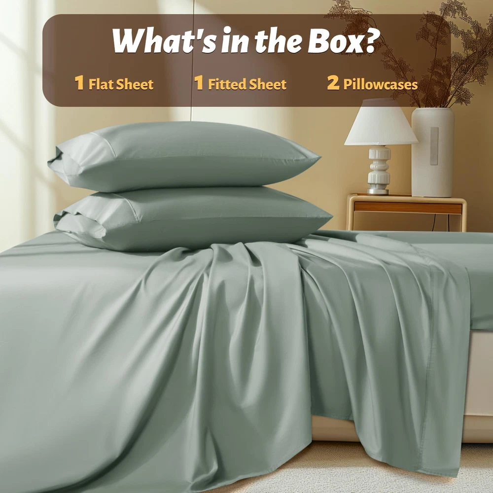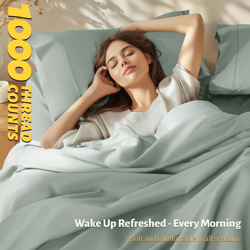 Store New Arrivals Add to Favorite View Feedback Contact 100% Egyptian Cotton Queen Size Sheets Set - 1000 Thread Count,Luxury Cotton Bed Sheets,Breathable & Cooling Bedding and Pillow Cases, 16 Inch Deep Pocket - 4 Piece (Sea Glass, Queen) Description Item model number 56CMSJT Closure Type Envelope Style Modern Included Components Fitted Sheet,Flat Sheet,Pillowcases Color 06 - Sea Glass Pattern Solid Fabric Type 100% Cotton Material Cotton Country of Origin China Item Weight 4.64 pounds Pillowcase Quantity 2 Age Range (Description) All Ages Thread Count 1000 Seasons All Number of Pieces 4 Special Feature Breathable Package Dimensions 14.76 x 9.65 x 4.17 inches Product Care Instructions Machine Wash Size Queen 100% Cotton 100% PURE COTTON FOR PREMIUM COMFORT & SOFTNESS:Imagine slipping into bed every night and feeling the softness of our certified 1000 thread count sateen 100% cotton sheets against your skin. It's like having a five-star hotel experience in your own bedroom! You'll feel cool and comfortable in all seasons with our luxury sheets set CERTIFIED GREEN WEAVING & DYEING: All fabric used are 100% Eco friendly, Chemical free and certified AZO FREE, making it soothing for even the most sensitive skin. These deep pocket sheets are Standard 100 by OEKO-TEX, leaving no worries of thread count & performance SNUG FIT:Looking for a fitted sheet in the 4-piece set that actually stays in its place and doesn't come off? Our fitted sheet comes with an all-around elastic to fit your mattress perfectly. The head/foot side indicator tells you how to make the bed easily. WHAT'S INCLUDE: Each Queen Size Sheet Set comes with 1× Fitted Sheet 60"×80"×16" + 1× Flat Sheet 90"×102"+2× Pillowcases 20"×30". Care Guidance: These sheets are finished with high-strength stitching and are low-maintenance. Machine wash your sheets in cold water, tumble dry low, and iron on low heat when needed. If you prefer wrinkle-free bedding, use a short dry cycle and take your sheets out promptly from the dryer. ENHANCED SLEEP ENVIRONMENT: Elevate your sleep experience with our luxury 1000 thread count cotton sheets. The natural breathability properties of our cotton create a comfortable sleep environment, keeping you cool and relaxed throughout the night. Ideal for all seasons, these sheets provide a soothing touch and very suitable for hot sleepers Product Description ABOUT US We’re committed to offering great deals on quality products you can trust. From home décor and garden essentials to tools, hardware, and pet accessories, there’s something for everyone at prices you’ll love. SHIPPING Orders ship directly from the USA for fast and reliable delivery. Most items ship within 1 business day and include free shipping to the lower 48 states. International orders are fulfilled through eBay’s Global Shipping Program. Simply proceed to checkout to view shipping costs, duties, and taxes for your country. FREE RETURNS We offer a 30-day return policy on items you are not completely satisfied with. You may choose a full refund or an exchange.. CUSTOMER SATISFACTION We do everything we can to ensure every customer is fully satisfied. If something is not right, send us a message and we will take care of it quickly.