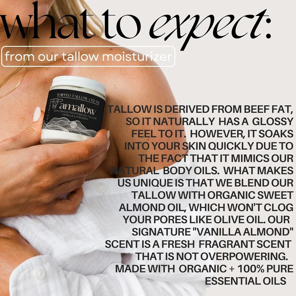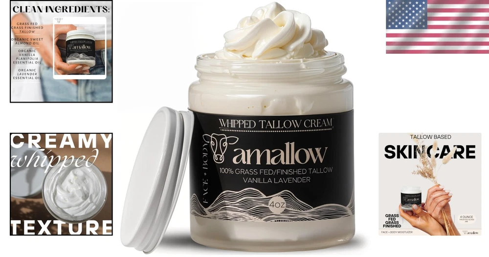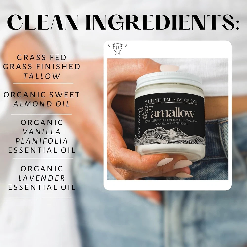 Scent: Vanilla Lavender, Vanilla, Lavender Features: Organic, Natural Ingredients, Anti Aging, Deeply Moisturizing, Non-comedogenic, Vitamin A, Vitamin D, Vitamin E, Vitamin K Body Area: Full Body, Face Ingredients: Beef Tallow, Almond Oil, Sweet Almond Oil, Organic Essential Oils Item Volume: 4 Fluid Ounces Item Dimensions L X W X H: 2.5 X 2.5 X 3 Inches Formulation: Cream, Lotion Brand: Unbranded Department: Unisex Product Dimensions: 2.5 X 2.5 X 3 Inches; 7.83 Ounces Period After Opening (PAO): 12M Expiration Date: Beef Tallow Skin Care Lotion gtin13: Does Not Apply Main Purpose: Moisturizer, Soothing, Nourishing Volume: 4 fl oz Active Ingredients: Sweet Almond Oil, Vitamins A, Vitamins D, Vitamins E, Vitamins K Size: Regular Skin Type: All Skin Types Special Feature: Anti Aging UPC: Does Not Apply Type: Daily Use Age Range (description): All Ages