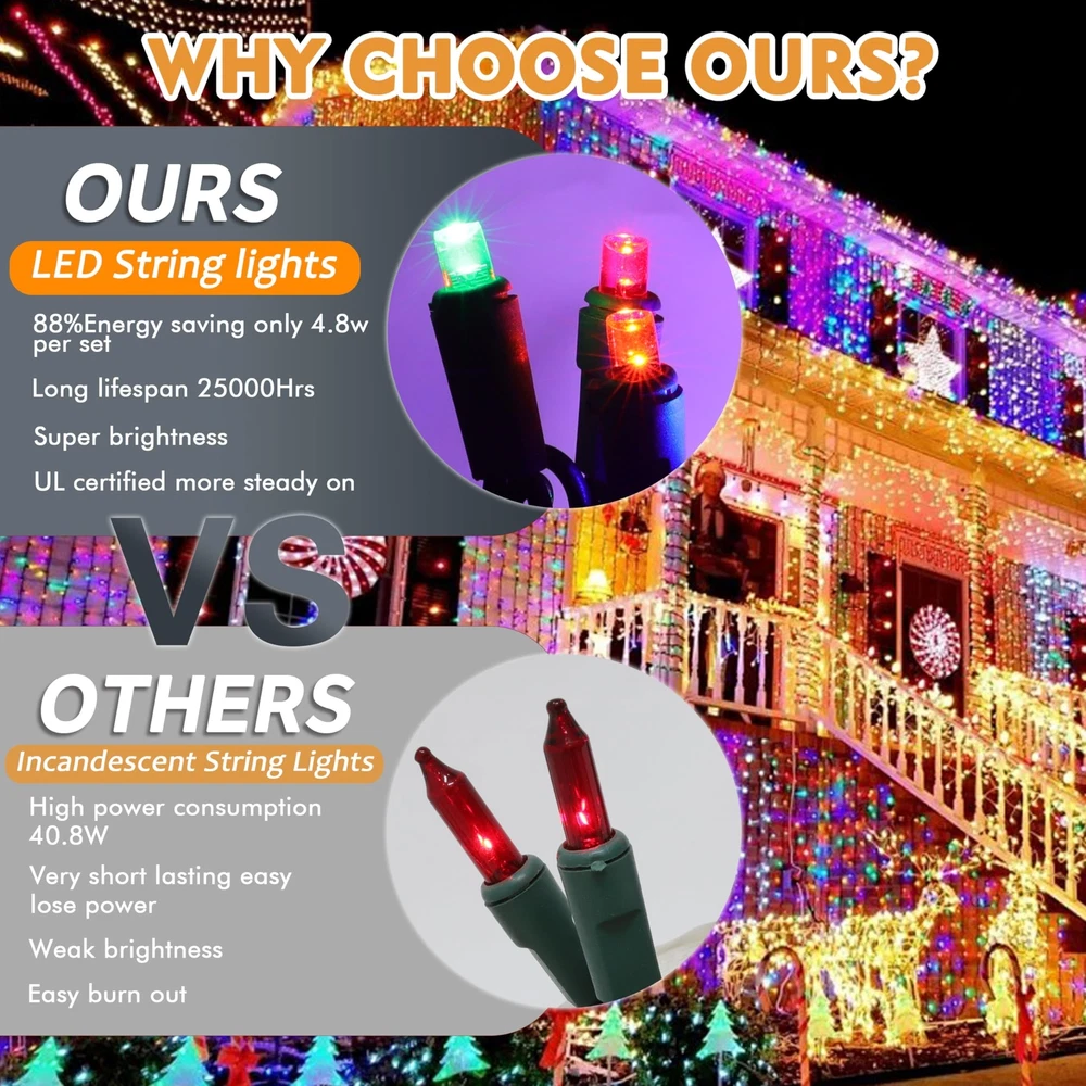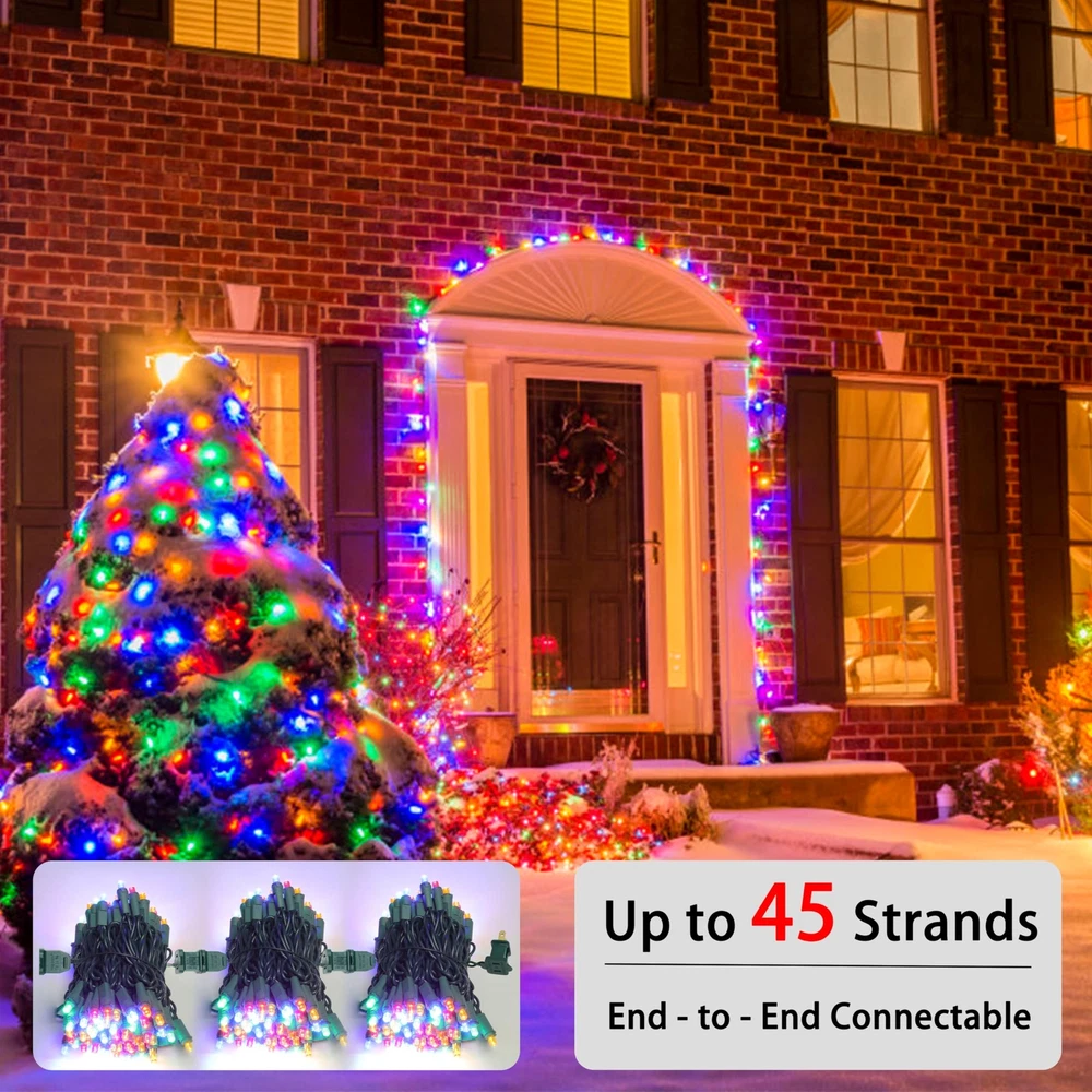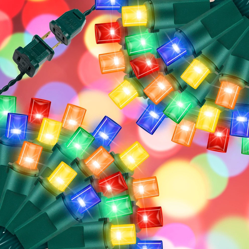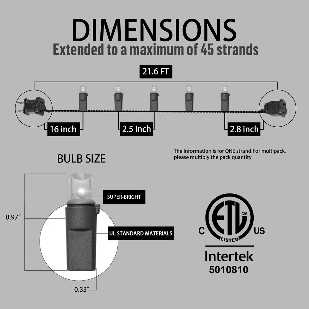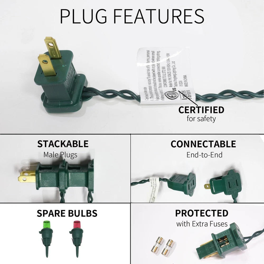 100 LED Christmas Lights with Green Wire, String Lights for Holiday Decorations, Christmas Tree Lights, Holiday Party, Wedding, Xmas, Home, Indoor & Outdoor Use (21.6FT-Multicolor) 100 White LED bulbs on green wire, 1 strand total length 21.6 FT. 2.48-inch spacing, 15.7-inch lead, 2.83-inch tail. Commercial grade 22 AWG wire with pure copper core, tough and heavy duty. ETL listed and premium quality,Leds use up to 90% less energy,The mini led light string is made with a male and female plug ,2 blubs and 2 extra fuses for replacements. Strings can provide extended use for end to end connections The entire string of lights has a power of 4.8 watts, with a rated maximum connection power of 216 watts, and can run up to 45 strands similarly. Series-parallel circuit structure allows bulbs to work separately when one or more bulbs are damaged, dropped, or extinguished. It does not affect the power, voltage, or current of the entire circuit. Even if a single bulb is damaged, the entire string lights will still be on. 25,000-hour average bulb life ensures lasting illumination for many holidays and years to come.Professional grade White string lights make decorating your home for Christmas a pleasure.