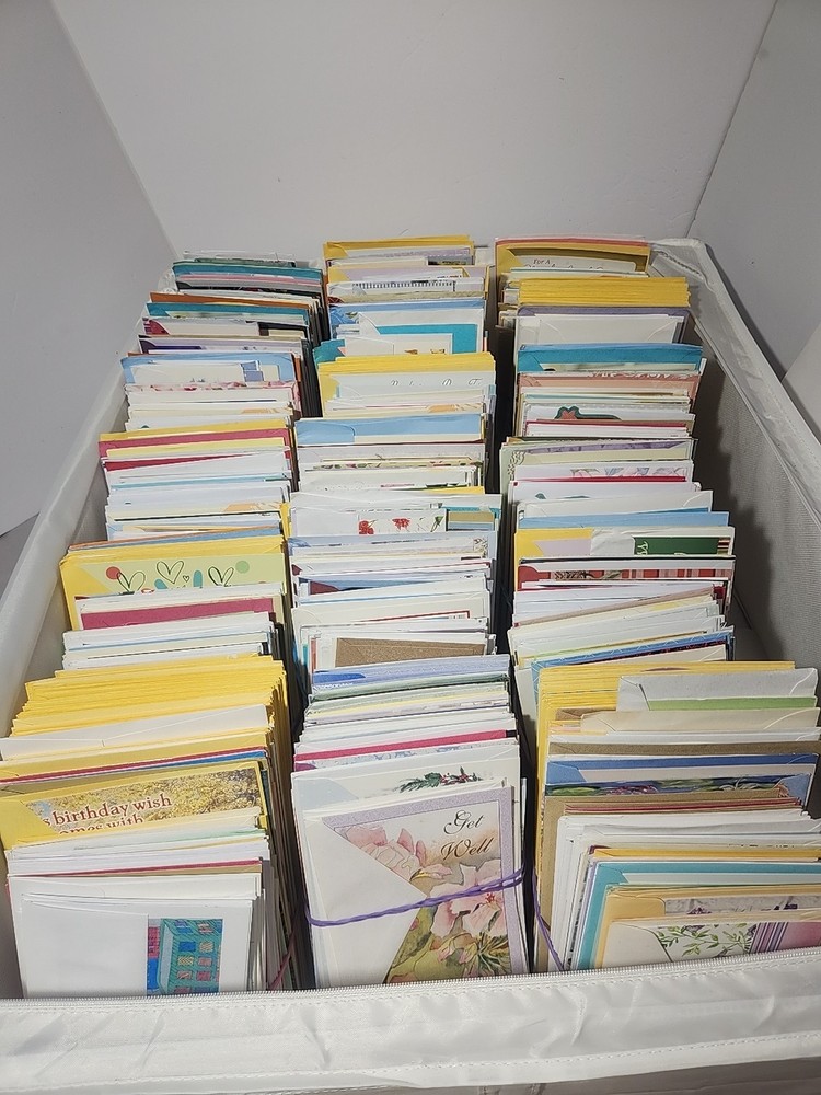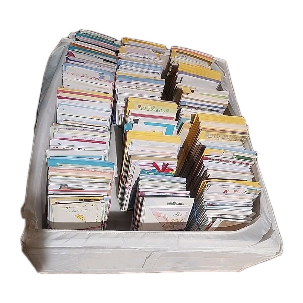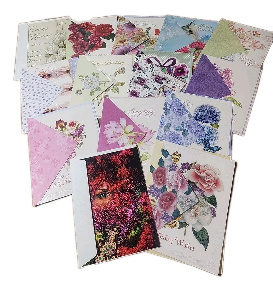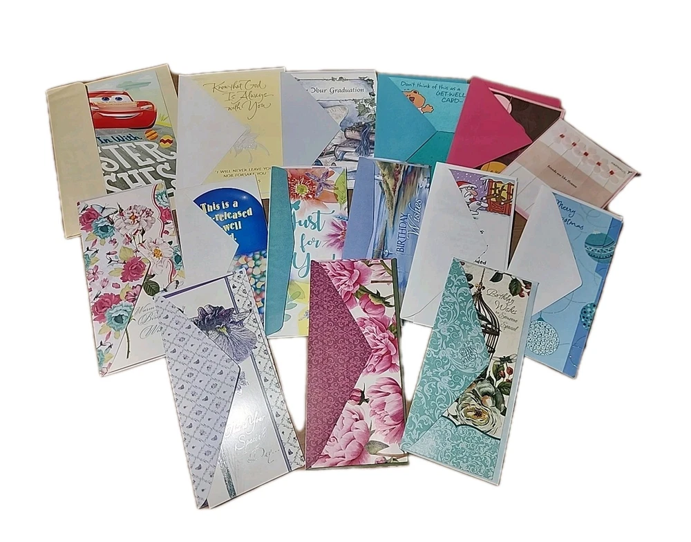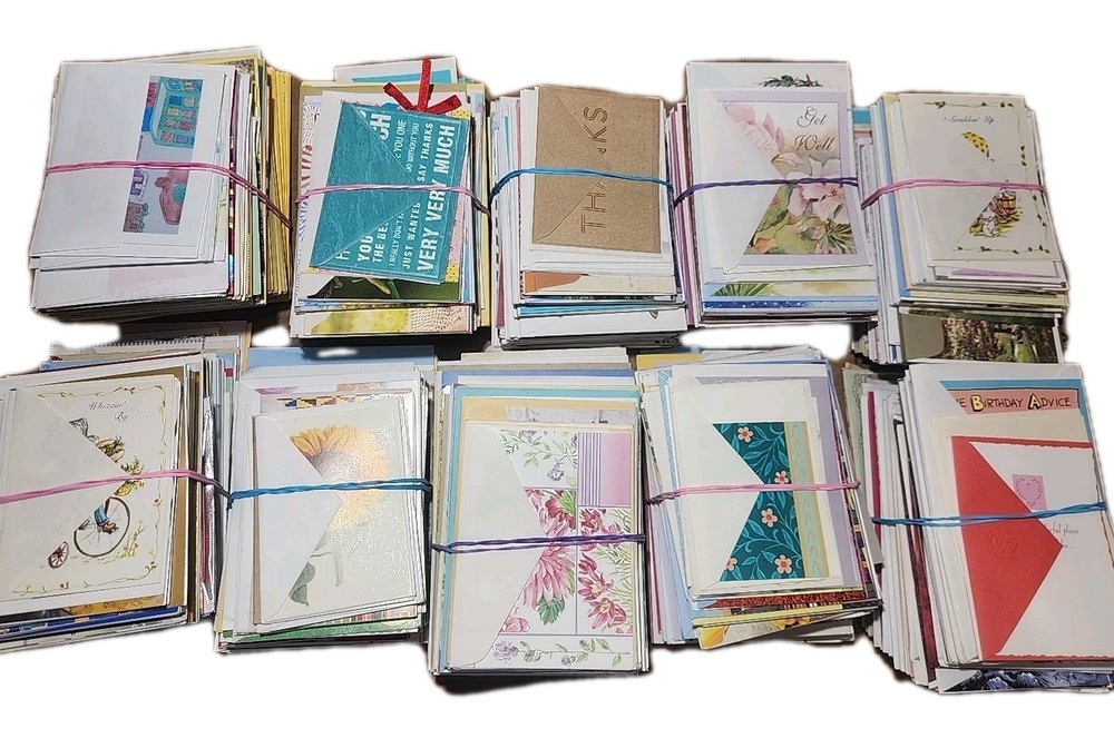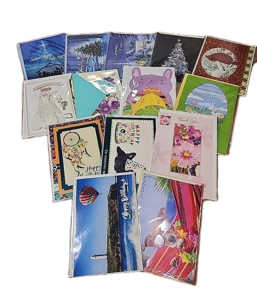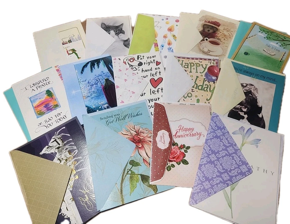 This lot includes 100 mixed greeting cards and envelopes, as well as 100 USPS forever stamps. The cards are high quality vintage to current, featuring assorted patterns, characters, occasions, and themes. The set includes a variety of multicolor cards from multiple brands like Hallmark, making it suitable for all occasions and recipients. Each card comes with an envelope and includes a stamp for easy sending. Perfect for home, garden, or office use, this assorted greeting card collection offers a wide range of styles to choose from. You will receive 100 NEW greeting cards with envelopes as well as 1 roll of 100 USPS Forever stamps sealed and ready for use (a $78 dollar value for the stamps alone!) . Categories of cards: Anniversary, Adult Birthday, Kids Birthday, Sympathy, Wedding, Baby Shower, Congratulations, Thinking of You, Thank You, Encouragement/Concern, Christmas, Easter, blank cards, & Special Days etc. I tried my very best to ensure there are no duplicates in each lot. With so many different cards i have taken pictures of random cards in these lots, those alone do not begin to show the vast variety within but are all cards from the lots, so some will receive those specific cards and others will not. If you would like photos of the exact lot you will receive just let me know. If you love a beautiful surprise of art to go through and find all the treasures within that works too. If you have any questions please ask. Thank you for looking.