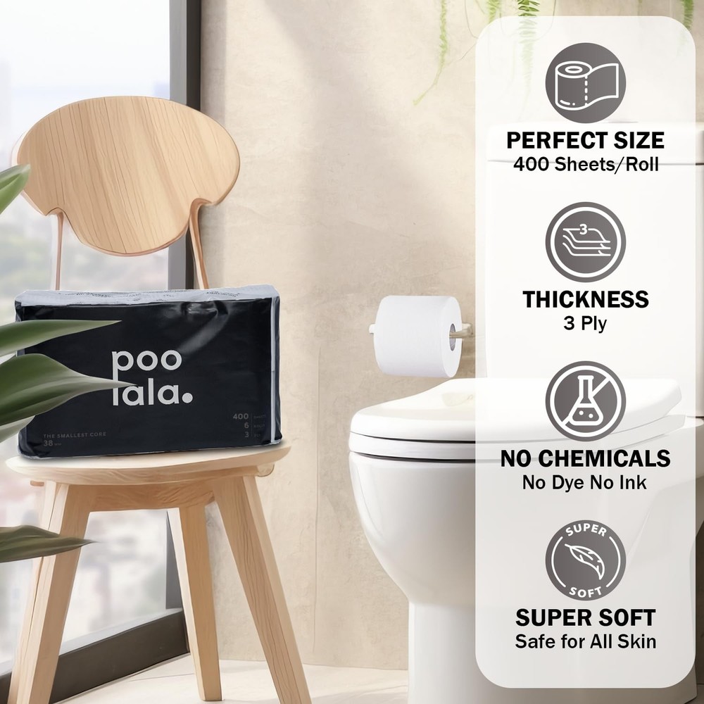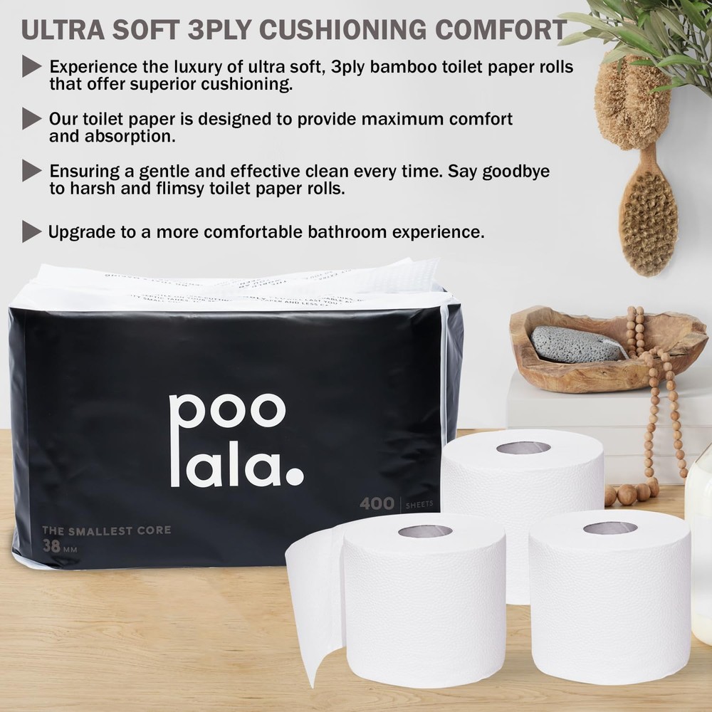 ULTRA-SOFT 3-PLY CUSHIONING COMFORT - Experience the luxury of ultra-soft, 3-ply bamboo toilet paper rolls that offer superior cushioning. Our toilet paper 3 ply is designed to provide maximum comfort and absorption, ensuring a gentle and effective clean every time. Say goodbye to harsh and flimsy toilet paper rolls and upgrade to a more comfortable bathroom experience. EXTRA-LONG ROLLS WITH 400 SHEETS - Each roll of bulk toilet paper rolls boasts an impressive 400 sheets, three times the length of an average roll. Enjoy fewer roll changes and more convenience with these extralong bathroom tissue toilet papers that keep you stocked up longer. Perfect for busy households, commercial use, or anyone who values convenience and quality! COMPACT 38MM CORE DESIGN - The innovative 38mm core design allows each roll of this septic safe toilet paper to have three times as many sheets as an average roll while maintaining a standard size. This ensures that it fit perfectly on most toilet paper holders, providing convenience without the bulk. Enjoy high-capacity toilet tissues rolls that save space and reduce the frequency of roll changes. 100% RENEWABLE & CHEMICAL-FREE BAMBOO - Our ultra soft toilet paper are made from sustainable, fast-growing bamboo, ensuring an ecofriendly and durable option. Free from harmful chemicals including inks, dyes, scents, and BPA, they are perfect for sensitive skin and allergies. Choose for a greener, safer, and gentler bath tissues toilet paper without compromising on quality. PREMIUM ABSORPTION, STRENGTH & COMFORT - These jumbo toilet paper rolls feature a premium fiber construction for exceptional absorption and strength, with an embossed texture that ensures a sturdy, reliable clean. Luxuriously soft and 3X thicker than leading brands, each chemical free toilet paper has three cushiony layers for ultimate comfort. Trust for a superior and comfortable bathroom experience. VALUE PACK & WORRY-FREE GUARANTEE: At such an excellent price, you'll get a pack of not just ONE but SIX Top-Quality Organic Bamboo Toilet Paper Rolls, each with an impressive 400 sheets. We have full confidence in the quality of 3 ply toilet paper. However, if they don't meet your expectations or if you have any questions or concerns, please feel free to reach out to us. We're here to help!!