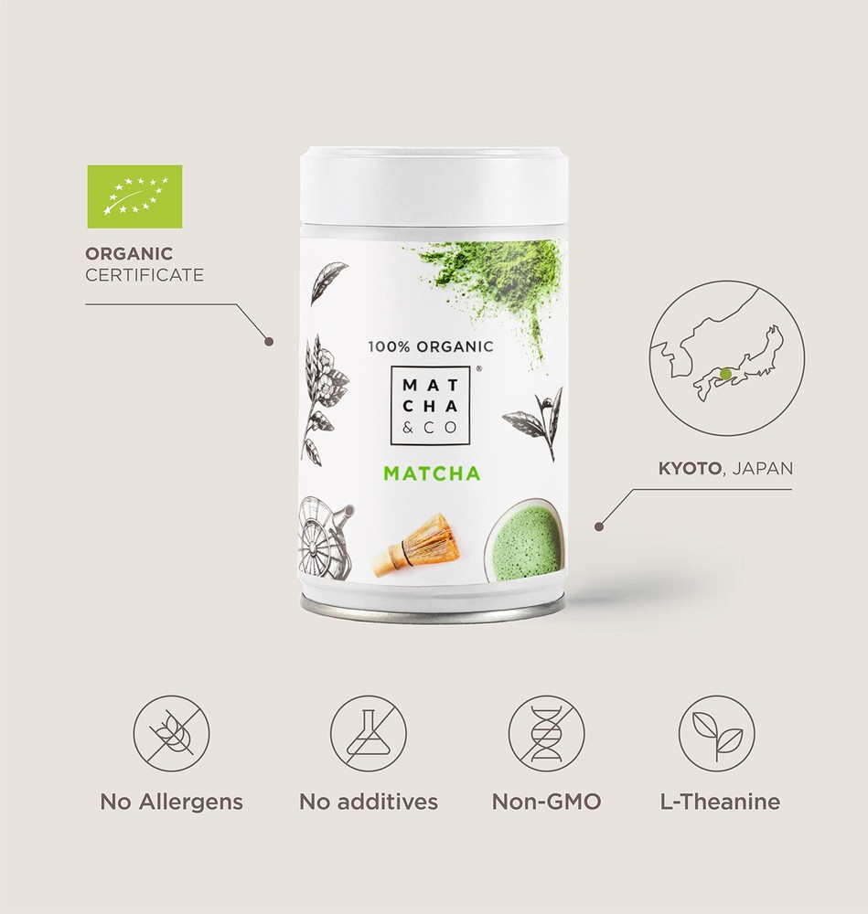 High-quality organic Matcha tea from Japan. A powerful antioxidant that provides energy and boosts metabolism. Free from colourants, preservatives, and sugar. 🧘🏽 High quality 100% organic Matcha tea from Uji, Japan. A powerful antioxidant that provides energy and accelerates metabolism. Free from artificial colours, preservatives and sugar. 🍵 With every dose of our organic premium ceremonial grade matcha tea, you'll support your brain function, enhancing focus, concentration, and mood. 🗾 Grown organically and sustainably in the tea fields of Uji, Kyoto; our matcha comes from the finest green tea leaves. Harvested by hand in the spring and autumn seasons, ground in stone mills for the best texture, aroma and purest flavour. ♻️ For , quality and sustainability go hand in hand. All our products are certified organic, so we do not use pesticides, colourings or preservatives, the plants used for this matcha tea are not genetically modified (GMOs). The packaging is 100% recyclable.