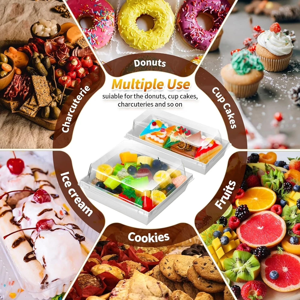 100 Pack 2 Size Paper Charcuterie Box with Clear Safety Lid 5'' White Product Details Brand: Yuxung Color: White Material: Paper, Plastic Material Feature: Non-Toxic, Disposable Product Dimensions: 16"L x 12"W x 6"H What You'll Get: the package includes 100 pieces of white paper food containers with lids in both rectangular and square styles, 50 pieces for each style, the size is shown in the picture, enough for your needs and replacement to display different foods Quality and Safe Materials: made of sturdy cardboard and plastic cover, the charcuterie box is waterproof and oilproof, tasteless and safe to use, can be directly contacted with food; Please note that this box is not high temperature resistant and cannot be heated in an oven Convenient to Carry and Display: the square sandwich transparent lid container fits closely with the slot on the edge of the lid, which has good sealing performance and prevents the food from spoiling; The transparent large window design allows you to clearly see the delicious food, which is convenient for packaging and carrying Grease Resistant Coating: each single use box has a polyester coating that prevents sauces or oils from soaking through, you can use it to hold a variety of different types of food, whether it's cream cakes or fried foods, and they stay intact save Multiple Uses: these paper food boxes are ready to use for desserts, roll cakes, baked goods, sandwiches, hot dogs, fruit salads, sushi and other foods, ideal for family meals, party gatherings, coffee shops, cake shops, and more