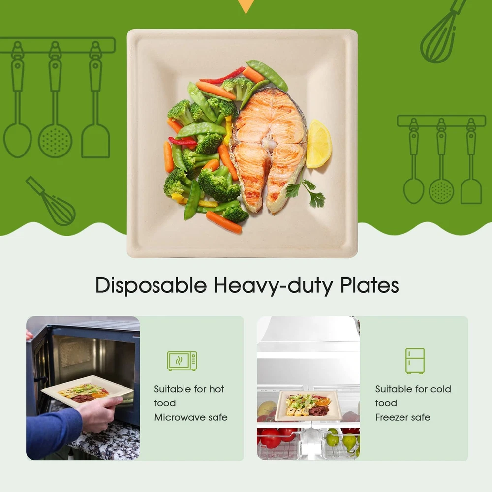 About is committed to producing high-quality disposable eco-friendly products. All our products are made from rapidly renewable plants that do not cut down trees and contain no plastic. From the plant to our products, they return to nature after use, reduce carbon emissions, and are very friendly to the environment, so you can enjoy the convenience of disposable products with peace of mind! Compostable raw materials As we all know, traditional disposable plastic products have brought a lot of trouble to our environment, it takes hundreds of years to degrade and is very unfriendly to the environment. Our eco-friendly paper plates are made of sugarcane fiber, a fast-growing plant. They are 100% plastic-free and can be completely composted within a few months, it is the best substitute for the traditional disposable paper plates or plastic plates. Convenient and time-saving After the party, you won't have to worry about those messy plates. Our plates can carry food scraps directly to the compost bin and enjoy the convenience of using disposable cutlery without fear of harming the planet. At the same time, free your hands, so that you have more time to spend with family and friends. Sturdy and durable Our eco-friendly disposable plates are made from high-quality plants fiber. Suitable for refrigerator and microwave. Great for hot and cold food. Heat resistance, oil resistance and cut resistance. It doesn't get sticky when it's used to hold liquid food. Applicable scenarios 100 pack 10 inch plates in a simple atmospheric natural look, Great for dinners, parties camping, weddings, birthdays, BBQs. Available for steaks, salads, desserts, appetizers, cakes. It can be used for Christmas or New Year. 10-inch Sugarcane Plates: Set includes 100 Pack 100% compostable 10 inch heavy-duty square paper plates, The bagasse plate can be matched with any food, perfect for serving sandwiches, burgers, pasta, salads, baked beans, french fries, fruits Compostable Material: Compostable plates are made from 100% sugar cane fiber, Different from wooden and plastic plates, these sugarcane plates don't need to be broken down for hundreds of years, They can compost in the backyard, it only takes 3-6 months Durable Plates: Our biodegradable boards are microwave and freeze safe, they can be used for both hot and cold foods, and disposable sugarcane boards have good oil, heat, and cut resistance. When you use them, you don't have to worry about them breaking Safe and Healthy: We are committed to providing safe and healthy disposable biodegradable plates set, They are BPA-free, wax-free, gluten-free. You no longer need to worry about the possible health problems caused by disposable products Suitable for any Occasions: These disposable sugarcane plates are perfect for daily meals, birthdays, camping, picnics, wedding. When your friends are together, you don't need to worry about cleaning work, free your hands from washing dishes