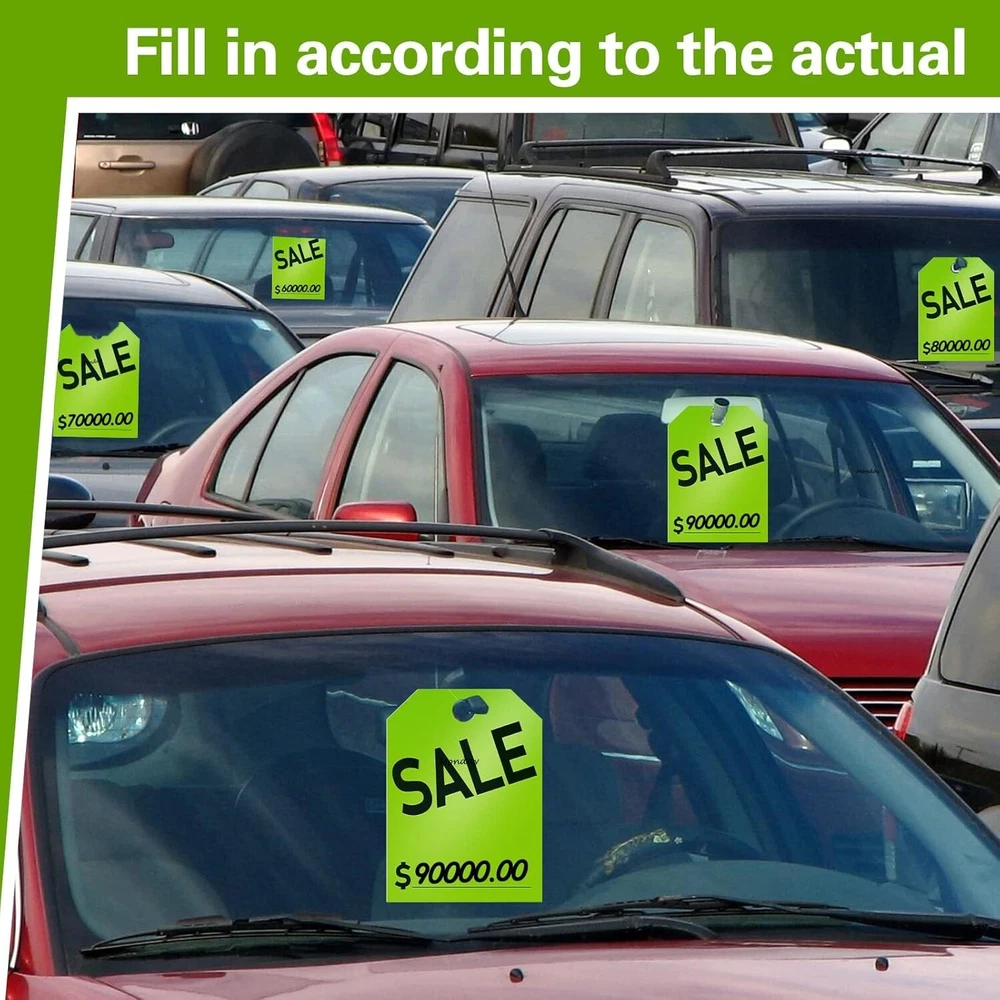 100 Pack Sale Tags Car Dealer Mirror Hang Tags 8.5 X 11.5 Inches Sale Price Tags. About this item: Ample in Quantity: package includes 100 pieces of mirror hangers for car in green colors, adequate quantity is enough for your daily use, replacement and sharing demands, which can serve you for long time Suitable Size: each vehicle rear view mirror hanger measures approx. 21.5 x 30 cm/ 8.5 x 11.8 inches, the large size is easy to be noticed by others, fits for most cars and places, and you can share them with others Smooth to Write: these car dealership tags are made of quality paper material, so smooth to write, thick enough and not easy to penetrate, so you can write down the car information on them smoothly, providing you with a nice use experience Multifunctional Design: on the front of our vehicle hang tags, there is a blank writing space to fill in, you can use a maker to write vehicle information, price and so on, which bring a lot of convenience for you Applicable for Various Places: car mirror hanger is designed with a precut hole, making it easy for you to hang it on most surfaces, such as cars, rearview mirrors, handle sections and so on, saving your time and effort