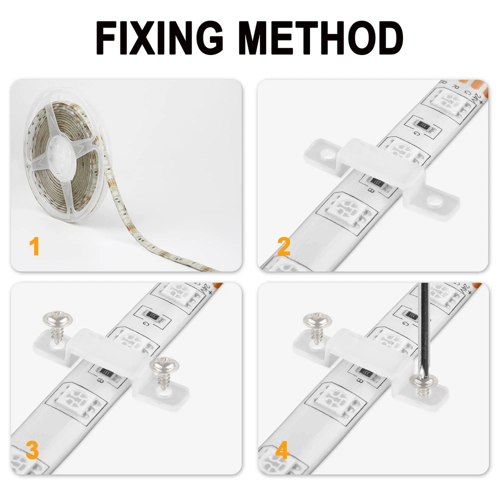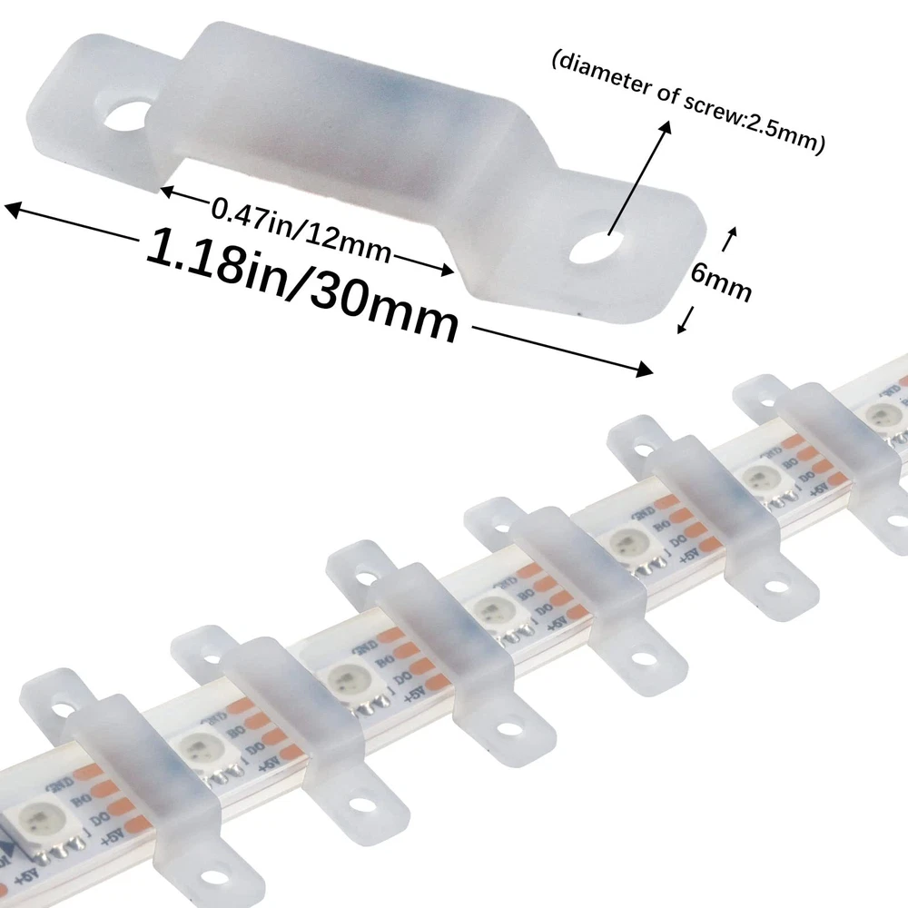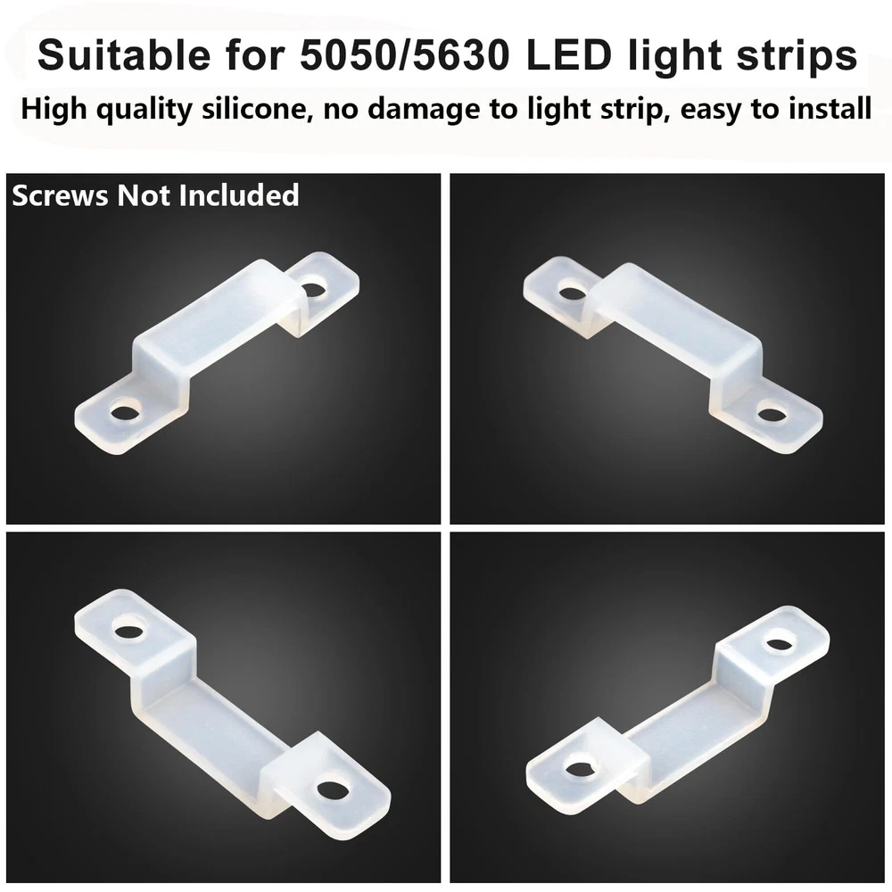 Premium Material: Led silicone holder clips are made of high-quality silicone, corrosion and high temperature resistance, lightweight and durable. the soft body can protect the LED light strips from damage. (screws not included) Ultra thin design: The transparent led strip light clips clip is unobtrusive, does not affect the appearance, and is very suitable for your home decoration. Easy To Install: It is convenient for you to install the led light strips, and using these led silicone mounting bracket, you can hold the led light strips firmly. Wide Application: Led strip light silicone fixing clips is suitable for 10mm wide light strips, such as SMD 5050/5630/3528 10mm wide led strip light. Recommend to use 3-5pcs for 1 meter strip lights. What You Get: Comes with 100 pcs LED strip clips 【 NOTE: Screws Not Included 】The diameter of the screw holes reserved at both ends of these mounting clips is 2.5mm, you need to match the appropriate screws to this size in addition. If you happen to have screws of this size in your hand, then this product will be perfect for you.