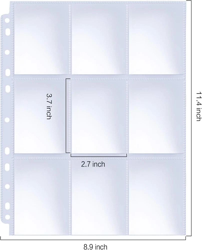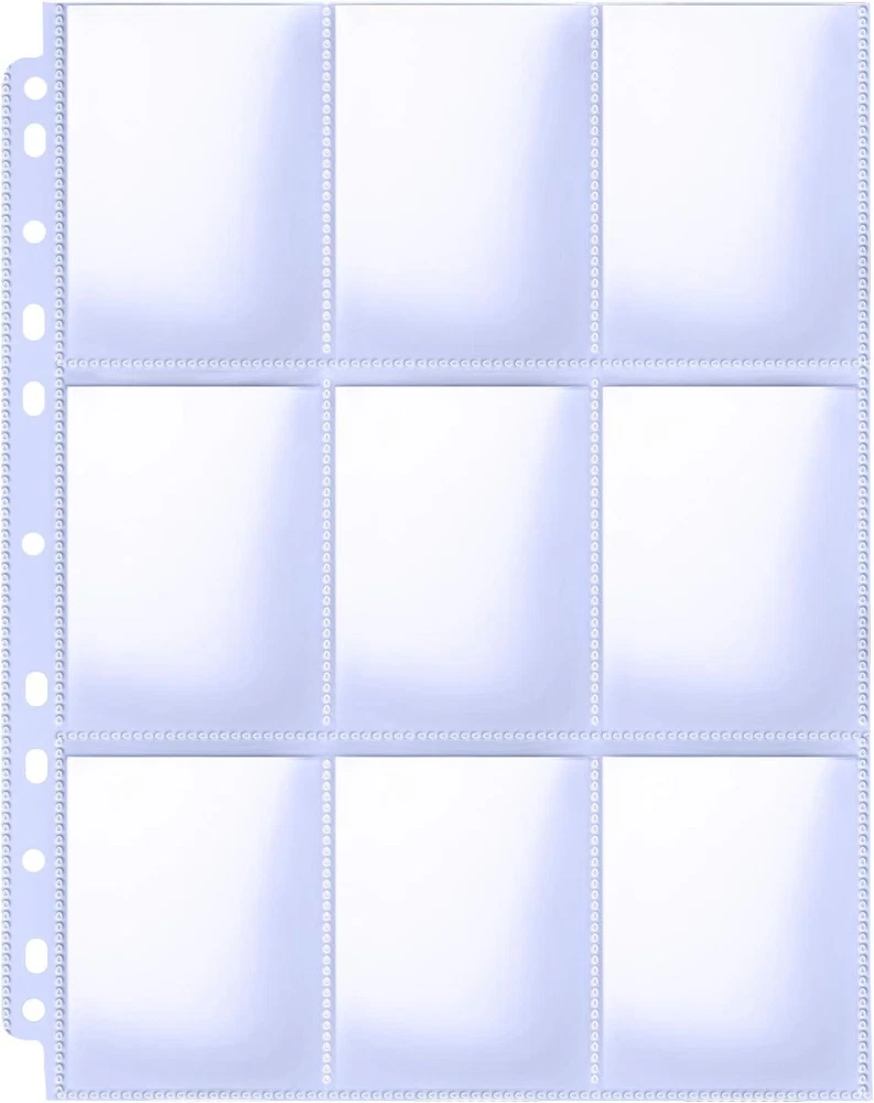 100 Pack Toploader Binder Pages 9 Pocket Page Protector for Trading Sports Cards Double Side Display: Total 900 pockets of 100 pages, 9-Pocket for each page protector. 100 pages, you can put two cards in one sleeve. Page protector fit for a standard 3-ring binder Premium Quality: Made of clear polypropylene practical quality, non-toxic, no PVC, acid free, super sturdy so it won't get bend up in the mail. Provides security for you to store and protect your trading cards, pokemon cards and baseball cards.Suit for Thanksgiving and Christmas Universal Dimensions: Page Dimensions: 8.9" x 11.4". Pocket Dimensions: 2.7" x 3.7"(69mm x 94mm). Great for storing trading cards and organizing coupons. Also ideal gift for your kids to organise pokemon game cards, top trumps, stickers, gaming cards stamps and more Top Loading Design: Insert or take out your cards from the upside, not easy to slide out, great for card storage and display. 900 pockets to double sleeve your cards. Thick sturdy plastic pockets give your trading card extra protection