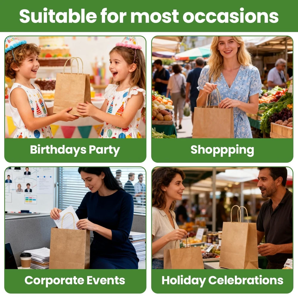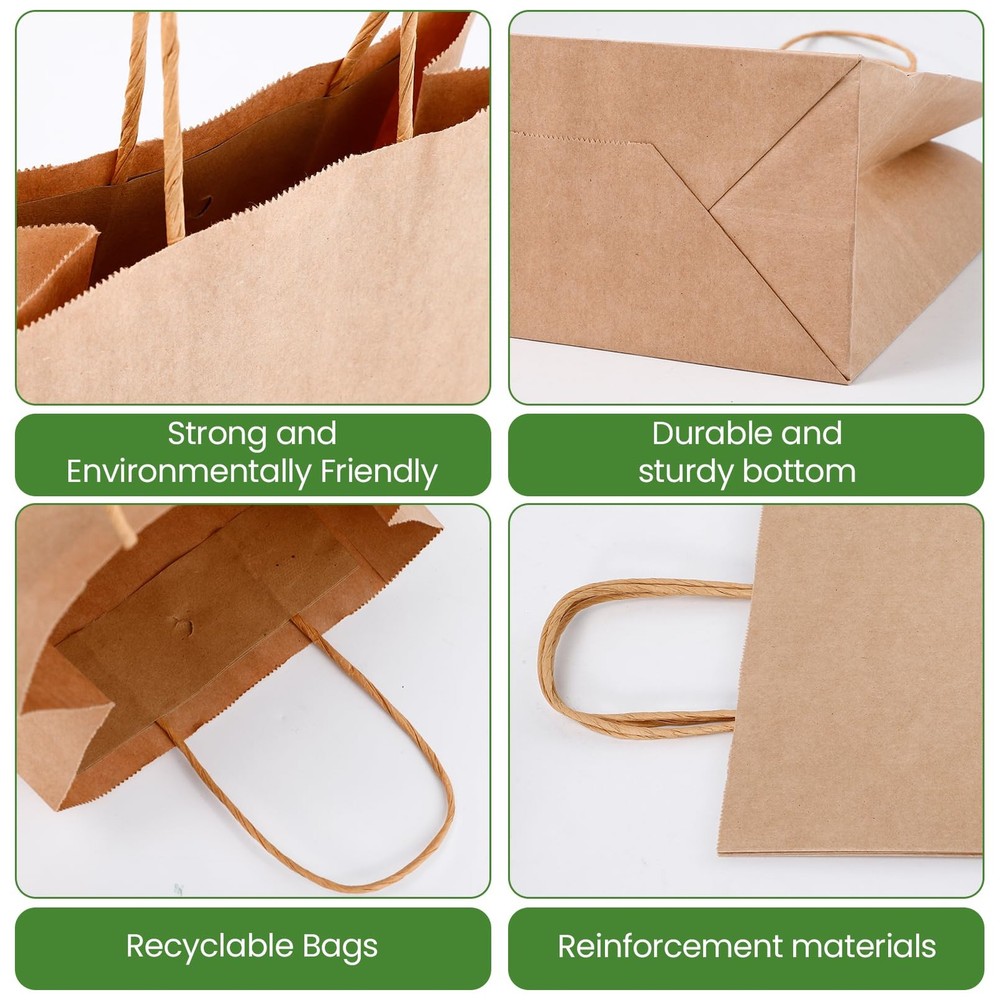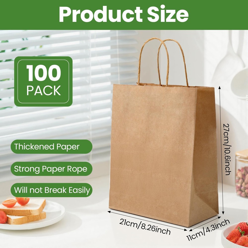 This package includes 100 durable kraft paper bags measuring 8x10x4.3 inches, featuring sturdy handles for secure carrying and a reusable, recyclable design that reduces plastic waste. Suitable for DIY customization, these versatile bags allow you to personalize them with creative patterns and text to suit any occasion. Great as gift, party, or retail bags, they reliably hold small to medium crafts and items. Color: brown Material: kraft paper material Size: 8x10x4.3 inches/21x27X11cm Packaging Includes: 100 pcs kraft paper bags with handles Note: 1. Please confirm the size before purchasing. 2. The size may have slight errors due to manual measurement. 3. Please allow slight color difference due to different monitors. Package include: These gift bags are made up of 100 pcs kraft paper bags, The sizes of these bags are 8X10X4.3inch, the quantity to meet your daily needs. It is great for holiday gift bags, party gift bags, retail bags,commodity bags Reliable material: The paper bags are made of kraft paper, which is more durable and sturdy. The kraft paper bags with Handles are easy to open and strong enough to carry all the small items you put in Recycling Paper Bags: The small paper gift bags with handles are reusable and recyclable, use these bags instead of traditional plastic bags to help reduce waste and more upscale look than plastic Unleash Your Creativity: Our paper brown bags bulk are great for DIY decoration, you can use your imagination to add the words and patterns you want on it, personalize them in any way you like, make it fits for many accossions Multiple Occasions: Small Brown paper bags with handles are used for goodie bags, party bags, wedding bag, cookies bags and more. It is suitable for holding various small and medium-sized crafts or light artworks without fear of damage