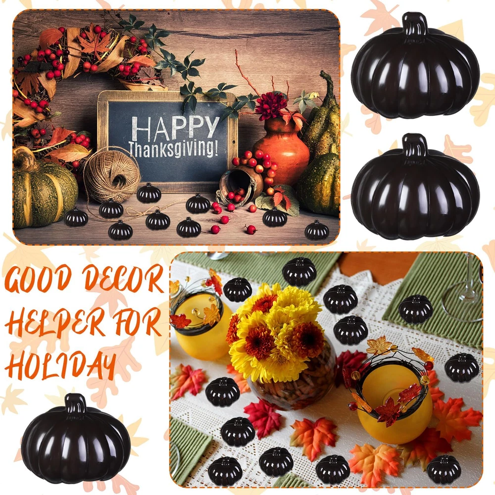 Features: Our fake decorative pumpkins boast lifelike detailing, making them a convincing alternative to the real thing. From the stylish shape to the stem details, these pumpkins aim to deliver the most realistic look. Looking for an unconventional yet thoughtful present? These charming and fun pumpkins fall decors make a delightful gift for those who love autumn or have an interest in interior decoration. Specifications: Material: plastic Color: black Size: about 1.38 x 1.18 inches/ 3.5 x 3 cm Package includes: 100 x Black pumpkins for decorating Notes: Manual measurement, please allow slight errors on size. The color may exist a slight difference due to different screen displays. Plentiful Quantity: this set includes 100 pieces of fall artificial pumpkins for outdoor, providing you with a substantial volume of cute mini pumpkins to spread around your home or workplace, this makes them a reasonable solution for your fall themed or Thanksgiving decorations Authentic Design: our fall plastic decorative pumpkins are designed to replicate the natural black color of real life pumpkins, adding an authentic touch to your fall decor; This vivid black color can create a warm and nostalgic ambiance for your holiday gatherings Ideal Size: our black pumpkins for decorating come in a mini size of approximately 1.38 x 1.18 inches/ 3.5 x 3 cm; This compact size makes them the ideal fit for your table centerpieces, fireplace mantels, or other places where space is a concern Material Durability: made from sturdy plastic, these fall mini pumpkins are designed to last, they're resistant to wear and tear, lightweight and portable, ensuring their vibrant color and charming appearance remain intact over time Versatile Applications: these fall mini pumpkin decorations offer versatility in terms of decoration, you can use these as coffee table decor, adorn your living room shelves, or even fill a glass jar for a creative display; And they're also available for DIY fall wreaths, rustic centerpieces, or holiday flower arrangements, you can also use them to decorate the table, backyard, garden, fall themed parties, weddings, celebrations, and more