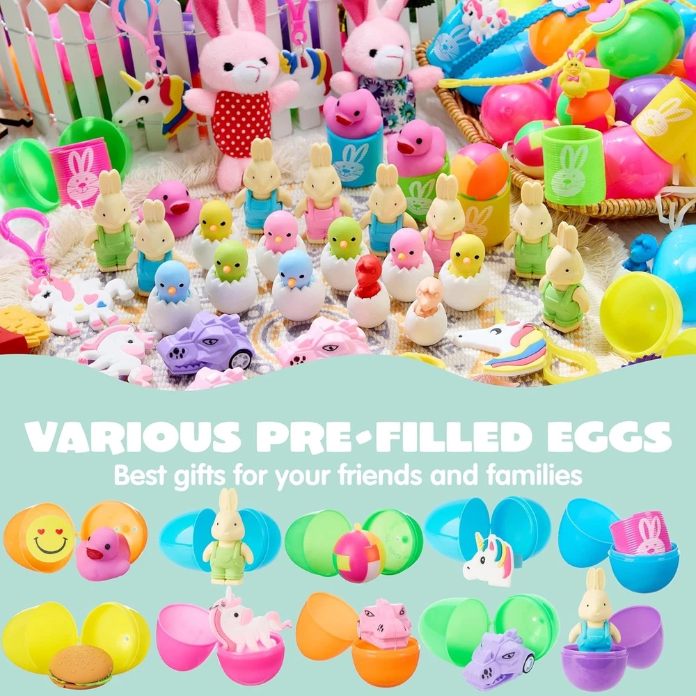 100 Pcs Prefilled Easter Eggs with Toys Plus Stickers, Filled with Toys Party Favors for Kids Boys Girls Easter Eggs Hunt, Basket Stuffers Fillers, Classroom Prize Supplies Super Value Pack: Each egg is prefilled one toy and one easter sticker; 100 Pieces Toy Prefilled colorful printed Easter Eggs include 18 Unique Types of toys including Mochi squishy toy, Erasers, Little Ducky Erasers, Bunny Erasers, Easter Bracelets, Pull Back cars, Easter Rubber Rings, Rabbit Dolls, Unicorn Keychain, and Dinosaur, etc. Multiple Fun Toys: Most Valuable and Durable 100 Easter Eggs set. High Quality 100 Toys Set Filled in ” Tall Easter for Easter Eggs Hunt. Versatile Easter Eggs: Elevate your Easter festivities with these delightful prefilled eggs. Perfect for egg hunts, basket stuffer fillers, thoughtful gifts, or vibrant decorations, these eggs add a burst of color and joy to every Easter activity. CHILD SAFETY: Meet US Safety Standard. Safety Approved. Non-Toxic. Higher Quality. Made of Hard Recyclable Safe Polypropylene Thick Plastic. Versatile Easter Eggs: Super Value Pack for Easter Egg Hunt Event, Birthday Party Supplies, Easter Basket Stuffers, Party Favor Goodie Bags, Scene and Decoration, Parties Prizes, Trick or Treat, School Classroom Rewards, presents, Miniature Novelty Toys, Grab Bags and Pinata Filler, Spring Summer Toy Pack, Home Prize Box, Bath Time, a Themed Party, School Activities, Carnivals and more!