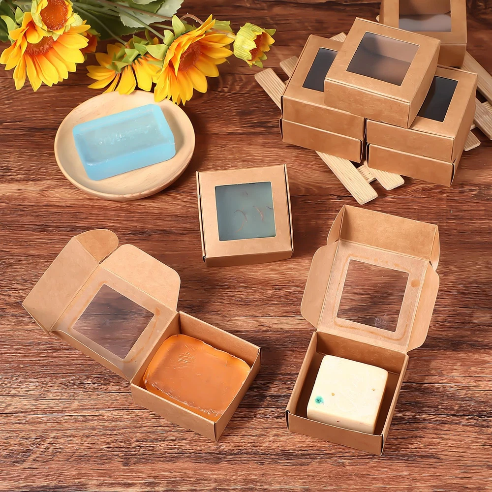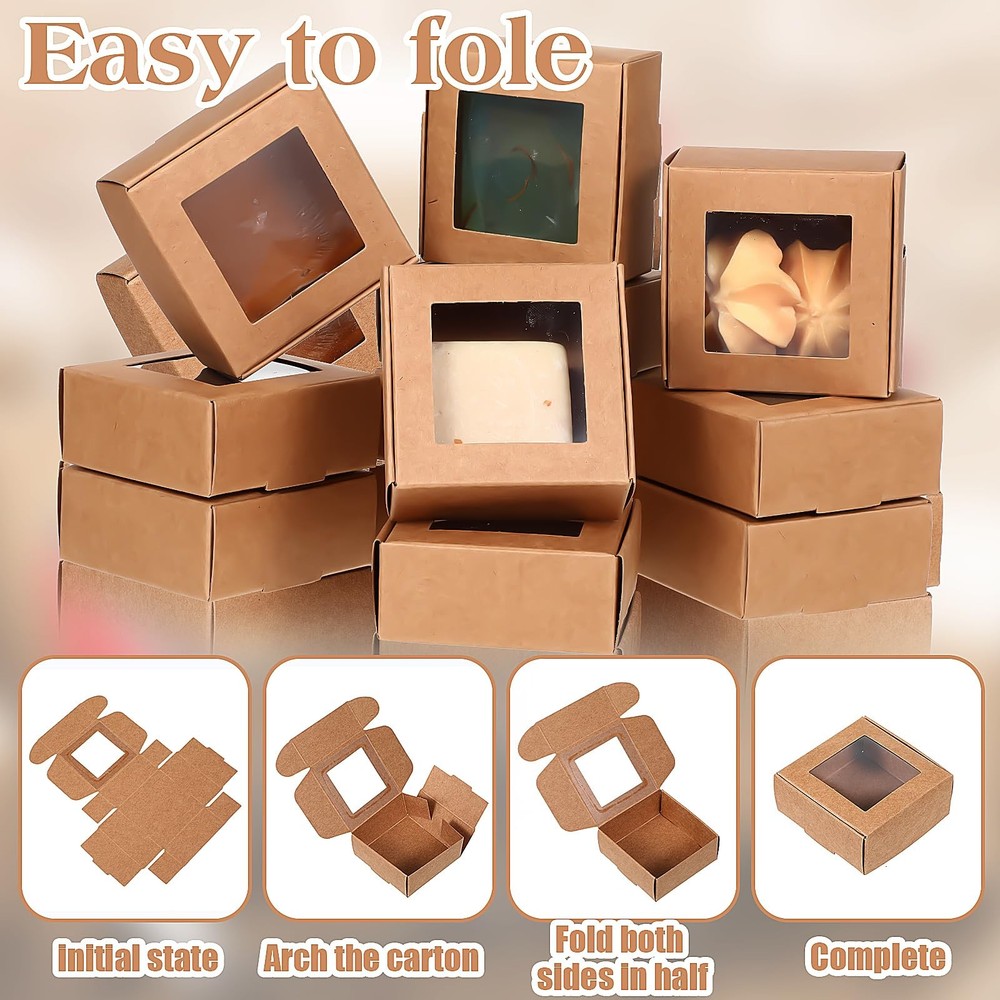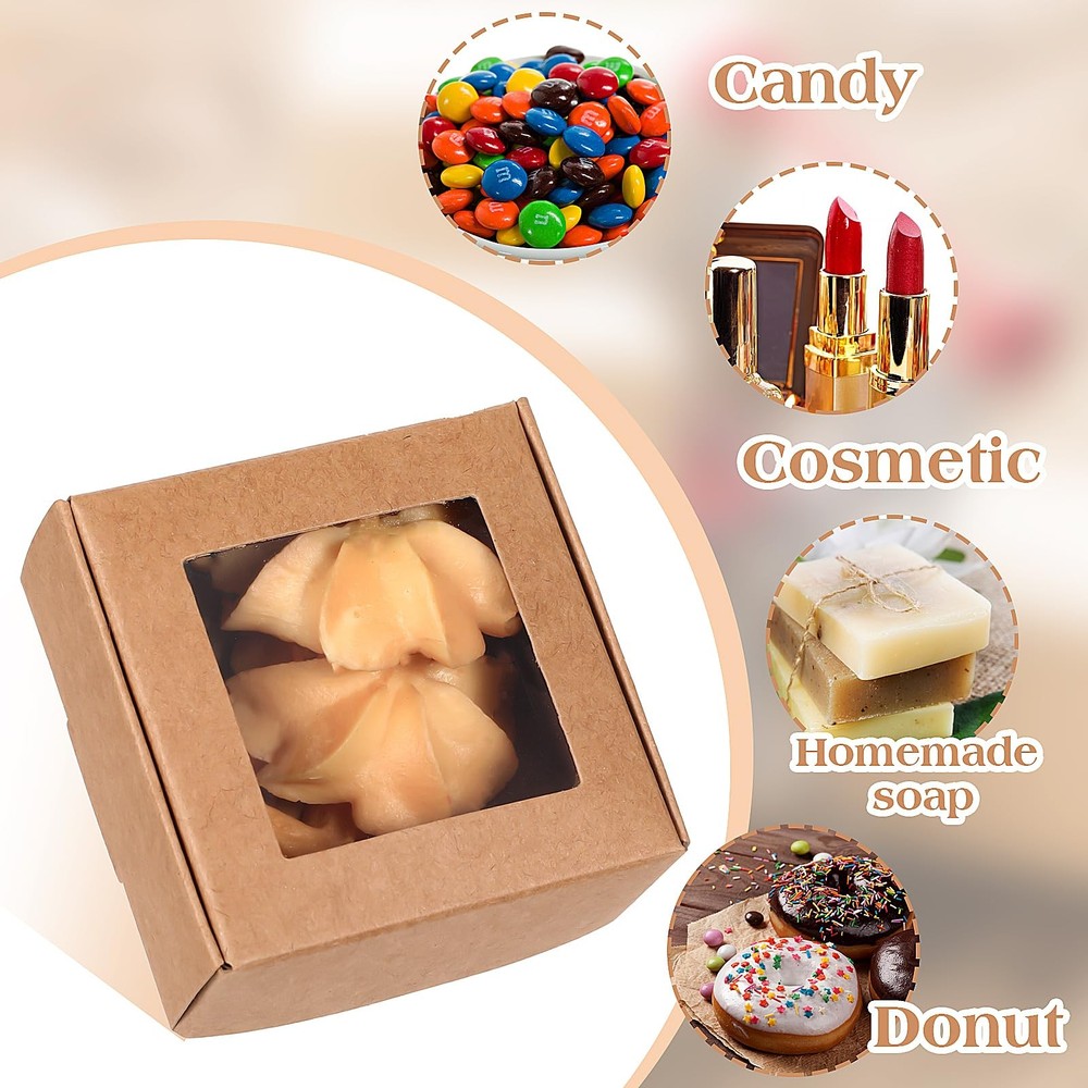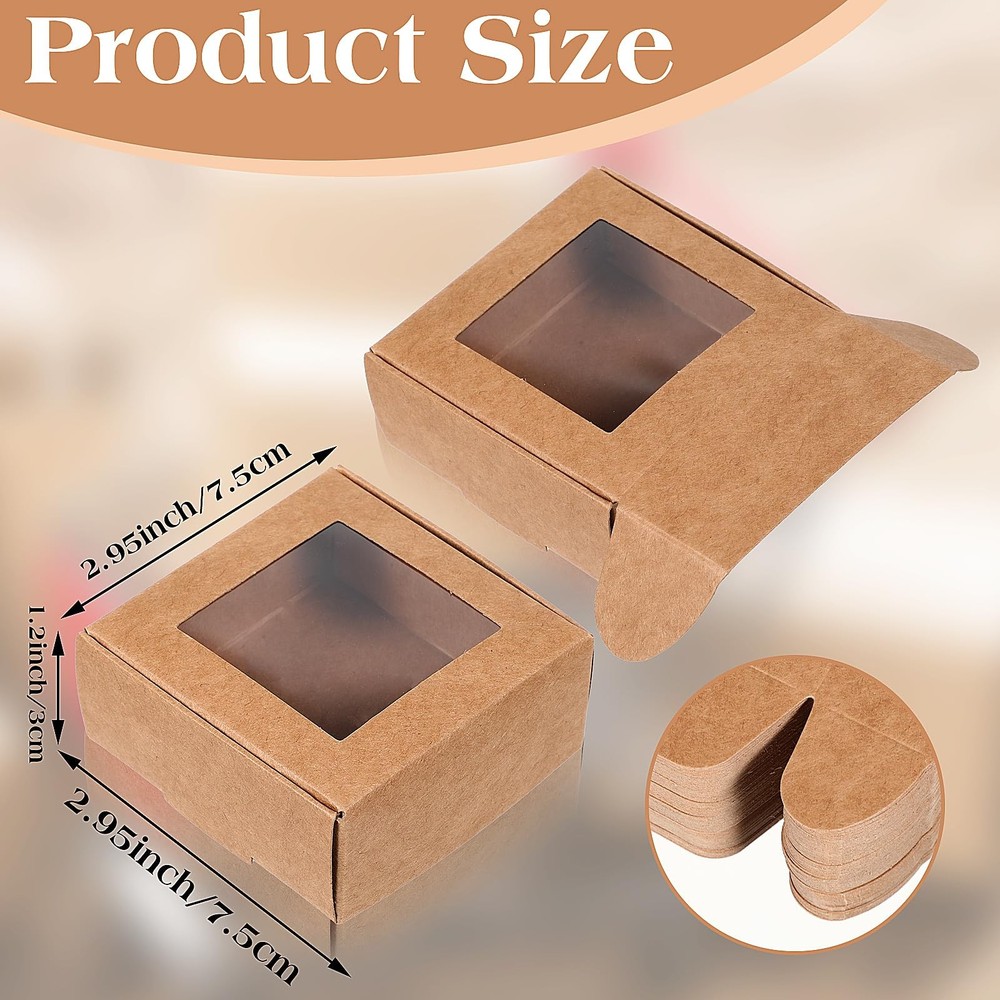 Easy to take around: When you want to go camping, picnic, graduation ceremony, and more outdoor activities, you can carry these mini shipping boxes to hold many foods without taking too much space, handy and portable. Bulk gifts: You can send these treat boxes to your classmates, teachers, family members, partners, and more that you cared on Christmas, Halloween, birthday and more. They will feel warm and surprised after receiving such delicate gifts. Specifications: Material: kraft paper Color: brown Size: approx. 2.95 x 2.95 x 1.2 inches Package includes: 100 x Kraft mini treat boxes Notes: Manual measurement, please allow slight errors on size. The color may exist a slight difference due to different screen displays. Sufficient Quantity: there are 100 mini cardboard boxes with rectangular windows, which can hold your handmade soap, candy, jewelry and more; Sufficient quantity can easily meet your daily use and replacement needs; Do not forget to share with others Clear Window Design: these soap packaging boxes are designed with transparent windows, allowing you to distinguish the items inside; In this way, you will find what you need more convenient and quickly Sturdy and Trustworthy: these rectangular brown boxes for gifts are made of quality kraft paper material, safe and reliable, strong and lightweight, reusable and tear resistant; You can also assemble them without other tools Compact Size: the external size of these small candy boxes for gift giving is about 2.95 x 2.95 x 1.2 inches after folding, which is enough to accommodate various small items, and they can be folded flat to save storage space, bringing you much convenience in daily life Extensive Application: these kraft gift boxes are not only suitable for packing soap, but also can be widely applied for packing candies, biscuits, chocolates, crafts, small gifts and cosmetic samples, suitable for various parties and celebrations