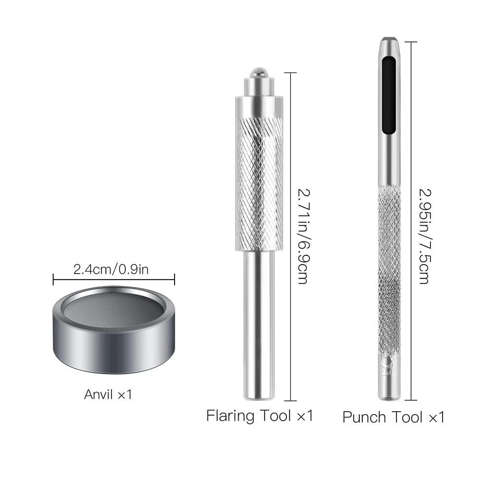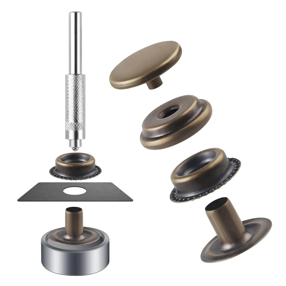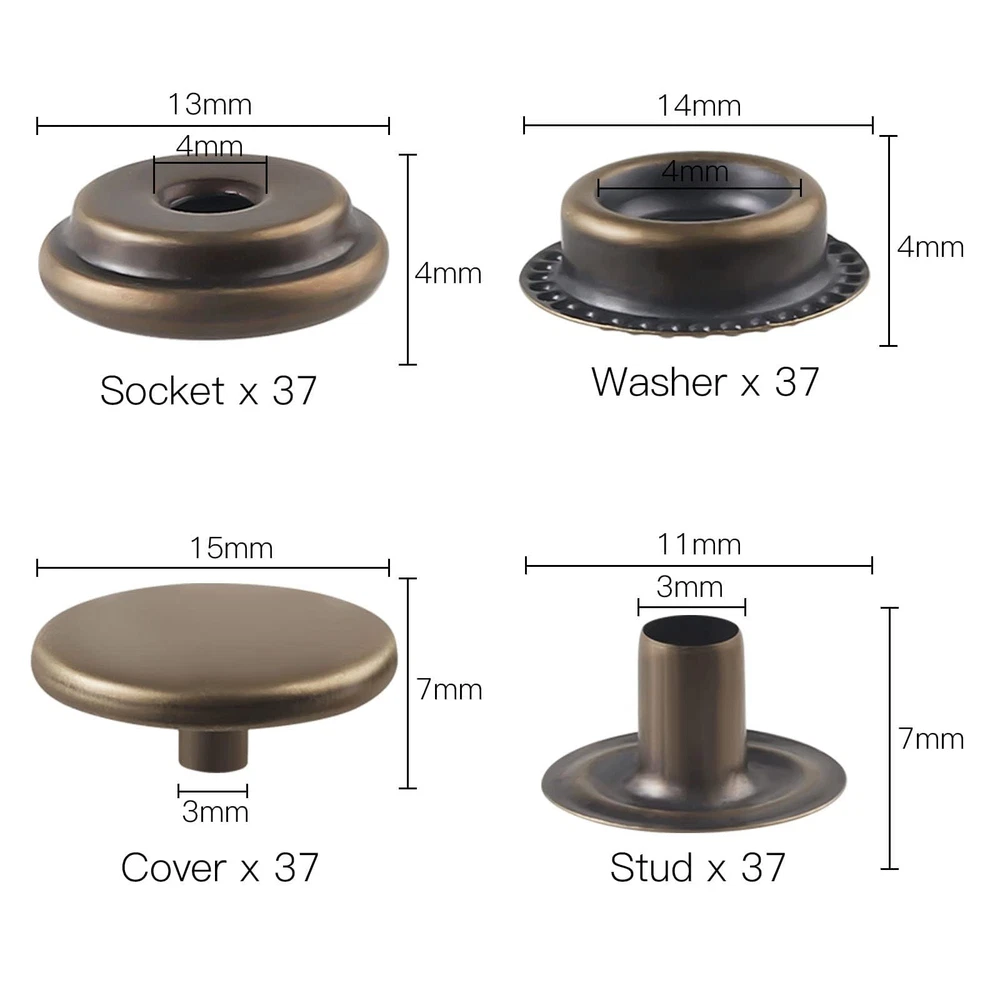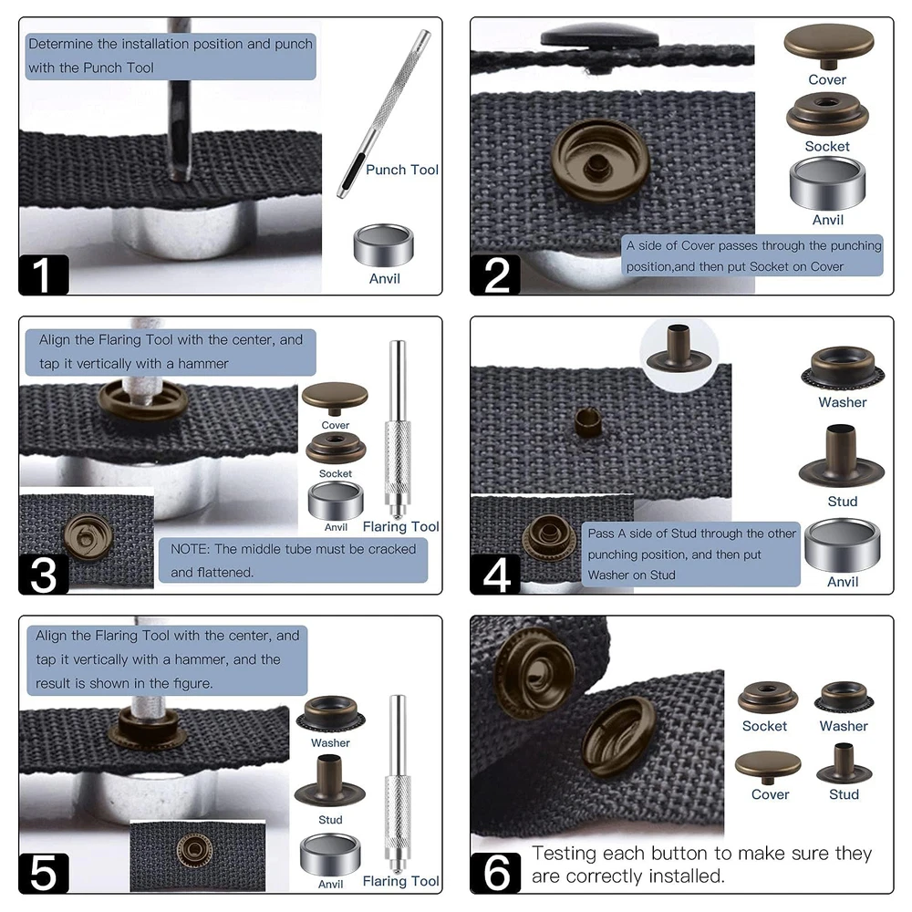 【Package Included】The package comes with 18 sets of snap fastener kits, which contains 4 small parts, including cover, washer, socket and stud, and also comes with 3 pieces of installation tools. If you have any questions, please feel free to contact us. 【Premium Quality】Made of quality materials, durable, corrosion, and rust-resistant. Perfectly suitable for various environments such as areas with high humidity or cold weather, durable enough to serve you for a long time. 【Product Size】The diameter of the cap is about 15mm/0.59 inch. NOTE: Suitable for light to medium fabric, not for thick fabric (such as wool blankets). Lightweight fabrics, mesh, knitted fabrics, stretch fabrics and fabrics with wear on the surface should be lined on the back to prevent them from breaking away and tearing the fabric. 【Widely Applications】The snap button can provide effective solutions for repairing fabrics, such as wallets, suitcases, clothing, shoes, belts, backpack, watch wristbands, leather crafts which are made of leather, canvas, nylon fabric, and so on. 【After-Sales Service】We are committed to providing customers with the best shopping experience, so if you have any questions about the Snap Fastener Kit Tool, please contact us