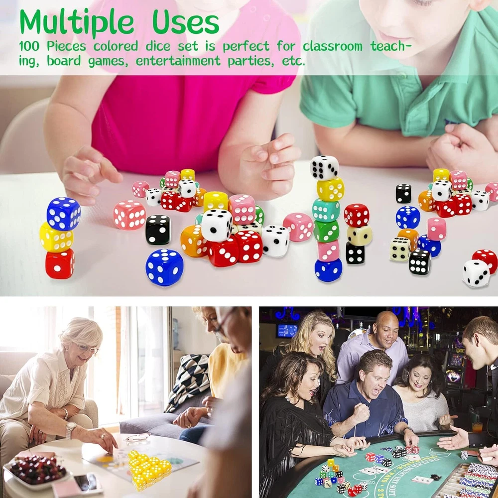 Store New Arrivals Add to Favorite View Feedback Contact 100 Pieces 16MM Dice Set, 6 Sided Standard Colored Dices with Portable Plastic Box, Opaque 10 Colors Games Dice for Board Games, Parties, Classroom Math Bulk Dice Description Age Range Description 14 Brand Name SLSESIN Shape Rounded corners Item Weight 12.8 ounces Theme Party, Teaching Number of Pieces 100 Item Dimensions L x W 0.63"L x 0.63"W Size 16*16*16MM 【Portable Plastic Box】100 pieces of colored dices set, neatly packed in a reusable plastic box with separate compartments for each color, keeping your dice organized and making it easy to store and carry bulk dice. 【Perfect Size and Weight】Our 16 mm (0.63 inches) opaque standard size color d6 dice feature modern rounded corners for easy rolling and the perfect weight for throwing, better than smaller dice. 100-pack colorful game dice would be your wise choice! 【Wide Range of Application】It is the best choice for board games, entertainment parties, a lively atmosphere, and classroom math aids. Available in white, blue, yellow, orange, ivory white, light green, green, black, pink, and red, 10 colors to meet different needs. 【Sturdy Material】Our six-sided colored dice are made of durable acrylic material with a smooth surface, clear points and durability. You can use them over and over again without worrying about fading, wear and tear or scratches. 【Warm Tips】If you have any questions, please feel free to contact us, we will be happy to provide you with quality service! Product Description 100 Pieces 16MM Dice Set This colorful 16mm dice features a rounded design, making it an ideal choice for rolling, stacking and integrating into various board games. These games can help kids develop collaboration and communication skills and provide them with plenty of entertainment and fun. With these brightly colored dice sets, you can easily spend a fun and creative game night with your kids, or make your classroom teaching more lively and entertaining! Let's start a wonderful time together! Lively Party Atmosphere Our set of 10 dice in different colors will brighten up any party, adding a festive and colorful touch to the atmosphere, and creating a warm and cheerful ambiance that everyone will enjoy. With Portable Plastic Box Bulk Dice Our set of 100 color dice is arranged neatly in a durable, reusable portable plastic box, which makes storage and on-the-go entertainment a breeze. Looking for a fun way to add color to your games? Our set of 100 Pieces color dice is your answer! The 100 pieces 6-sided colored dice are ideal for adding some fun to a family game night, birthday party or large event. Package includes: 100 pieces colors dice + portable storage box Colors: white, blue, yellow, orange, ivory, light green, green, black, pink, red, 10 of each color. Standard size: 16 * 16 * 16MM rounded corners opaque color dice Friendly reminder: This product is intended for children aged 14 and up. ABOUT US We offer the best prices around on high quality products. Our E-store includes media such as books, movies, music and games while offering electronics, toys, sporting apparel, clothing, tools, general home, garden items and more. SHIPPING We are always working hard to ensure your package arrives as soon as possible. Please understand that some factors like weather, high postal traffic, and the performance of shipping companies are outside of our control. We offer free shipping to the lower 48 states and ship within 2 business days of payment, usually sooner. We do not accept P.O. Boxes. Please provide a physical address. For shipping outside of the continental USA, we only use eBay's Global Shipping Program.The item is shipped to KY and then sent to the rest of the world. International customers are responsible for all duties and taxes. Continue to check out in order to calculate costs for shipping the item to your country. Messages regarding eBay's Global Shipping Program MUST be directed at eBay EXCLUSIVELY. RETURNS We offer a 30-Day Return Policy on items which you are not completely satisfied with. You have the option for a full-refund or an exchange of the item. No returns are available on items shipped outside of the USA. PAYMENT We accept PayPal. CONTACT US This page content is yet to come Please ad us to your favorite seller and visit again later Thank You CUSTOMER SATISFACTION We try our very best to make sure every customer is completely satisfied. If there's a problem, message us! We're happy to help. If you would like to order more quantitv than shown is available. you are welcome to place one order fox maximum available quantity and place one more order again because we aiwavs have more than shows in available items WE ACCEPT