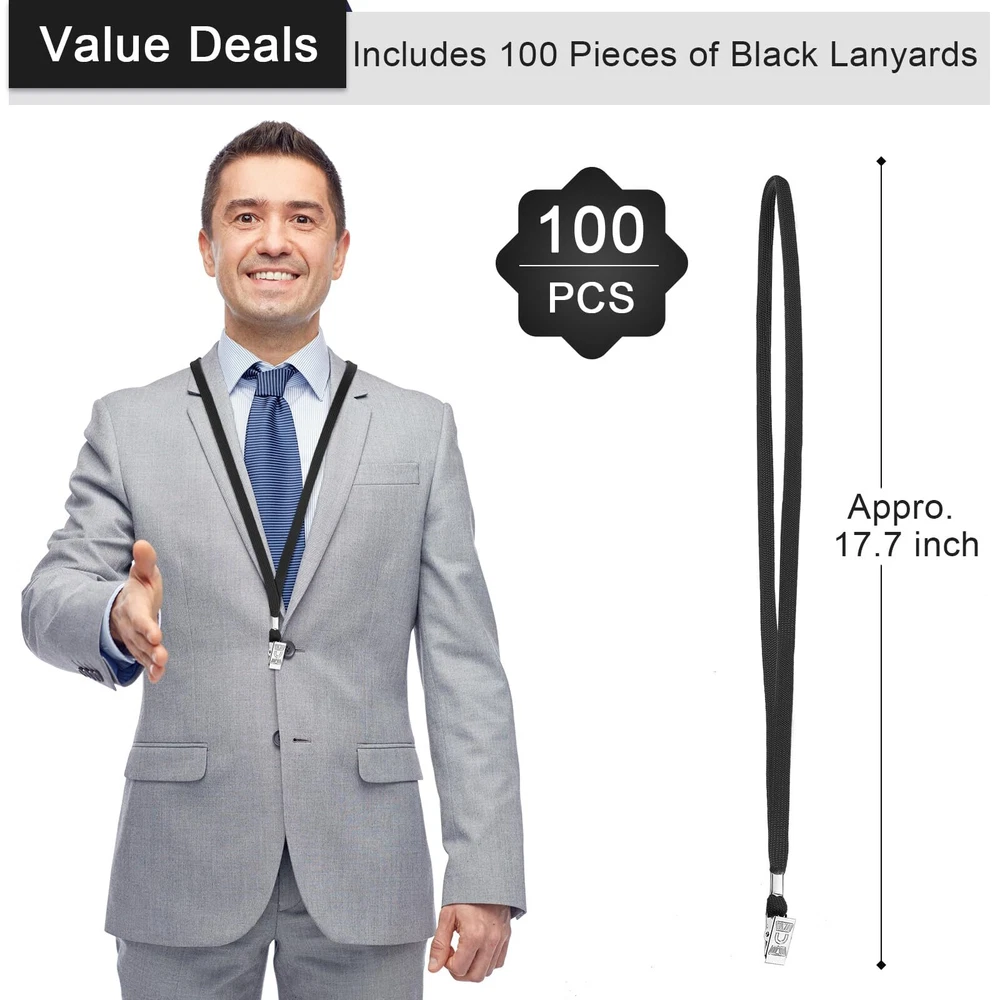 One size fit most: the clip of lanyard is designed with a reasonable size, measures approx. 0.35 inches in width, shoe string style, 31.14 inches in total length (unfolded), fits any ID badge holder on the market, and the neck lanyard can be knotted or looped to adjust its length, suitable for most people, won't rub your neck, kids can use it comfortably What you will get: you will get 100 pieces of flat woven lanyards with badge clip, a tightly woven fabric for a more comfortable feel and nicer look, avoiding the holes and tears caused by pins and clips, sufficient quantity to meet your various demands and you can share them with your friends, classmates and colleagues Quality material: the flat badge lanyards are made of quality cotton, silky-soft and lightweight, causing no irritation to your neck, comfortable to wear for extended periods, badge clips adopt quality metal, detachable quick release when tugged, easy to snap together to refasten, easy to clip for stuff with lanyard port or hole Wide range of use: the swivel hook clip lanyard can liberate your hands and help you carry key, ID, badge, name card holder and other lightweight items that are frequently needed daily, bringing you more convenience Multiple occasions: the badge lanyard with clip not only meet your daily needs, but also can be applied as a useful and thoughtful gift to nurses, doctors, teachers, classmates, waiters, etc.; It is light and compact, and can be worn comfortably for a long time