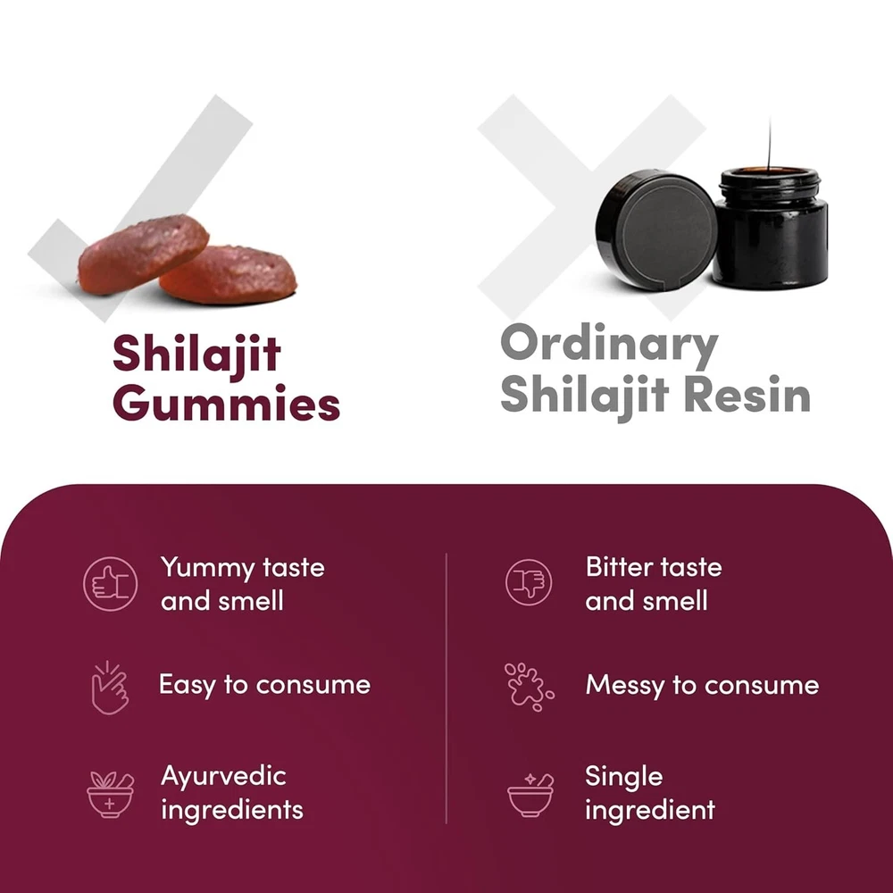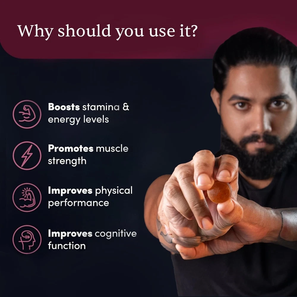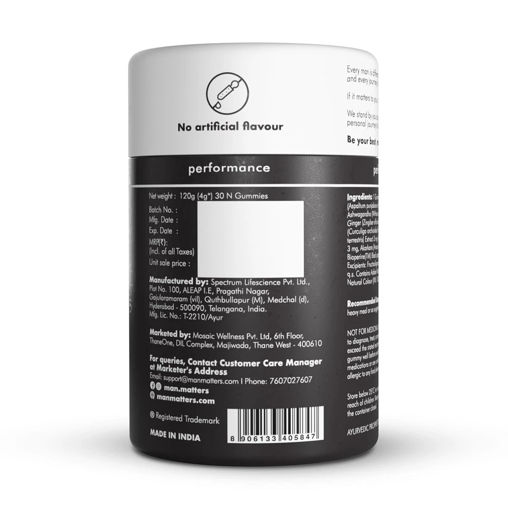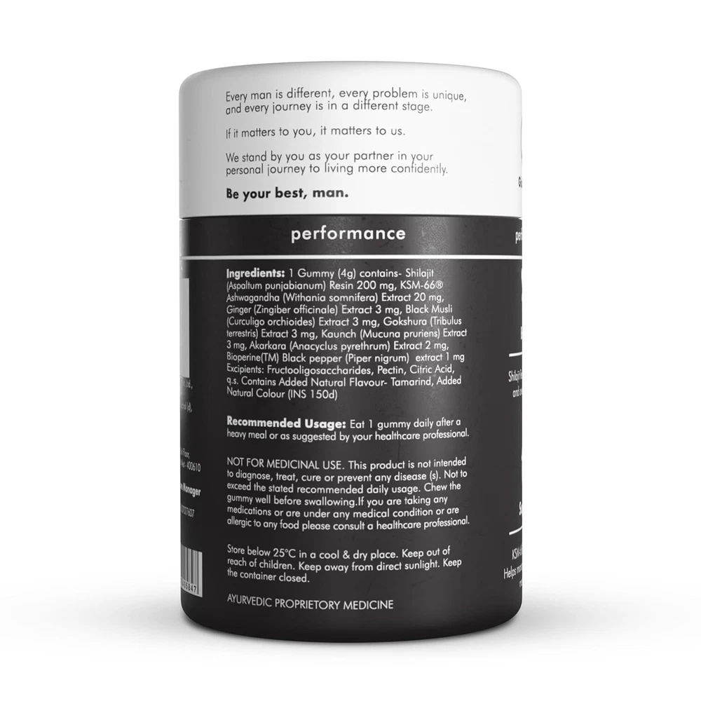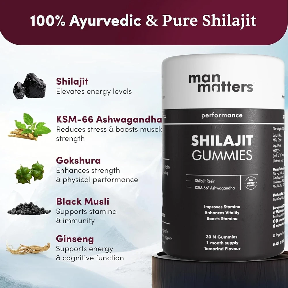 About this item Introducing: Man Matters Shilajit Gummies, your go-to solution for enhanced stamina and energy levels. Packed with natural ingredients & carefully curated to elevate your overall well-being, these gummies are designed to optimize your physical and cognitive functions, ensuring you stay at the top of your game. Why To Use: Man Matters Shilajit Gummies are power-packed with Shilajit, KSM-66 Ashwagandha, Black Musli, Gokshura, and Ginseng, our gummies redefine what it means to thrive. Boost performance, stamina, muscle strength, and cognitive function – all in one delicious bite! What Makes it Work: Harnessing nature's best, These gummies blend potent ingredients for maximum impact. No added sugar, gluten-free, and without any artificial flavors – just pure effectiveness with every chew. How To Use: Have 2 gummies daily after a meal.