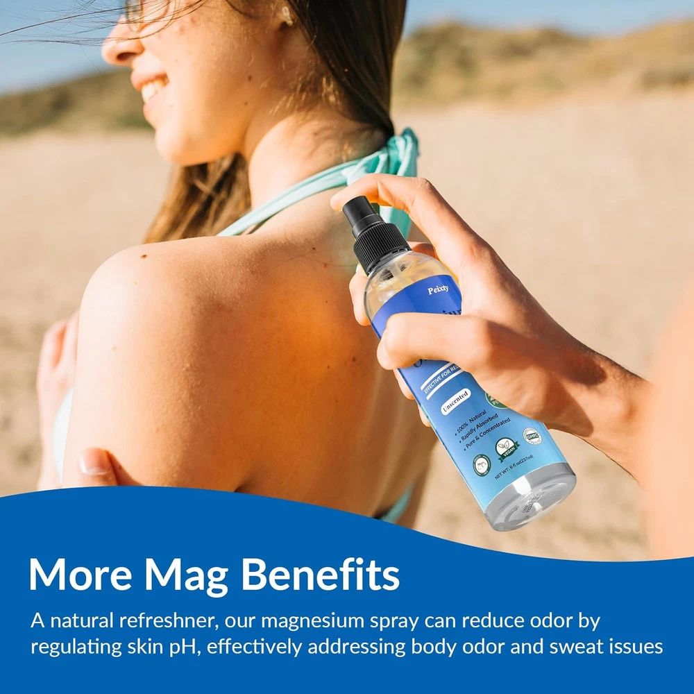 From Zechstein Seabed: Our topical magnesium oil spray is derived from the chloride of magnesium saltwater in the Zechstein Seabed, known for its exceptional purity, assuring you of unparalleled quality. Scientific Formula: Our organic natural magnesium oil spray is easy to apply, comfortable, and non-greasy, so it won't stain your clothes or sheets. It's vegan-friendly and preservative-free. Our 8-ounce magnesium oil delivers 25mg of elemental magnesium with each spray. Fast Magnesium Absorption: Our prue magnesium oil spray allows for localized magnesium intake, with the magnesium being directly absorbed through the skin for faster results. Using for post-workout and before bed. Portable Convenience: Easily pop it into your carry-on bag, ensuring you won't miss a beat of your health routine whether you're traveling, hiking, or participating in sports. How to Use: Spray 3~4 times on problem areas or onto the soles of your feet and thoroughly massage until fully absorbed. Persistent use over time will yield better results. Product Description