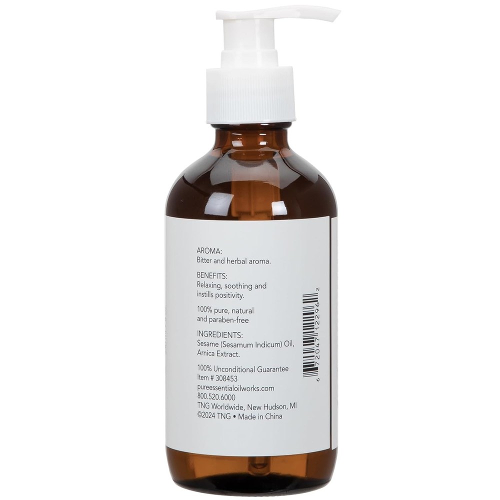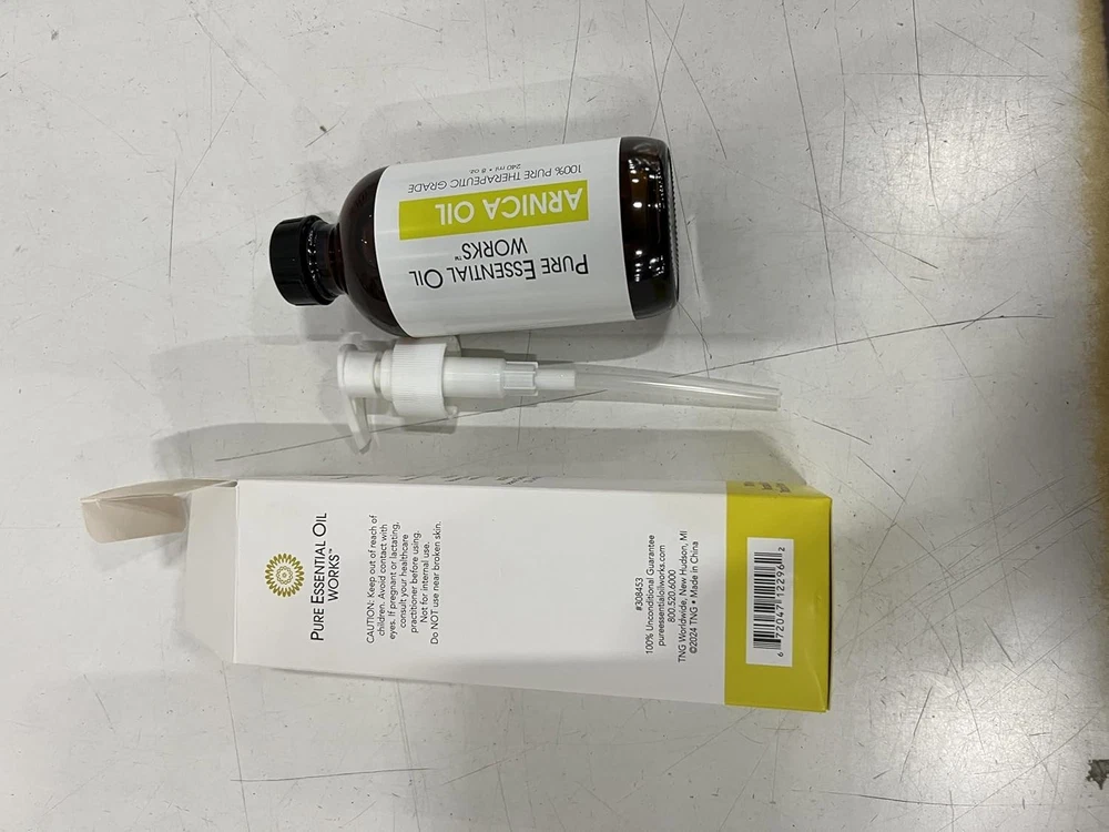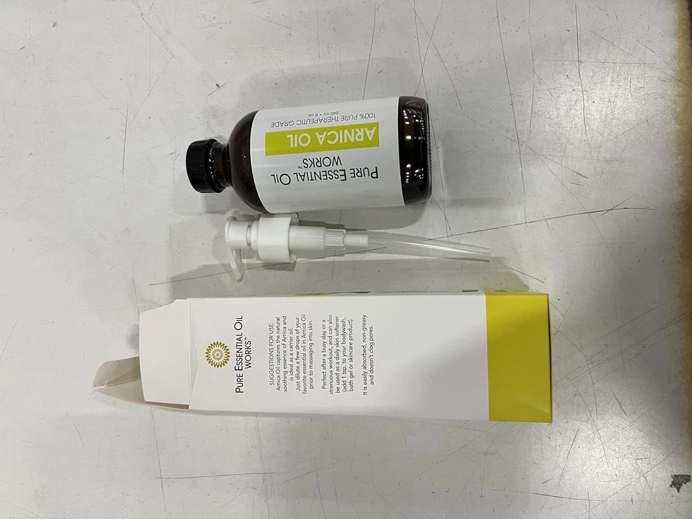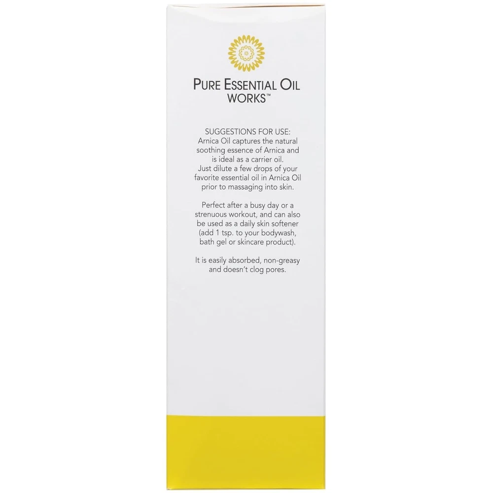 Arnica Oil, 100% Pure, Natural, Paraben-Free, 8 Ounces Product Details Product Dimensions : 2.4 x 2.4 x 5.6 inches; 8 ounces Manufacturer : TNG Worldwide Country of Origin : India Brand: Pure Essential Oil Works Scent: Arnica Oil Item Form: Oil Material Feature: Natural Number of Items: 1 Pure Essential Oil Works Arnica Oil is perfect to use after a busy day or a strenuous workout, and can also be used as a daily skin softener. All-Natural Arnica Oil: Paraben-free. Grade Oil: This paraben-free oil can be used in any shampoo, conditioner, body wash, bath gel or other skin care product. It is a oil that relaxes, soothes and instills positivity. Massage Oil: Arnica Oil captures the natural soothing essence of Arnica & can be used as a massage oil. It has to be diluted with any of your favorite essential oils prior to massaging into skin. Arnica Oil Aroma: This natural Arnica Oil has a bitter and herbal aroma. It is easily absorbed, non-greasy & doesn’t clog pores.