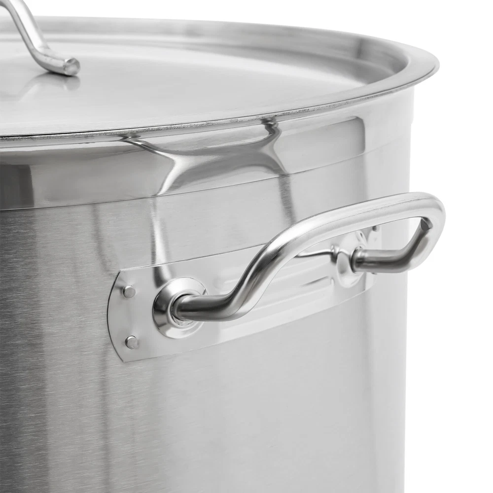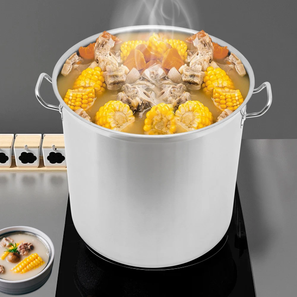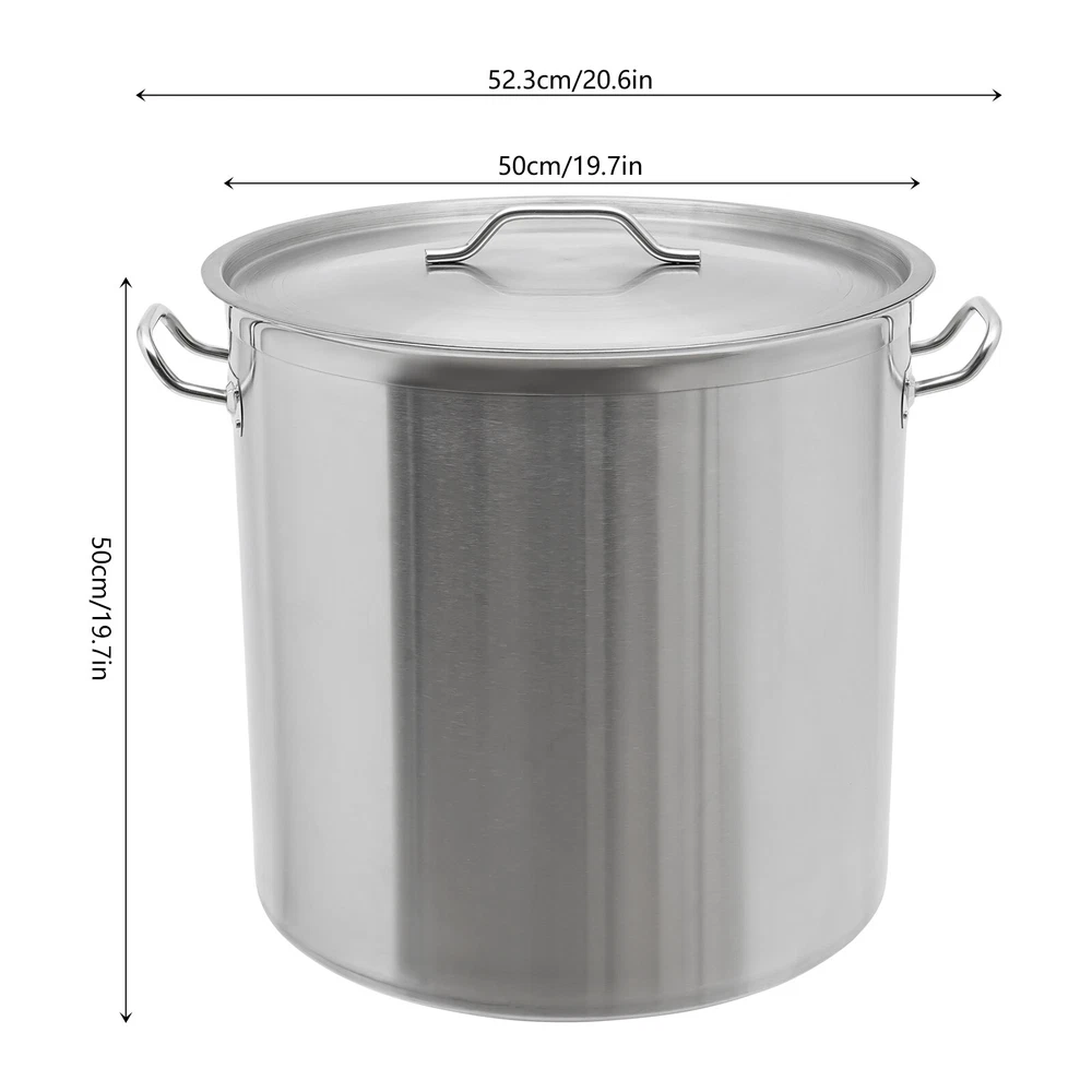 This massive 100-quart stainless steel stock pot is a game-changer for large-scale cooking! The sturdy construction with welded/sanded joints feels premium, and the thick aluminum base ensures even heat distribution. I love how it fits perfectly on commercial stoves - no more struggling with multiple batches. The lid seals tightly to retain heat and moisture, perfect for soups, stocks, or boiling seafood. Despite its huge capacity, the ergonomic handles make it surprisingly manageable. The polished finish looks professional and cleans up easily. Ideal for catering, restaurants, or big family gatherings!