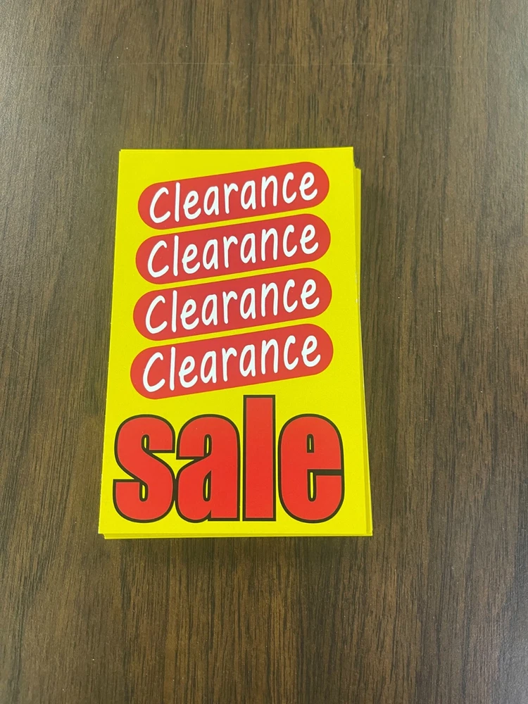 RETAIL STORE Clearance Sale PRICE CARDS- DISPLAY CASE & SHELF SIGNS 3.5"W x 5.5" H Use throughout your retail, drug, hardware, wine, spirit and grocery stores. Great for items that are limited quantities, closeouts or discontinued products. Can also be used in boutiques, delis or bakery shops. Coated Card stock 100 pieces per pack 6% Sales Tax for PA Customers