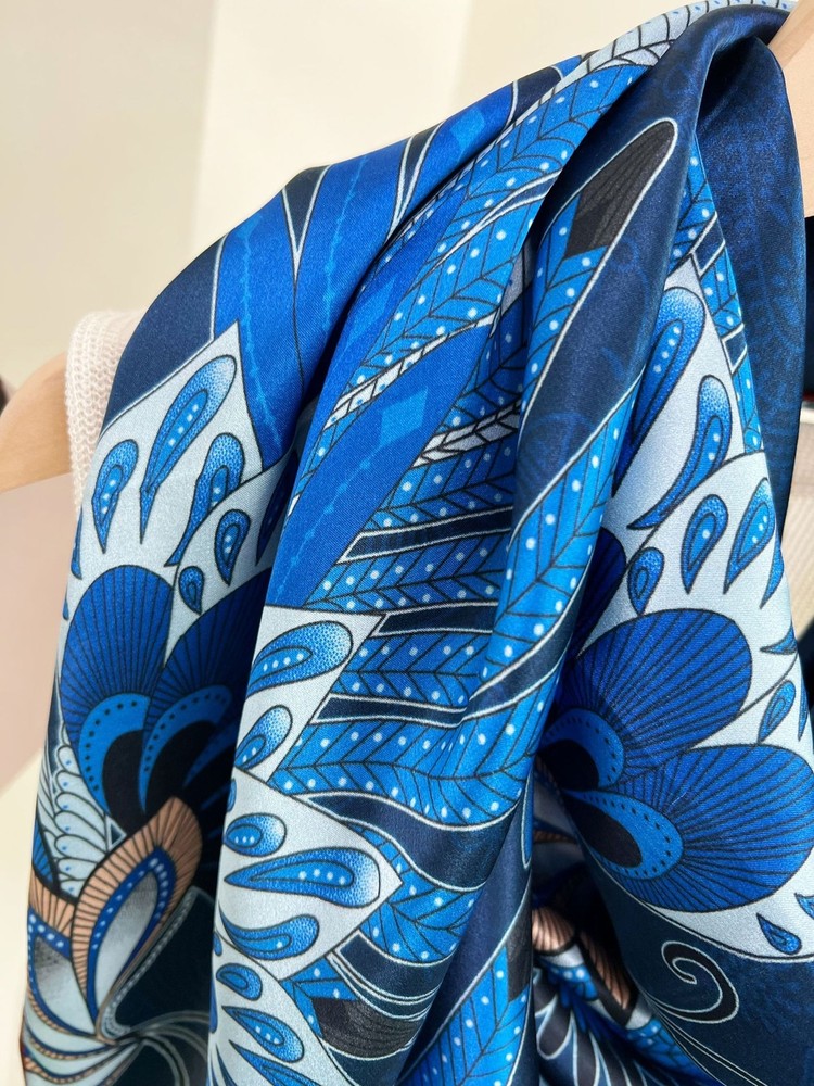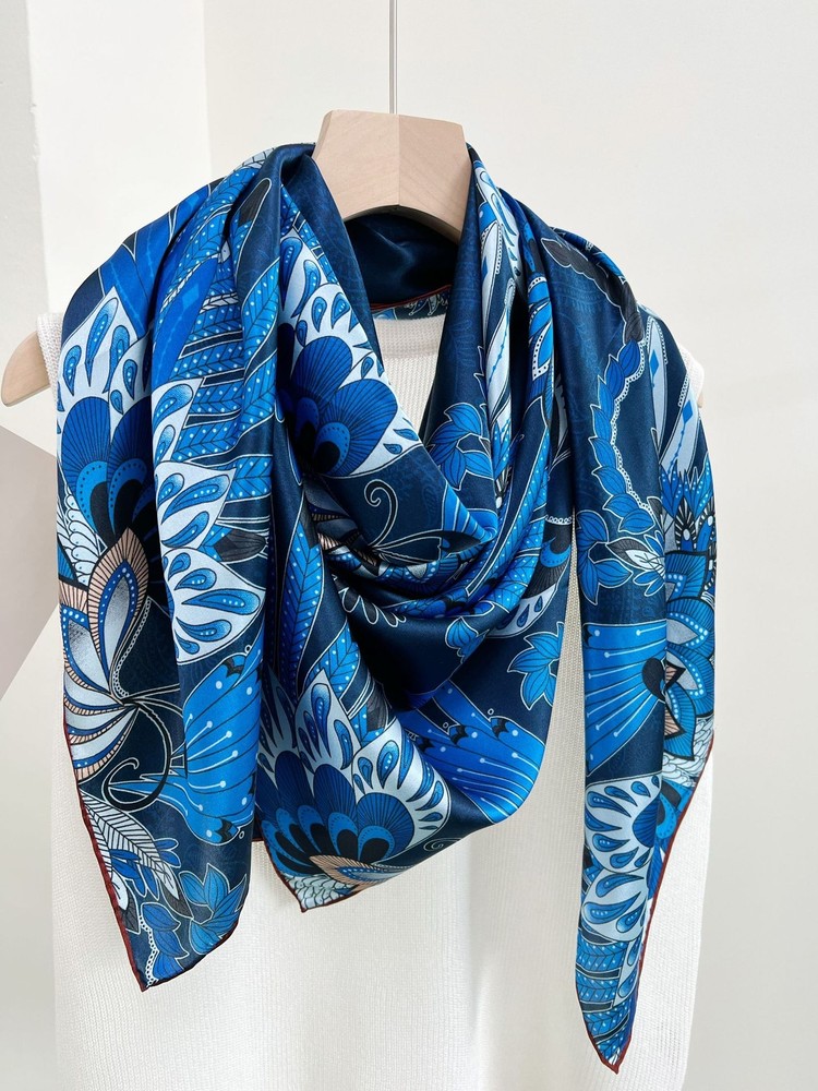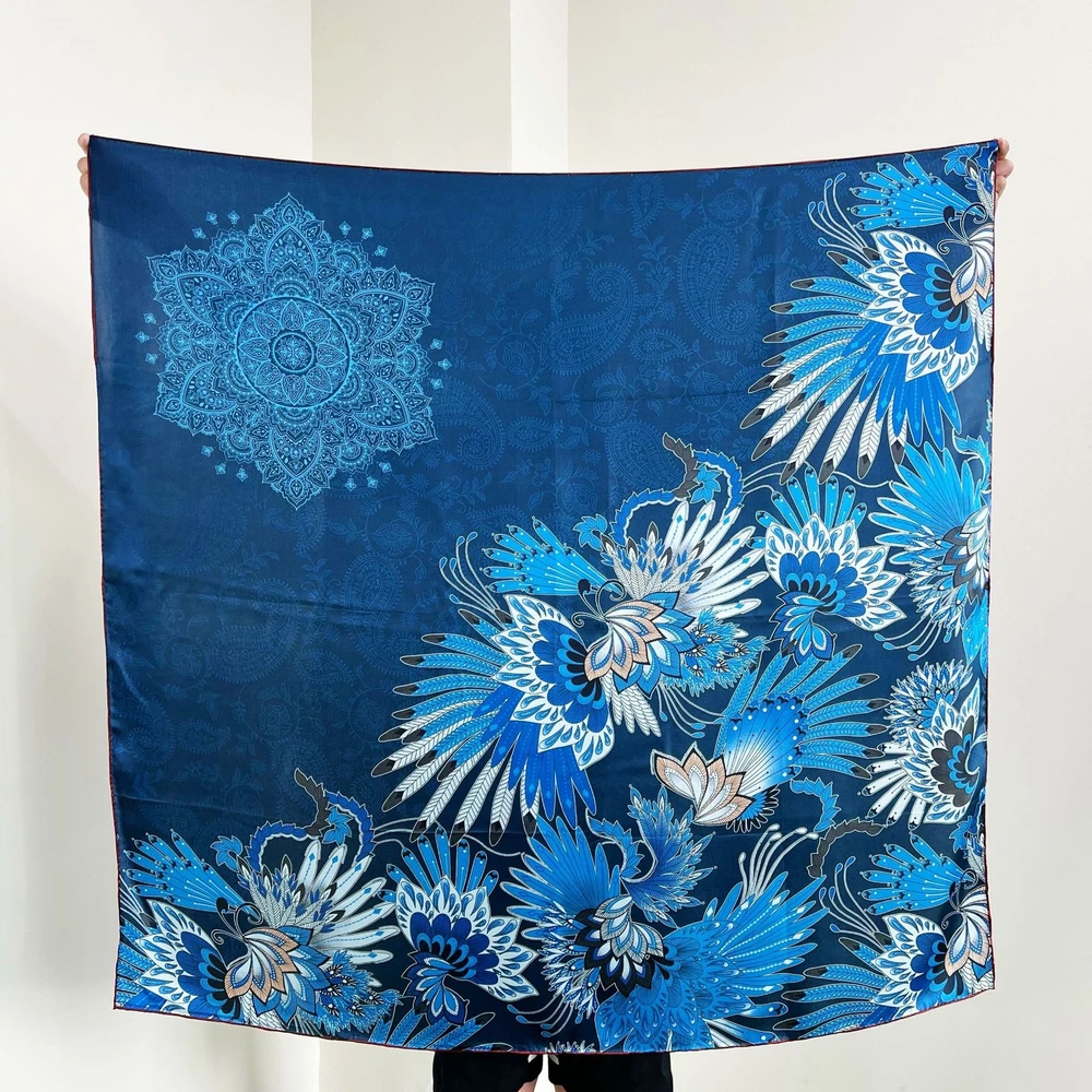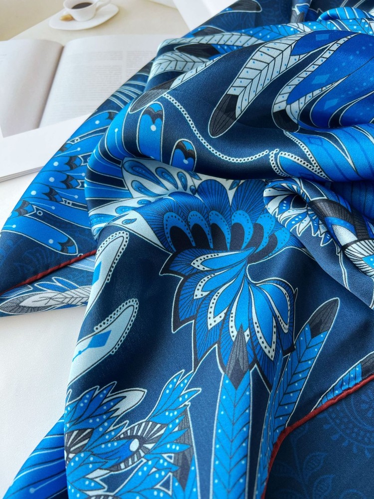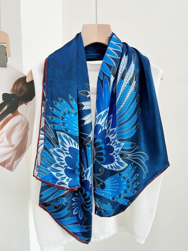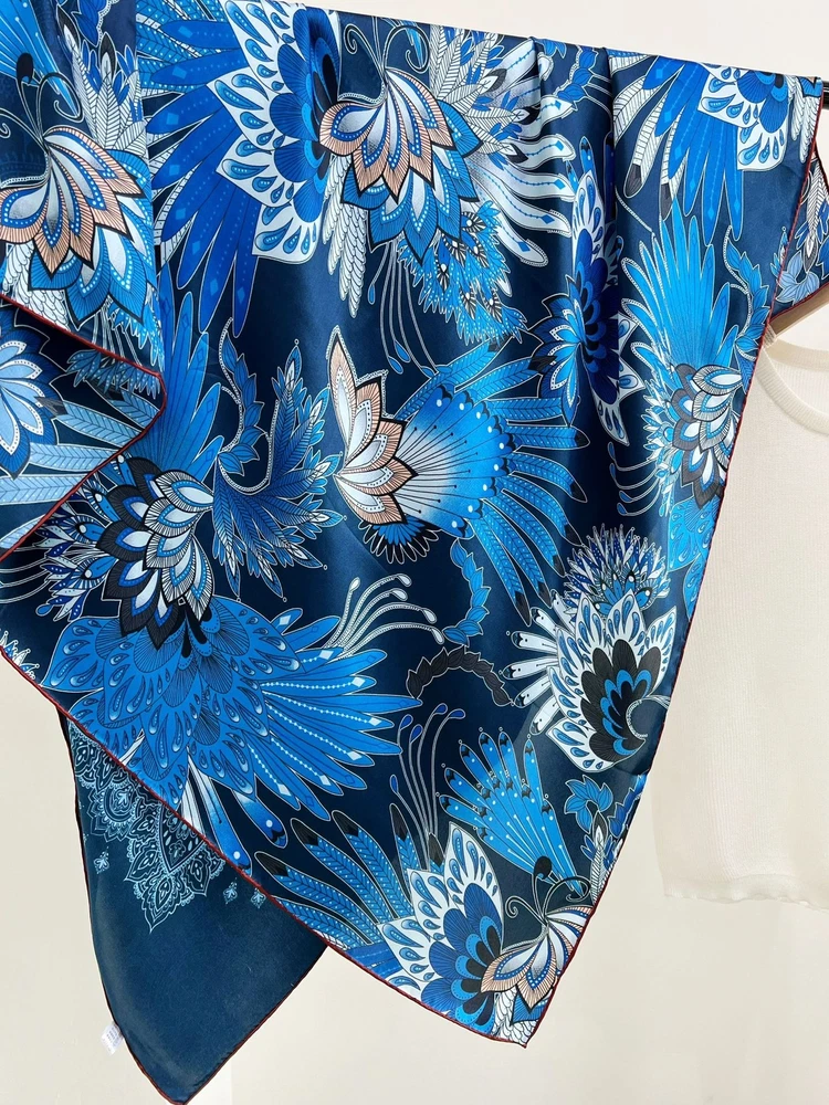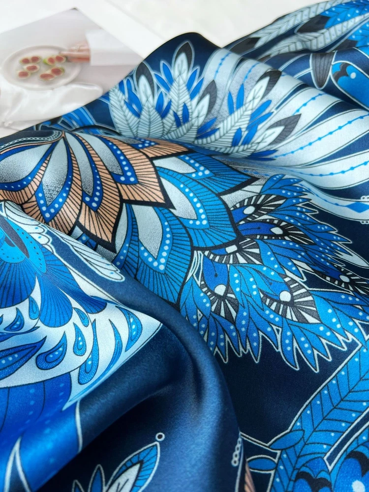 100% Silk 12 Momme Blue Feather Print Square Scarf Shawl 43x43 Inches