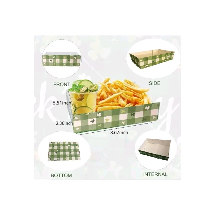 Abundant st. Patrick’s day disposable trays: the package contains 100 pieces of St Patrick's Day food boats disposable bulk, and the quantities are sufficient for you to prepare some delicious food for your mates and families at St Patrick's Day party, easily meeting your party and use needs Classic St Patrick's Day Theme: the snack tray party is printed with assorted beautiful St Patrick's Day elements and colors, such as shamrocks, hats, plaid patterns and more, making the picnic tray more adorable and can match with your St Patrick's parties well. Wide application: the Irish food trays disposable are appropriate to hold snacks and drinks, french fries, hot dogs, popcorn, candies, fruits, salad, beers and so on, making them look more yummy and adding more st. Patrick’s day party vibes on St Patrick's Day Material: these st. Patrick’s day party supplies are made of food grade paper, the Irish shamrock paper french fry boats are solid and not easy to break or fade. 100 count , Size 8.67 L x 5.51 W x 2.36 H" , thick enough to prevent spillage and well printed,both kids and adults will like them. Applicable Occasions: the disposable hot dog trays are great for many important events, such as St Patrick's themed parties, Irish activities, traditional festivals, holidays, carnivals, movie theaters, family gatherings, picnics and so on, which are a fabulous addition to party celebration.