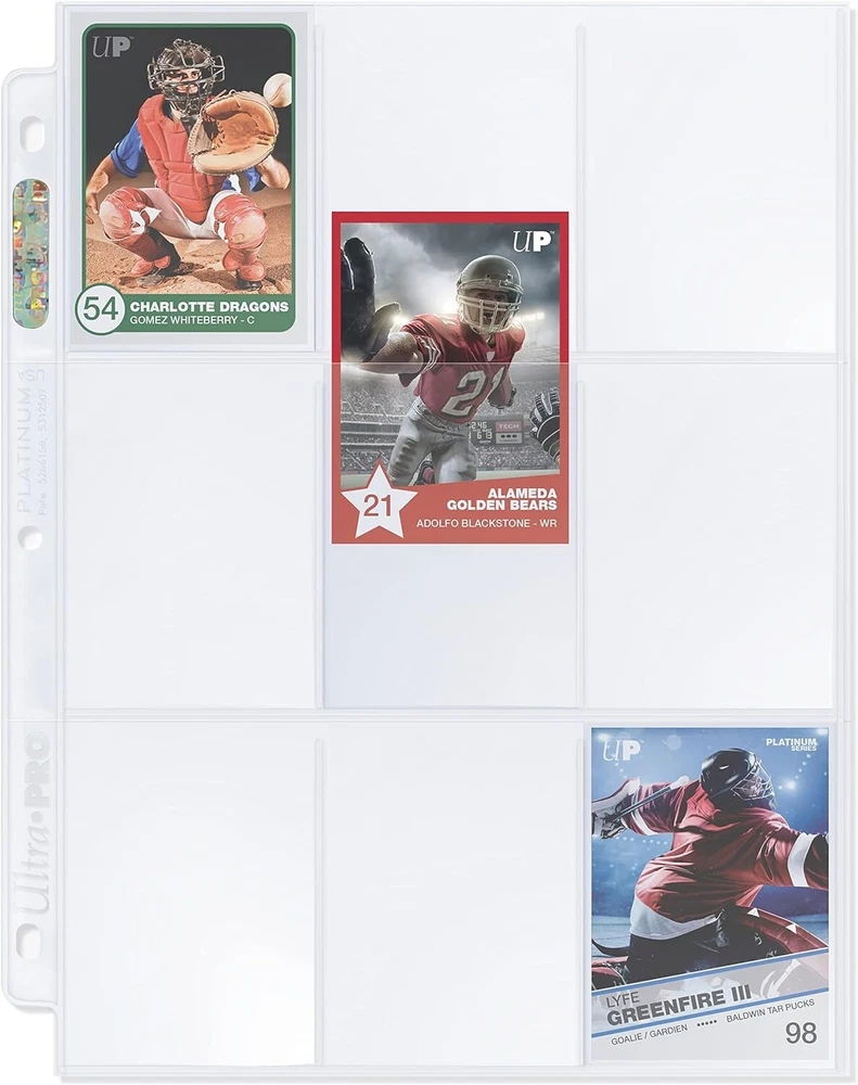 100 ULTRA PRO PLATINUM 9-POCKET Card Pages Sheets Protectors 1 box 209D baseball New in factory sealed retail package - 1 box (100 pages) of ULTRA PRO PLATINUM 9-POCKET PAGES! The standard in safe storage. Protect and show off your collection with these high quality pages! One page holds 9 standard sized sports, trading or game cards up to 2.5 inches x 3.5 inches Also great for artists to archive and display sketch cards, ideal for sticker cards, coupons and other collectibles. 3 Hole Design - fits standard ring binders (ring binder is not included) Top loading pockets Super strong seam welds to prevent pocket separation and improves lay-flat quality Heavy weight crystal clear polypropylene material Acid and PVC free Provides UV protection Each page bears Ultra PRO's hologram quality & authenticity seal on the spine Made in US Stock# 81320 UPC 074427813208 Thank you so much for supporting my small business! All Items listed are in my possession: Chicago, IL, United States of America Please see all photos as they are considered a complete part of the description and condition of the item listed. Please feel free to ask questions prior to purchasing I promise Speedy fast shipping I welcome any questions that you may have. Wishing you good health. Thanks Feedback Please leave me feedback for your order, as I will for you! I greatly appreciate positive feedback It helps to grow my business.