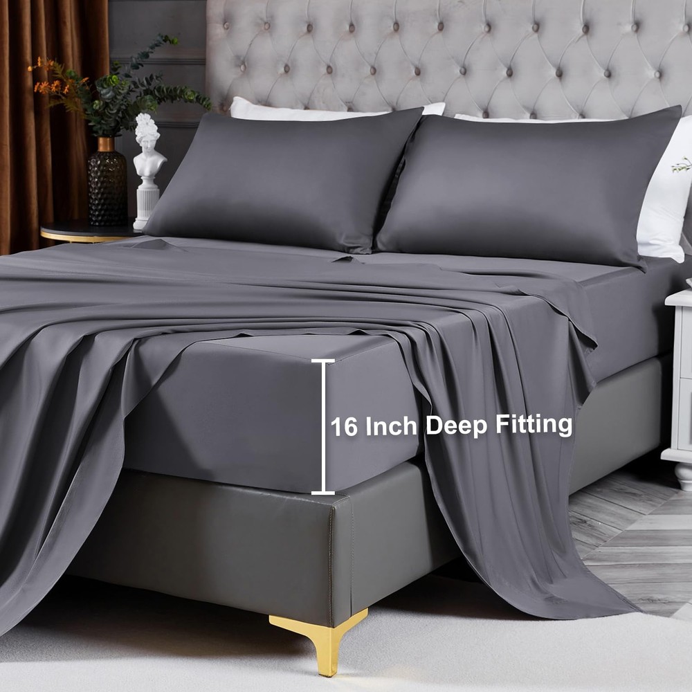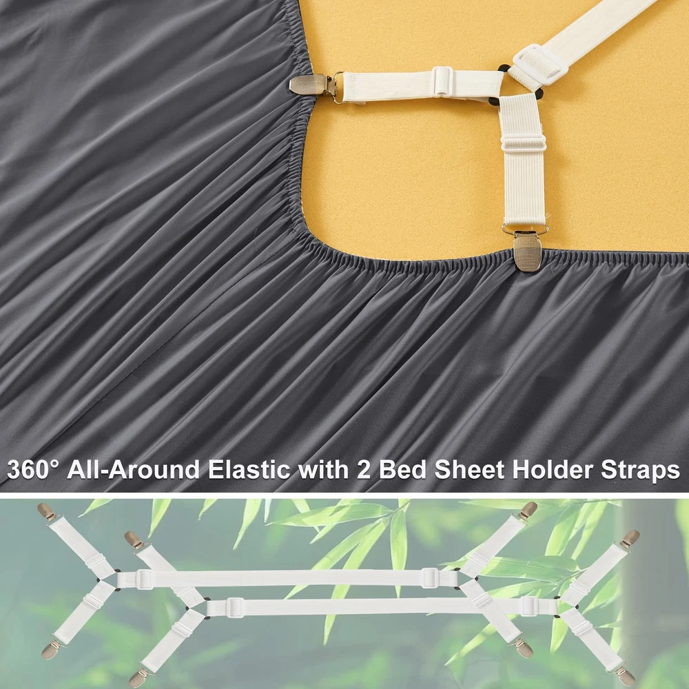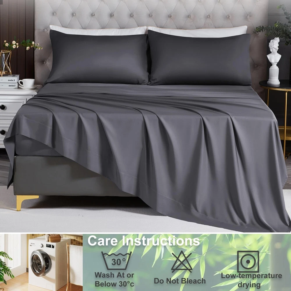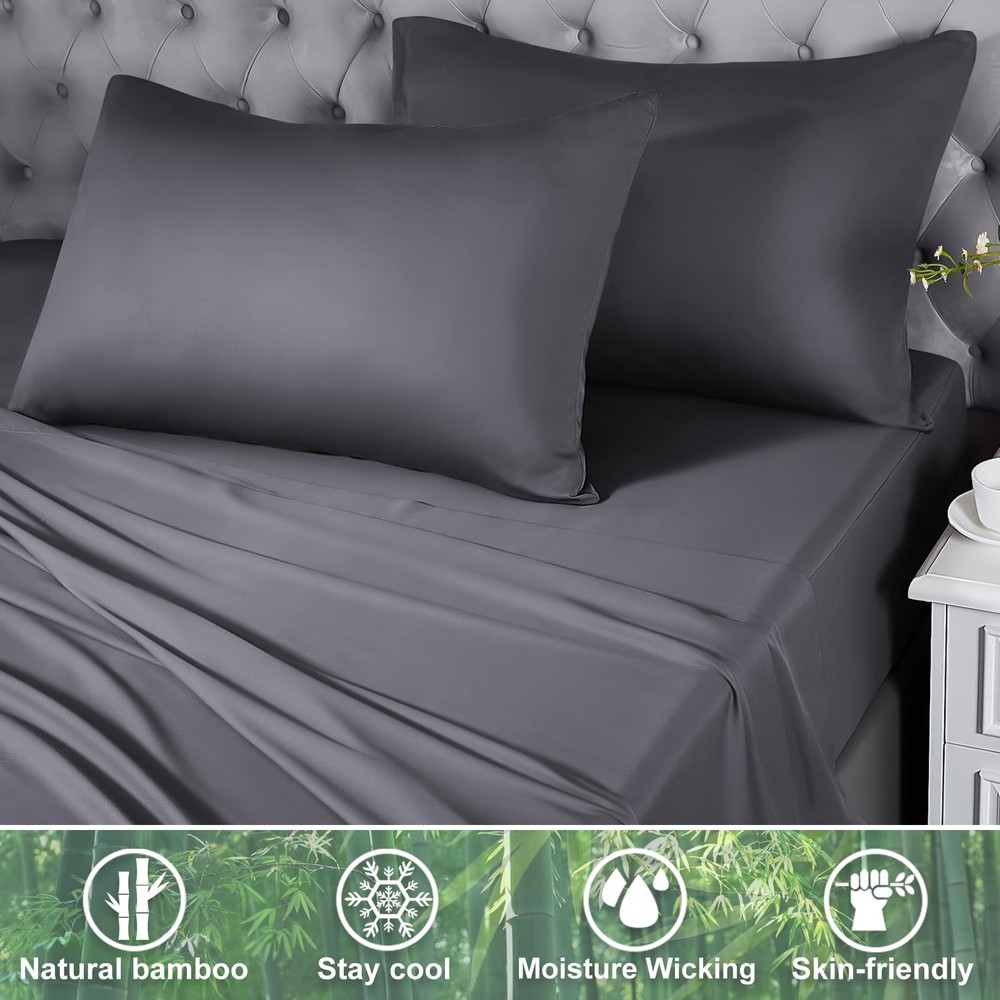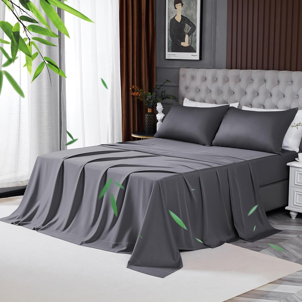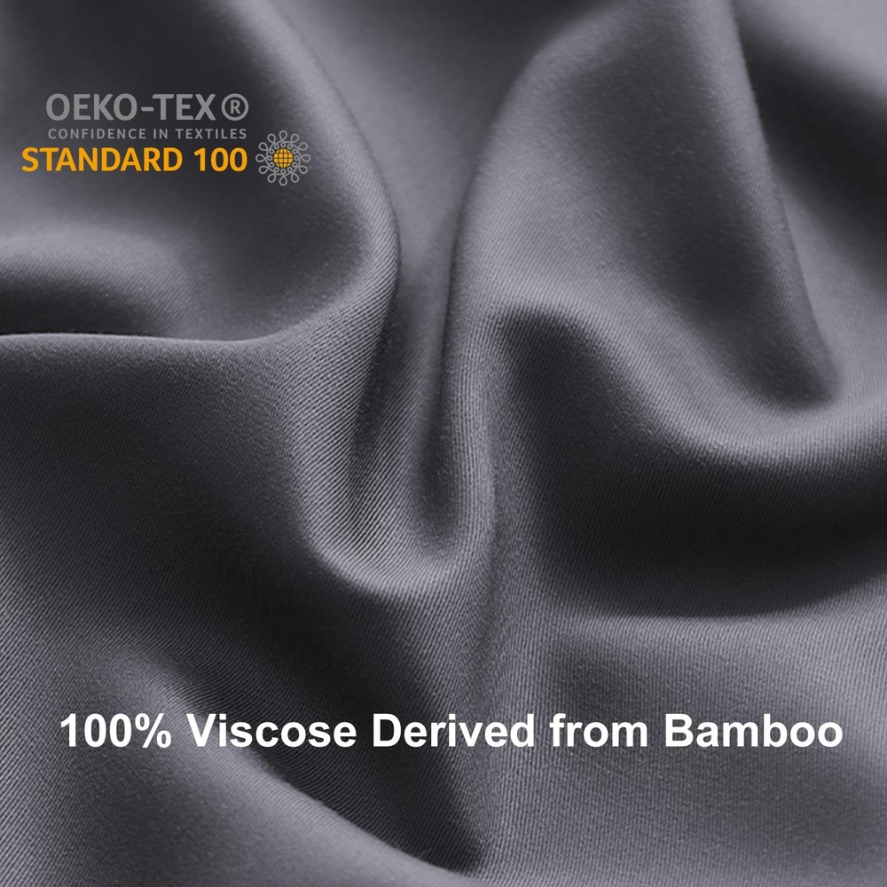 100% Viscose Derived from Bamboo Cooling Sheet Set Package Included: 2 Pillowcases(twin size only 1), 1 Fitted Sheet, 1 Top Sheet Package Includes: 1 top sheet, 1 fitted sheet, and 2 pillowcases (twin size only 1) 100% Viscose Derived from Bamboo Fabric: Crafted from viscose derived from bamboo in a 400TC weave; no synthetic polyester. Offers a silky-soft feel and luxurious comfort for restful sleep Cooling and Breathable: This fabric offers thermoregulatory and moisture-wicking properties, keeping you cool, dry, and comfortable all night, ideal for hot sleepers and night sweats Deep Pocket: Fits mattresses up to 16 inches thick with an all-around elastic band and 2 holder straps for a snug fit Care Instructions: Wash the new sheet set before use to remove wrinkles or odors. Use a gentle, bleach-free detergent in cold water on a delicate cycle. Avoid soaking, and air dry or tumble dry on low heat, removing promptly to prevent wrinkles