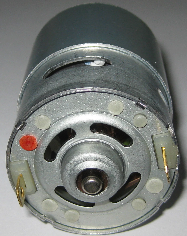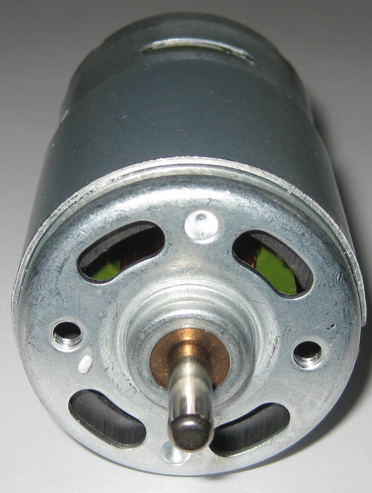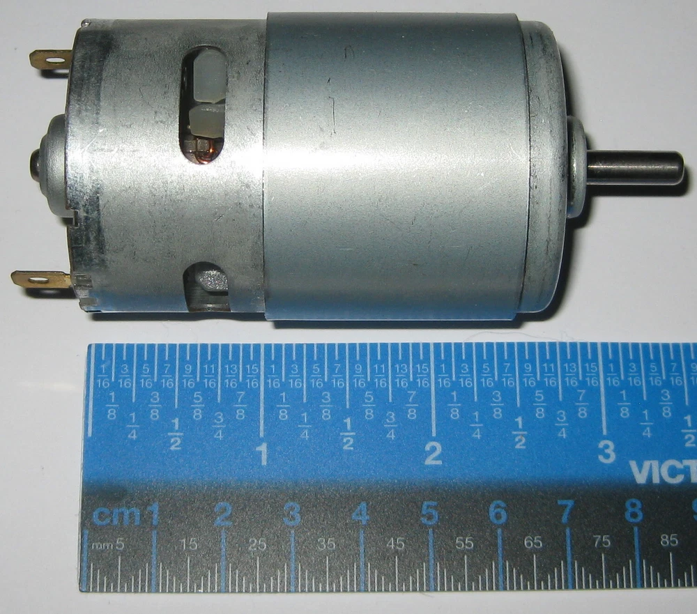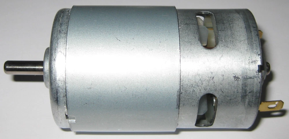 100 Watt Electric 12 VDC Motor w/ Fan - 15,000 RPM - 775 Frame Size Robot High Speed DC Motor RS-775SH DC electric motor Operates on 12 VDC nominal No load speed: 15,000 RPM No load current:2.1 A Rated load speed: 13,000 RPM Rated load current: 11.3 A Rated load torque: 716 g-cm (70 mNm) Output power: 100 Watts Stall current @ 12 VDC: 78 A Stall torque: 5,639 g-cm (553 mNm) Leaf brushes Round shaft dimensions: 14 mm L x 5 mm Diameter Dimensions (not including shaft): 67 mm long x 44 mm diameter Ideal for robotics, propulsion, and any other project requiring high speed motors Can be operated in either direction, simply reverse power supply polarity Weight: 11.8 oz (334 g) Comes with solder eyelets for power connection Built-in fan for cooler operation Intermittent duty Two threaded (M4 x 0.7) mounting holes on 29 mm diameter in drive end face 3 pole armature