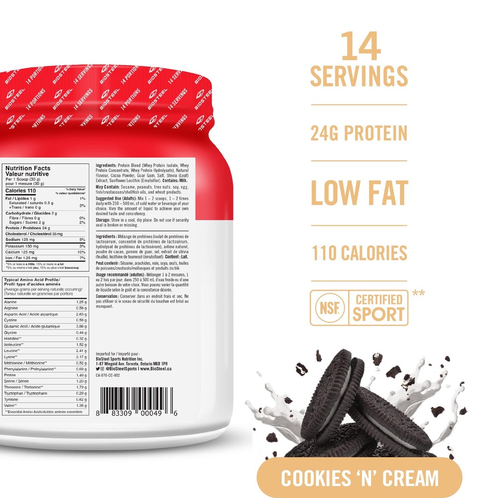 Introducing the 100% Whey Protein in a delectable Cookies & Cream flavor, meticulously crafted to cater to the nutritional needs of the discerning athlete. Each serving delivers 24g of pure, high-quality whey protein hydrolysate, making it an exemplary choice for those seeking the best protein powder for men. This premium powder protein is designed to enhance recovery and build strong muscles, ideal for post-workout nourishment and muscle recovery. 's whey protein powder is NSF certified for sport, ensuring that it meets the highest standards of quality and purity. Our commitment to excellence is reflected in our choice of ingredients, including non-GMO protein powder, making it a trusted protein powder for athletes. This low-carb protein powder is also sugar free, sweetened naturally with stevia, and contains no artificial flavors or colors, delivering a clean and effective protein shake powder option. Our whey protein isolate is rBGH hormone-free, emphasizing our dedication to offering a protein supplement that supports your health and fitness goals without compromise. The vanilla whey protein powder boasts an amino acid-rich profile, including leucine, which is vital for repairing body tissues and promoting muscle recovery. With 14 servings per container, this low-calorie protein powder offers convenience without sacrificing quality. 's protein powder whey is soy-free, gluten-free, and low-fat, making it an ideal choice for those with dietary restrictions. The raw protein powder is formulated to be easily absorbed, ensuring that the amino acids quickly reach the muscles for optimal recovery and growth. Whether you're a professional athlete or a fitness enthusiast, this protein powder isolate stands out as a top-rated whey protein choice, delivering unmatched performance and results. Sugar Free Protein Shake Powder: Indulge guilt-free with our Cookies & Cream protein shake powder. This sugar free formula is crafted for pro athletes, ensuring a clean energy boost without compromising on taste or nutrition. Whey Isolate for Enhanced Recovery: Our Cookies & Cream whey protein powder features high-quality whey isolate, offering 24g protein per serving. This raw protein powder is designed to support muscle recovery and repair body tissues post workout. Low Carb Protein Powder: Specially formulated for fitness enthusiasts, this low carb protein powder is perfect for those seeking a lean, low-calorie protein powder option, without sacrificing flavor or performance. RBGH Free and Non-GMO: Choose a healthier option with our rbgh hormone-free and non-gmo protein powder. This soy free protein powder ensures you receive pure nutrition, free from artificial additives or GMOs. Whey Protein Hydrolysate for Athletes: Elevate your performance with our whey protein hydrolysate, a top rated whey protein. Designed as the best protein powder for men, it's an ideal post workout formula to fuel and recover. Non-GMO