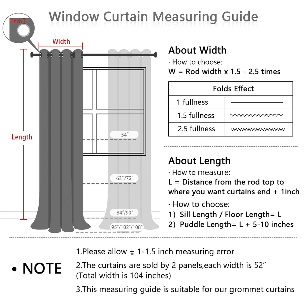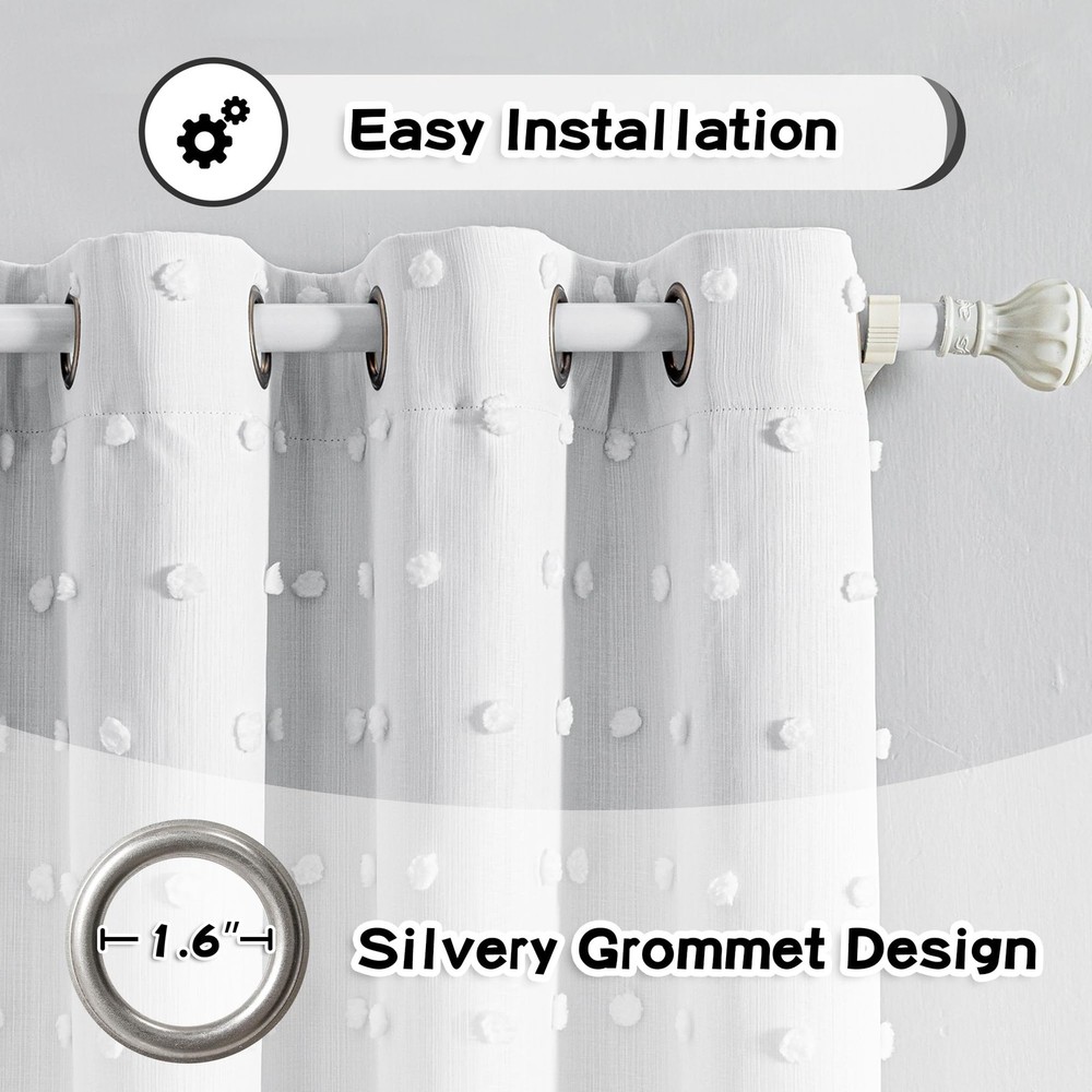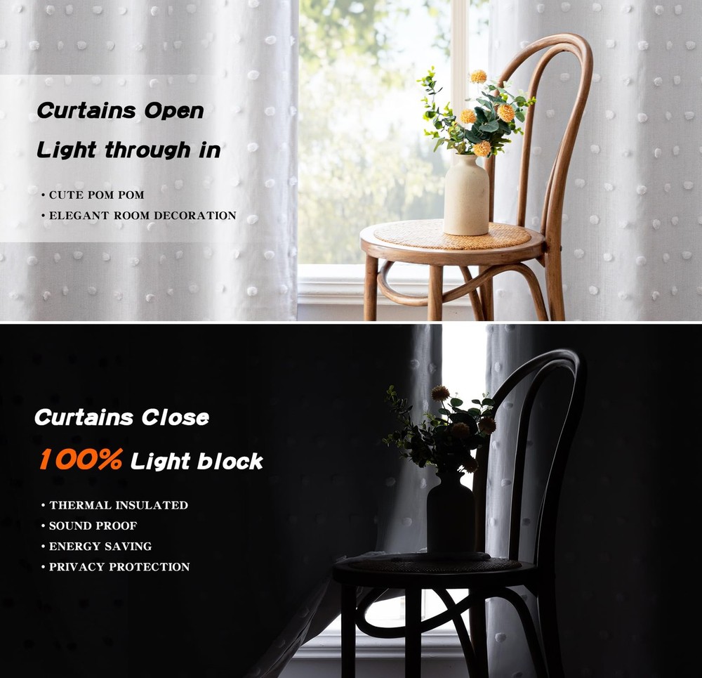 100% Blackout Curtains for Living Room Bedroom Pom Pom Sheer Curtains Grommet 2 Layers Sheer and Curtains Sets Basic Information: 2 panels of 100% blackout curtains with pom pom sheers, each panel measures 52 Inches wide by 84 Inches long, total 104 inches wide. 100% Blackout Curtains: These curtains can effectively 100% block out light and insulate thermal, making them perfect for use in girls room, kids room, nursery, boys room, living rooms or bedrooms or anywhere you need darkness and privacy. Unique Design:These cute pom poms combine bohemian elements with modern style. The white sheer curtain is embellished with cute pom poms, adding interest, glamour and a beautiful look to your windows. Easy to Install: These blackout curtains are relatively lightweight and can be easy for you to install. The curtains are designed with Grommets, making them easy to slide and distribute the weight of curtains evenly. Easy To Care: This curtain is easy to clean, both machine and hand washable. Please do not bleach, tumble dry low, iron on low heat if needed.